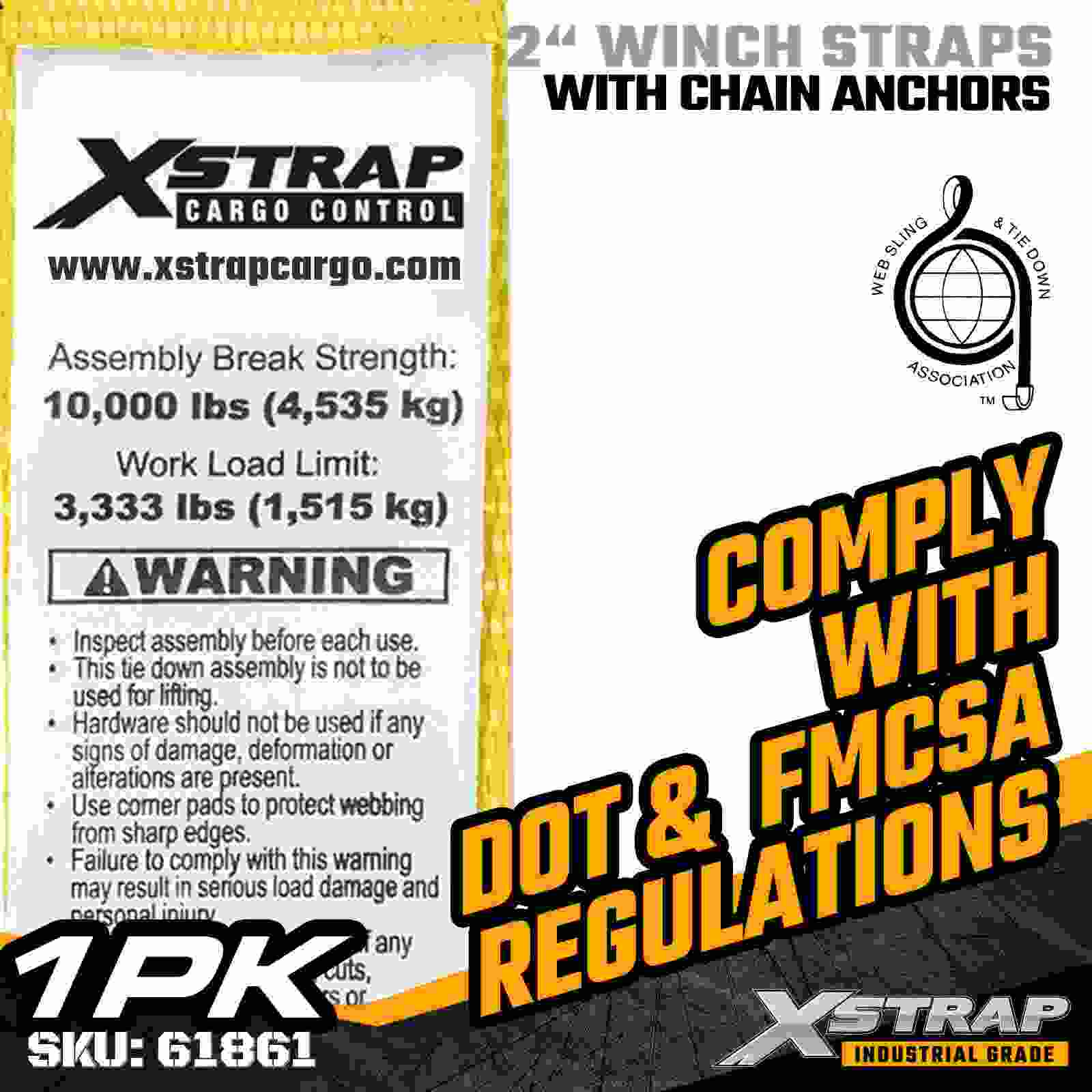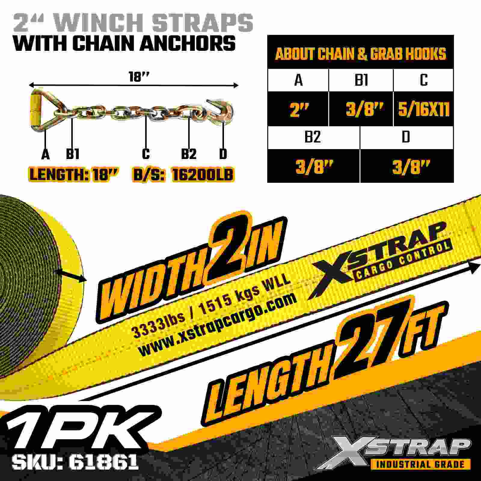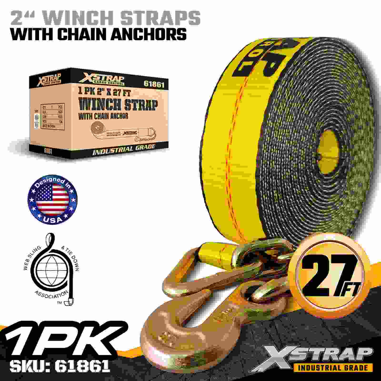Štandardný navijakový popruh Xstrap 61861 2" × 27 stôp je skonštruovaný pre spoľahlivé zaistenie nákladu na plošine, obsahuje odolné reťazové kotvy a vysokopevnostné polyesterové popruhy. S limitom pracovného zaťaženia 3 333 libier a pevnosťou v pretrhnutí 10 000 libier poskytuje spoľahlivý výkon pre každodennú nákladnú a bežnú prepravu nákladu, prepravu nákladu, prepravu nákladu, prepravu nákladu.