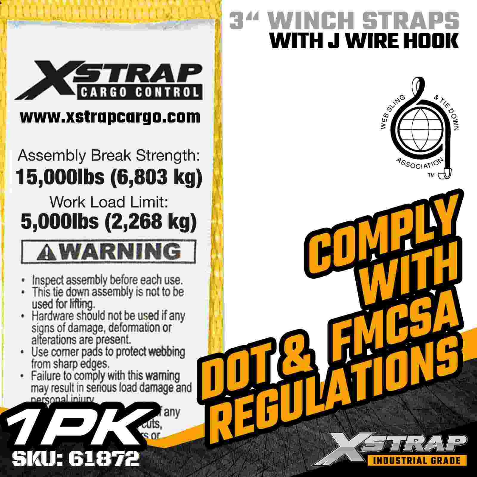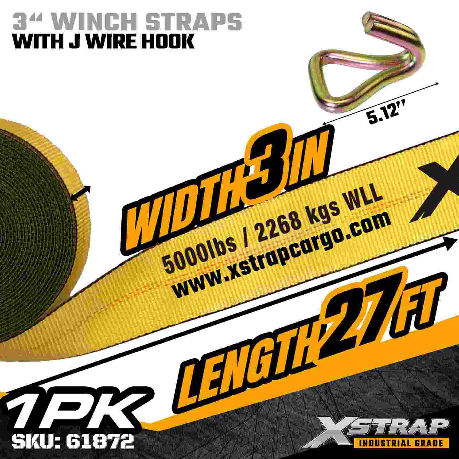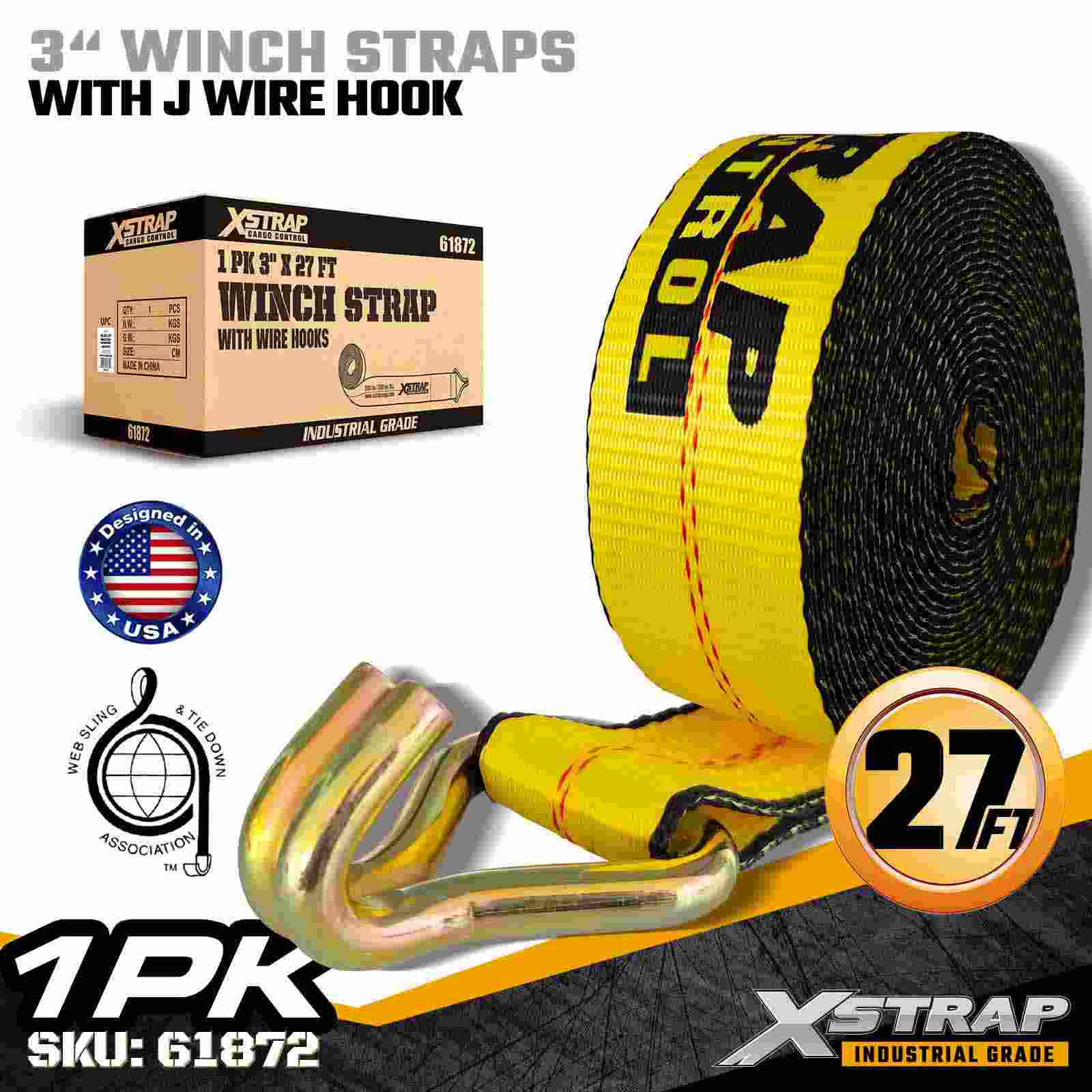 Xstrap 61872 3" × 27 stôp štandardný popruh na navijak je riešenie na zabezpečenie nákladu pre veľké zaťaženie určené pre valníkové prívesy a priemyselnú prepravu. Tento 3-palcový popruh na navijak je vybavený zosilneným drôteným hákom a extra širokým 3-palcovým polyesterovým popruhom, ktorý poskytuje 5 000 lbs Working Load Limit00re Hooklbs, flexibilný dizajn. možnosti, vďaka čomu je ideálny pre operátorov, ktorí potrebujú rýchle a všestranné spojovacie body počas každodennej prepravy.