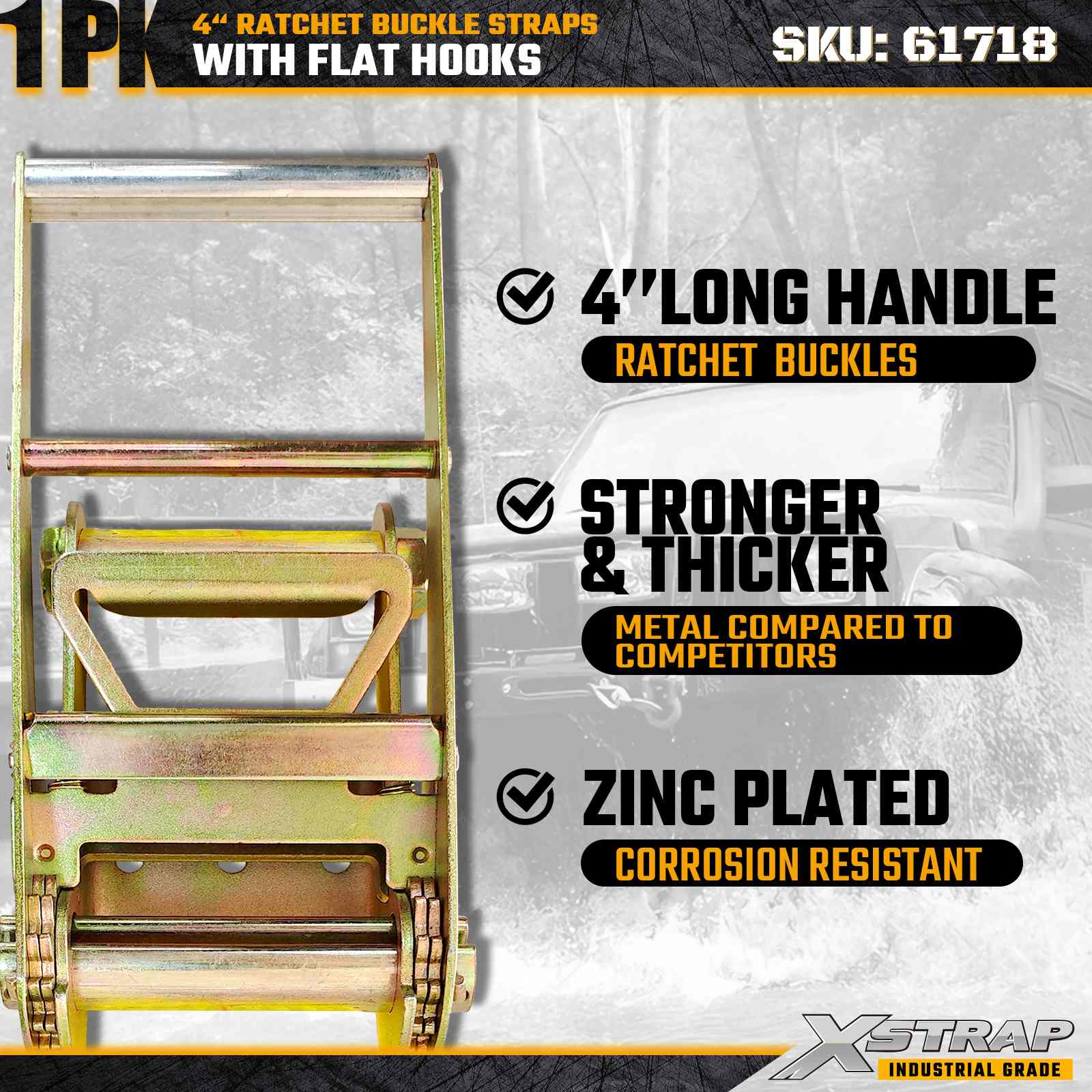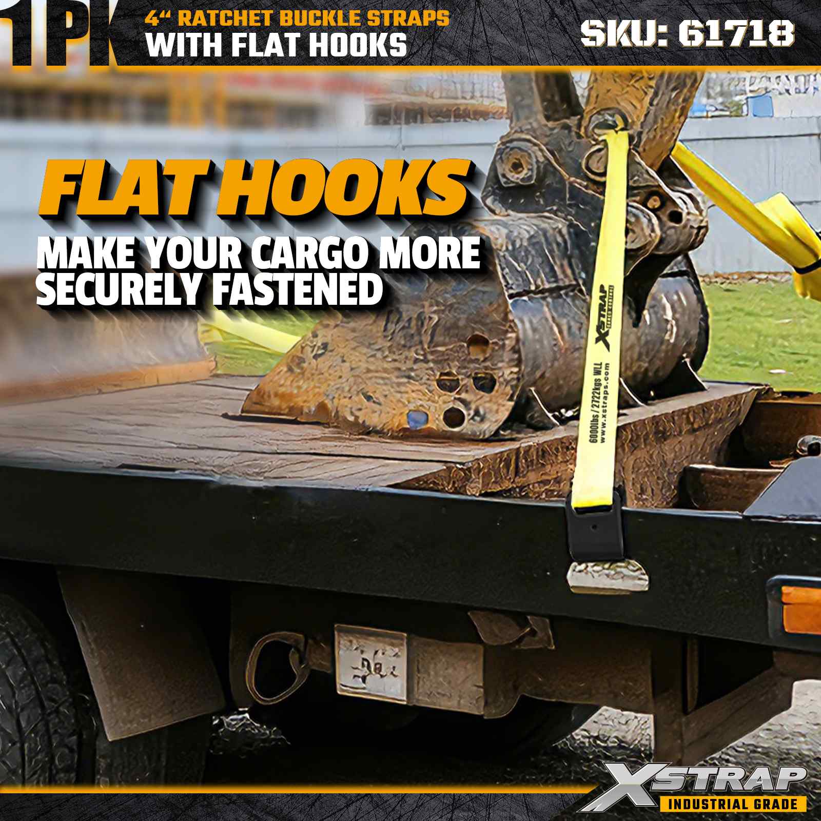 - Popruh s dĺžkou 27 stôp pre všestranné nákladné aplikácie: Dĺžka popruhu 27 stôp poskytuje dostatočný dosah na zabezpečenie veľkého, širokého alebo zviazaného nákladu, ako je rezivo, oceľové rúry, stroje a tovar na paletách.
