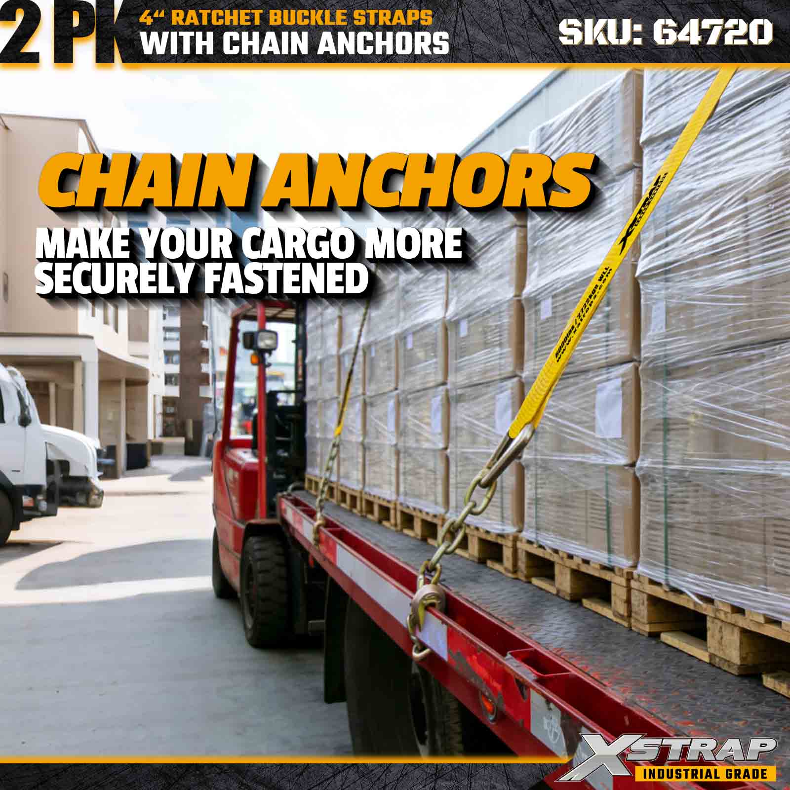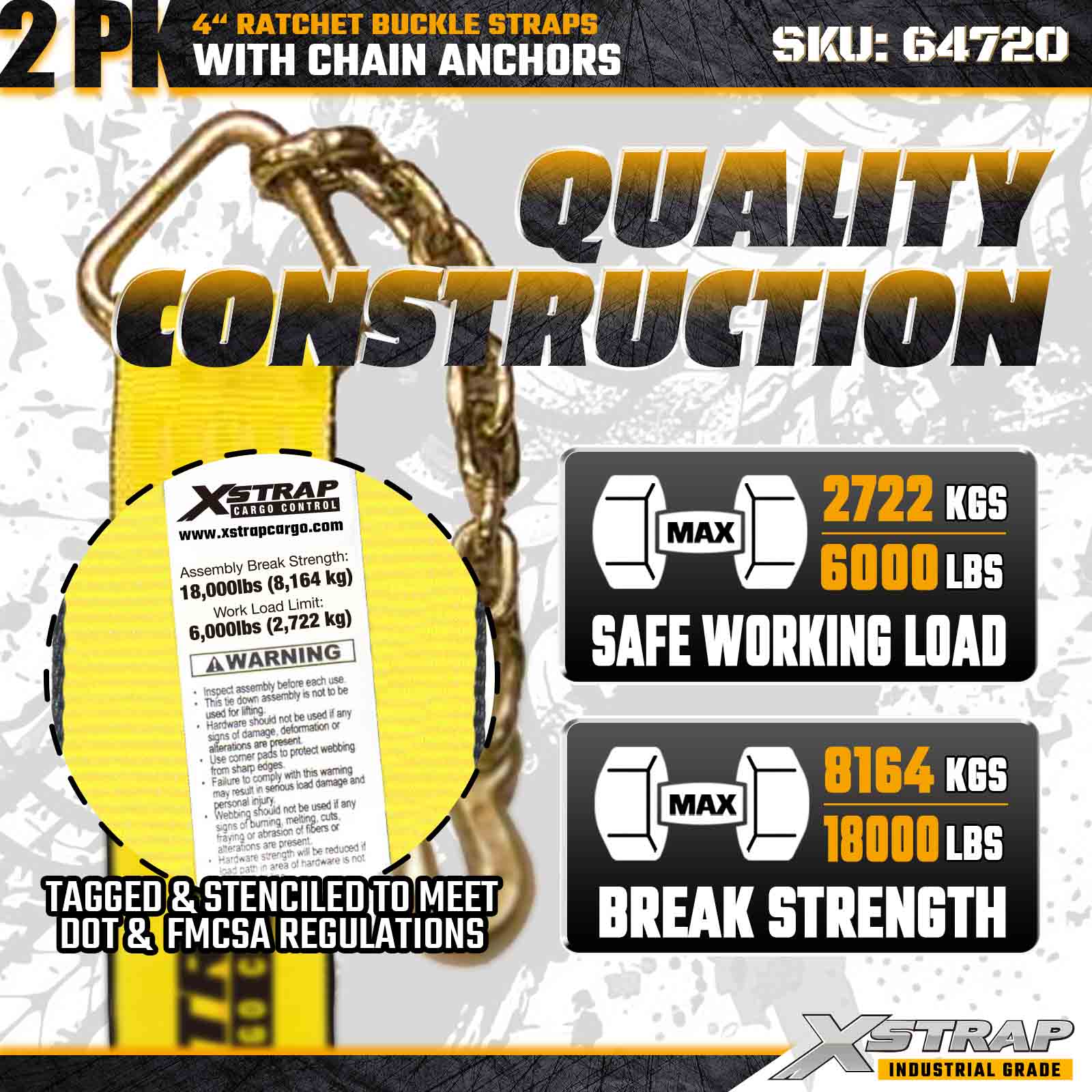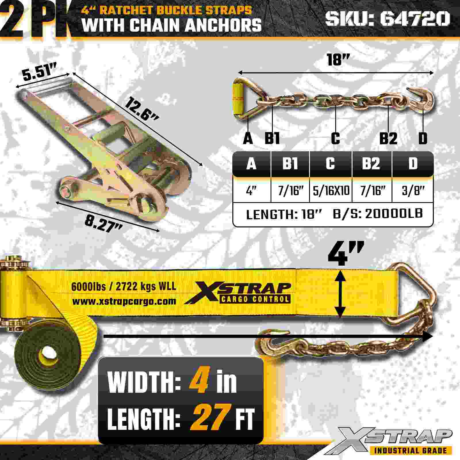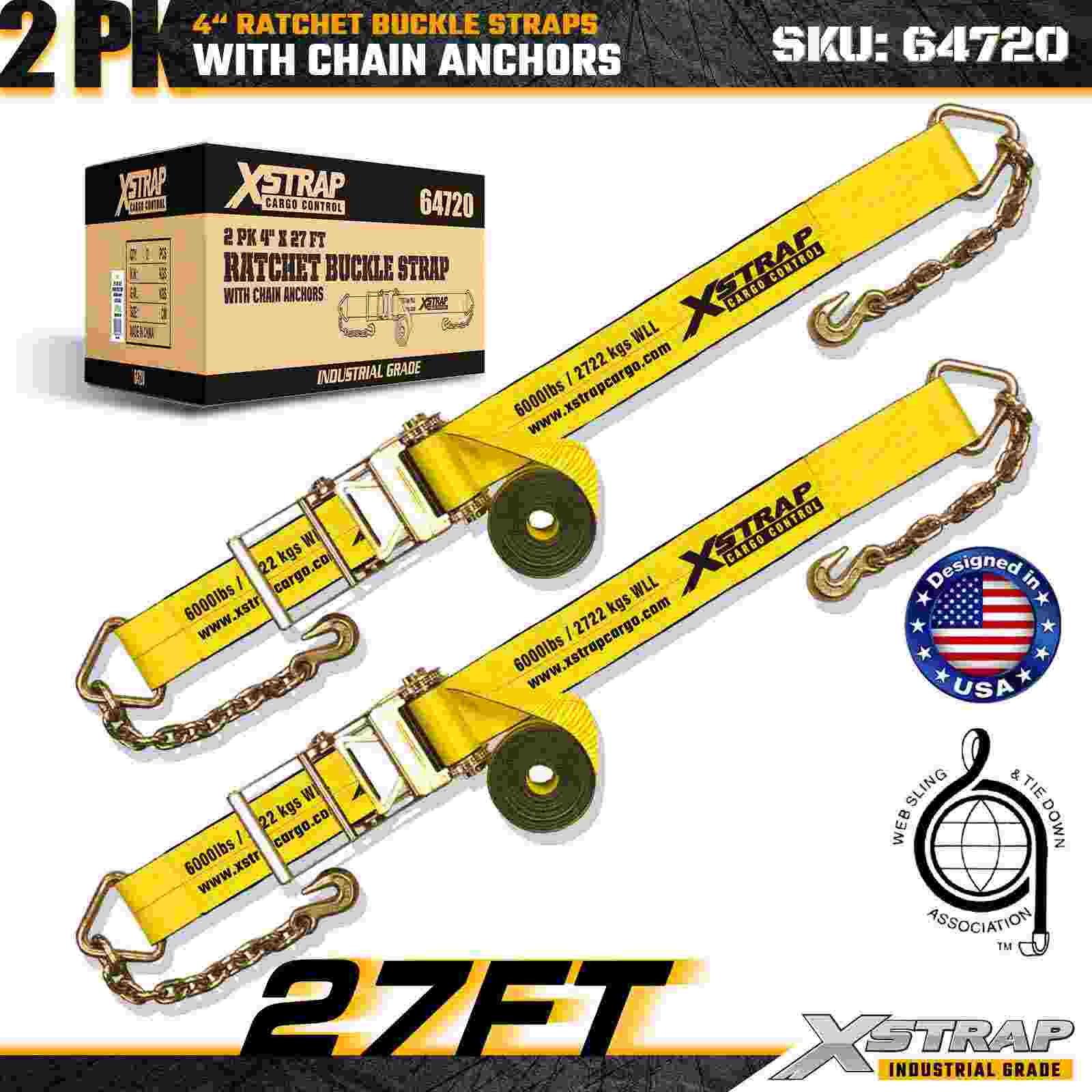 Xstrap 64720 4" × 27 stôp remienky s račňou s prackou (2-balenie) sú navrhnuté pre zaistenie nákladu v ťažkých nákladoch, obsahujú robustné reťazové kotvy a zosilnený račňový mechanizmus. S limitom pracovného zaťaženia 6 000 libier a 18 000 libier sú ideálne oceľové popruhy s pevnosťou v pretrhnutí a prepravné stroje s plochým zaťažením. nákladné aplikácie vyžadujúce maximálnu pevnosť a spoľahlivosť.
