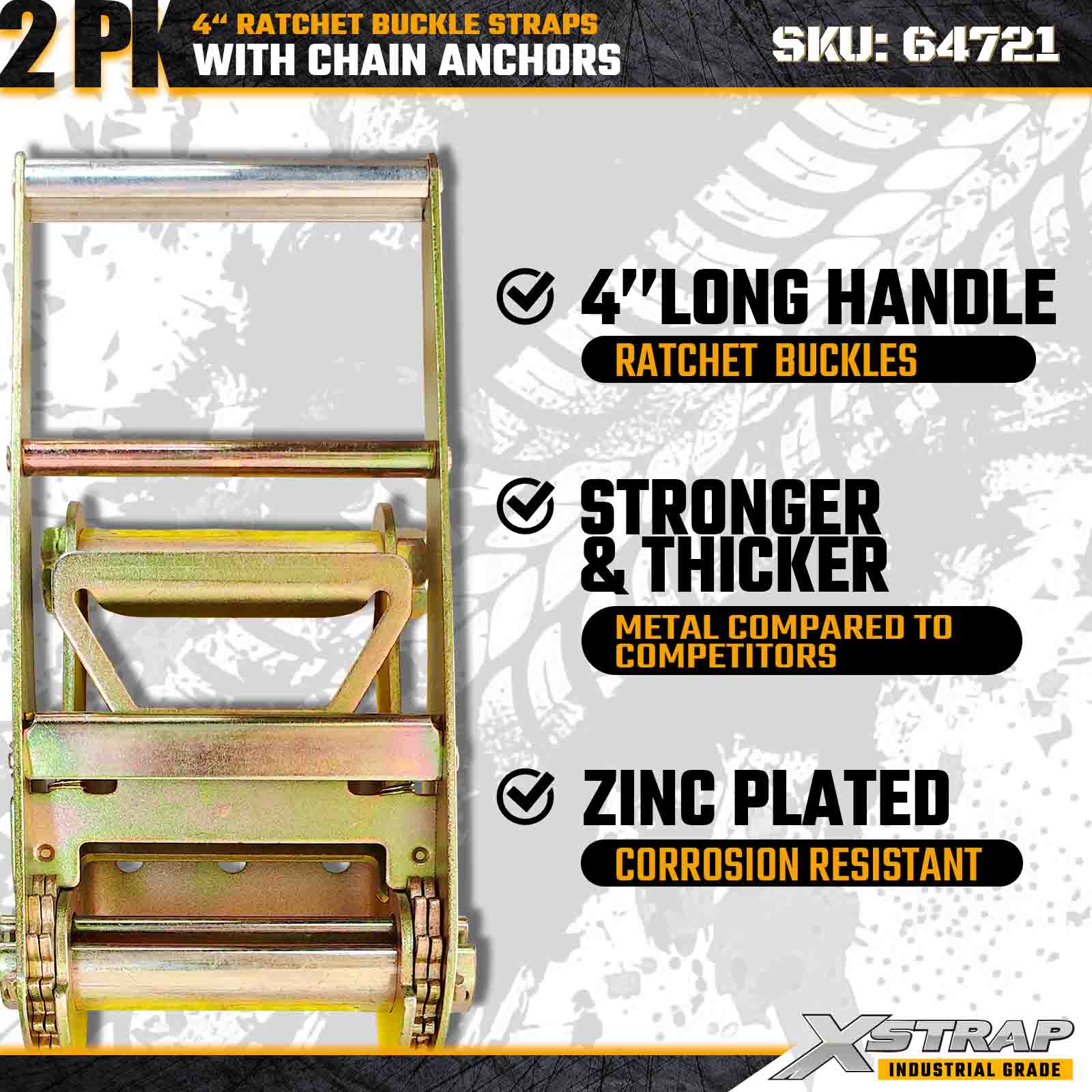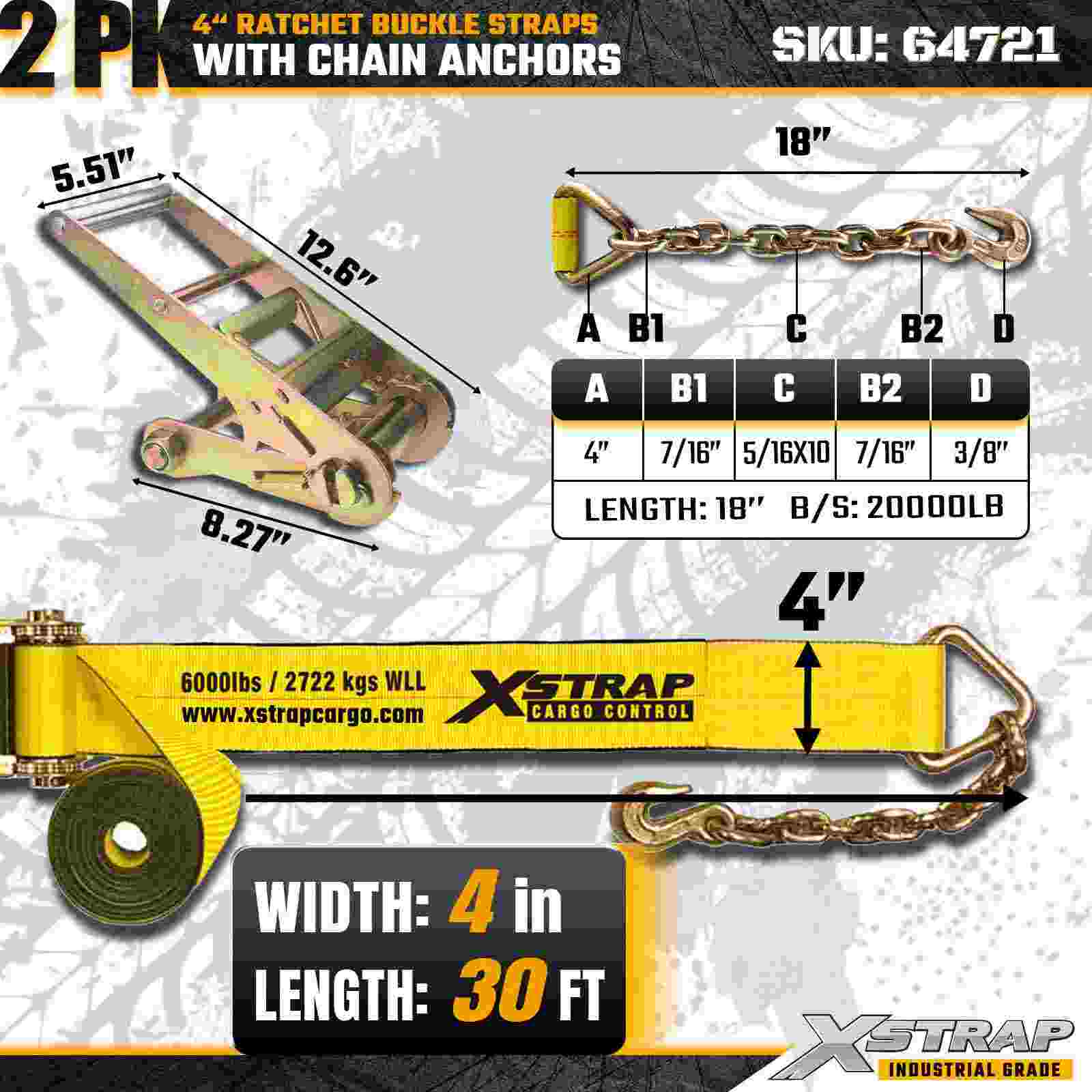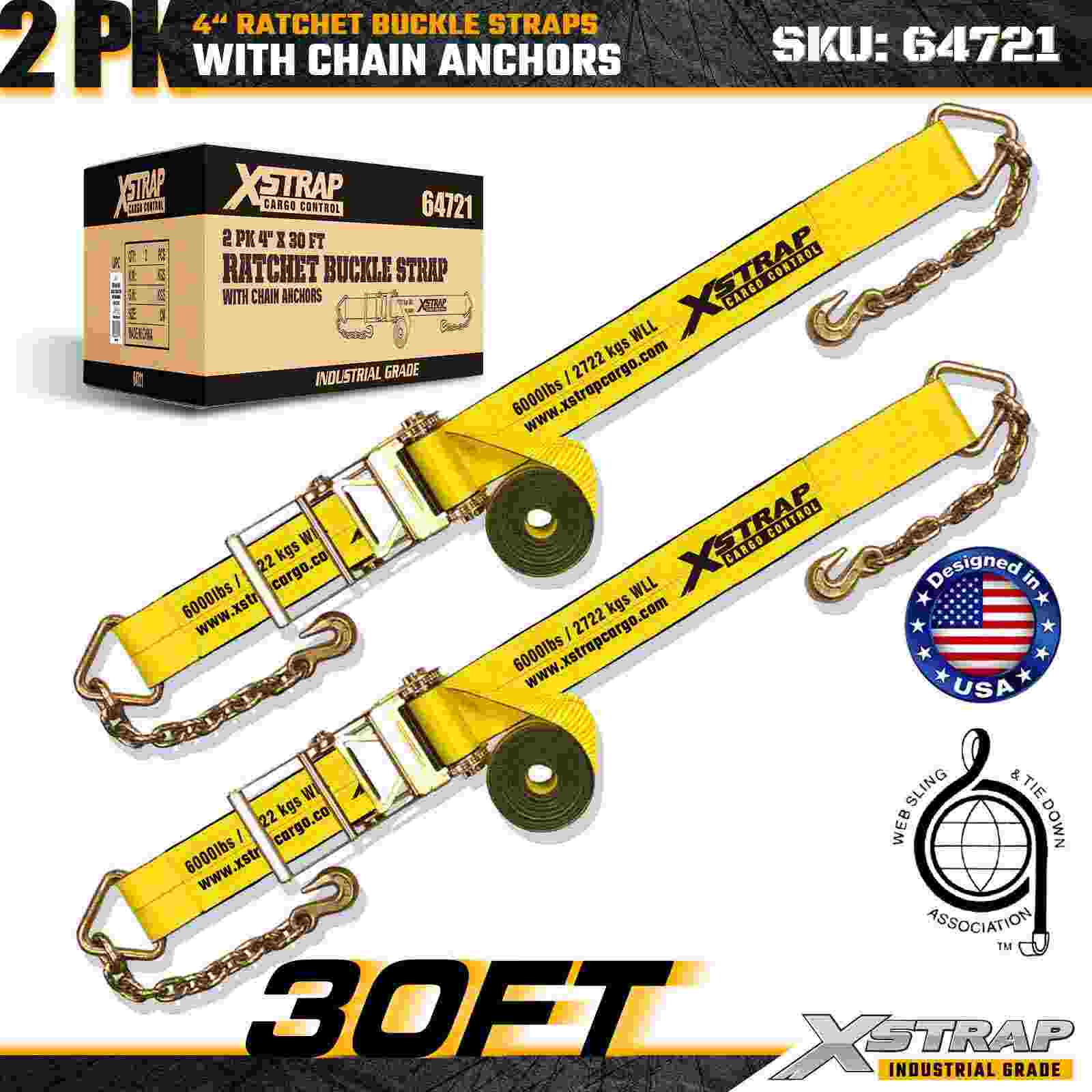Xstrap 64721 4" × 30 stôp remienky s račňou s prackou (2-balenie) sú navrhnuté pre zaistenie nákladu v ťažkých nákladoch, obsahujú robustné reťazové kotvy a zosilnený račňový mechanizmus. S limitom pracovného zaťaženia 6 000 libier a 18 000 libier sú ideálne oceľové popruhy s pevnosťou v pretrhnutí a prepravné stroje s plochým zaťažením. nákladné aplikácie vyžadujúce maximálnu pevnosť a spoľahlivosť.