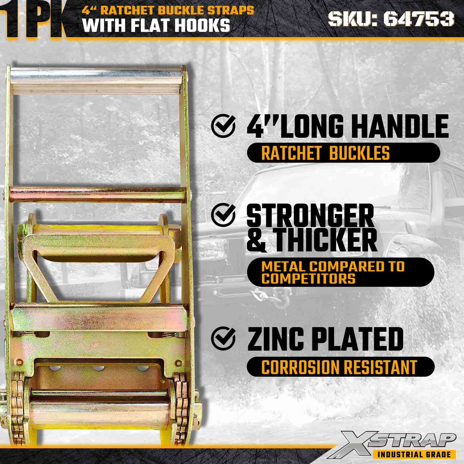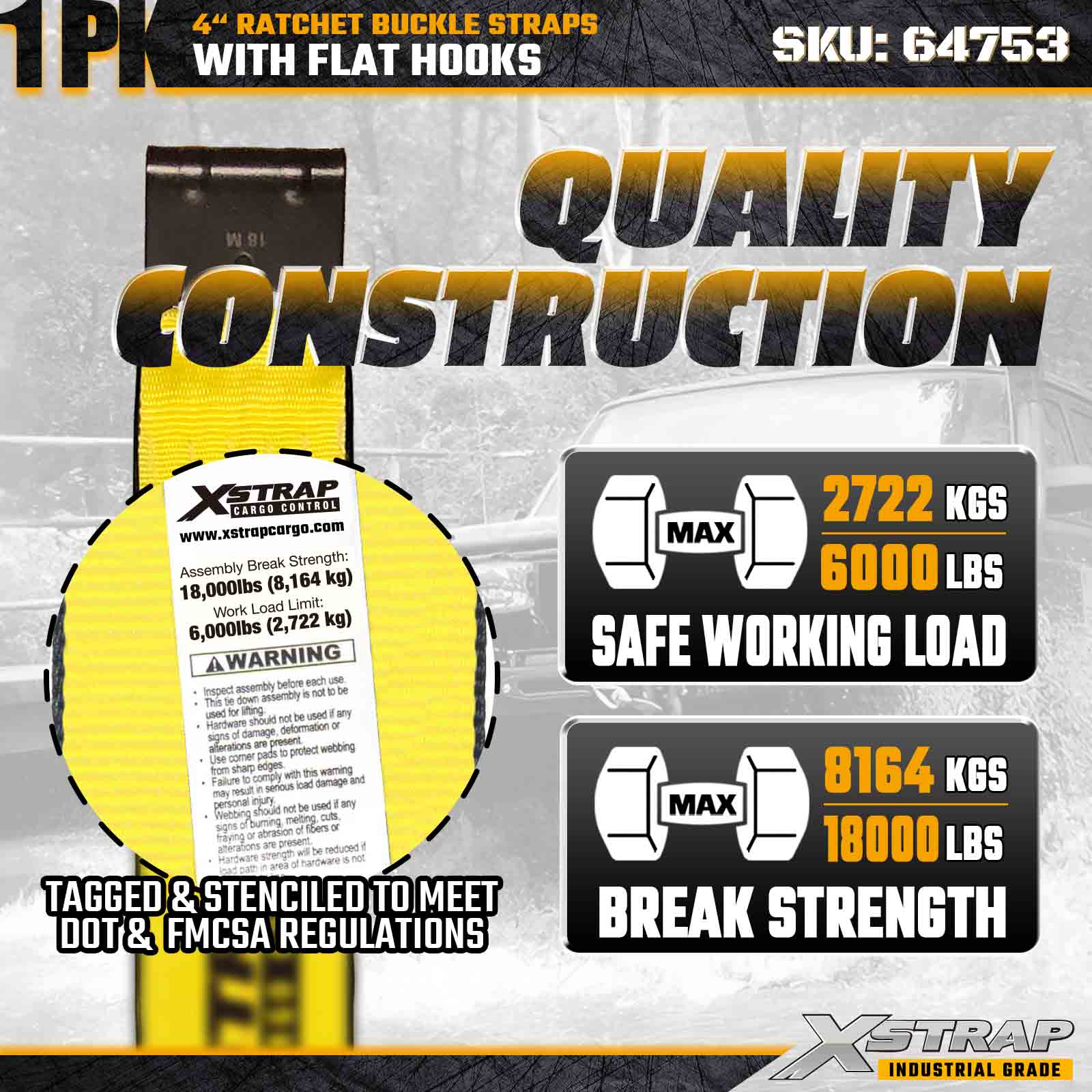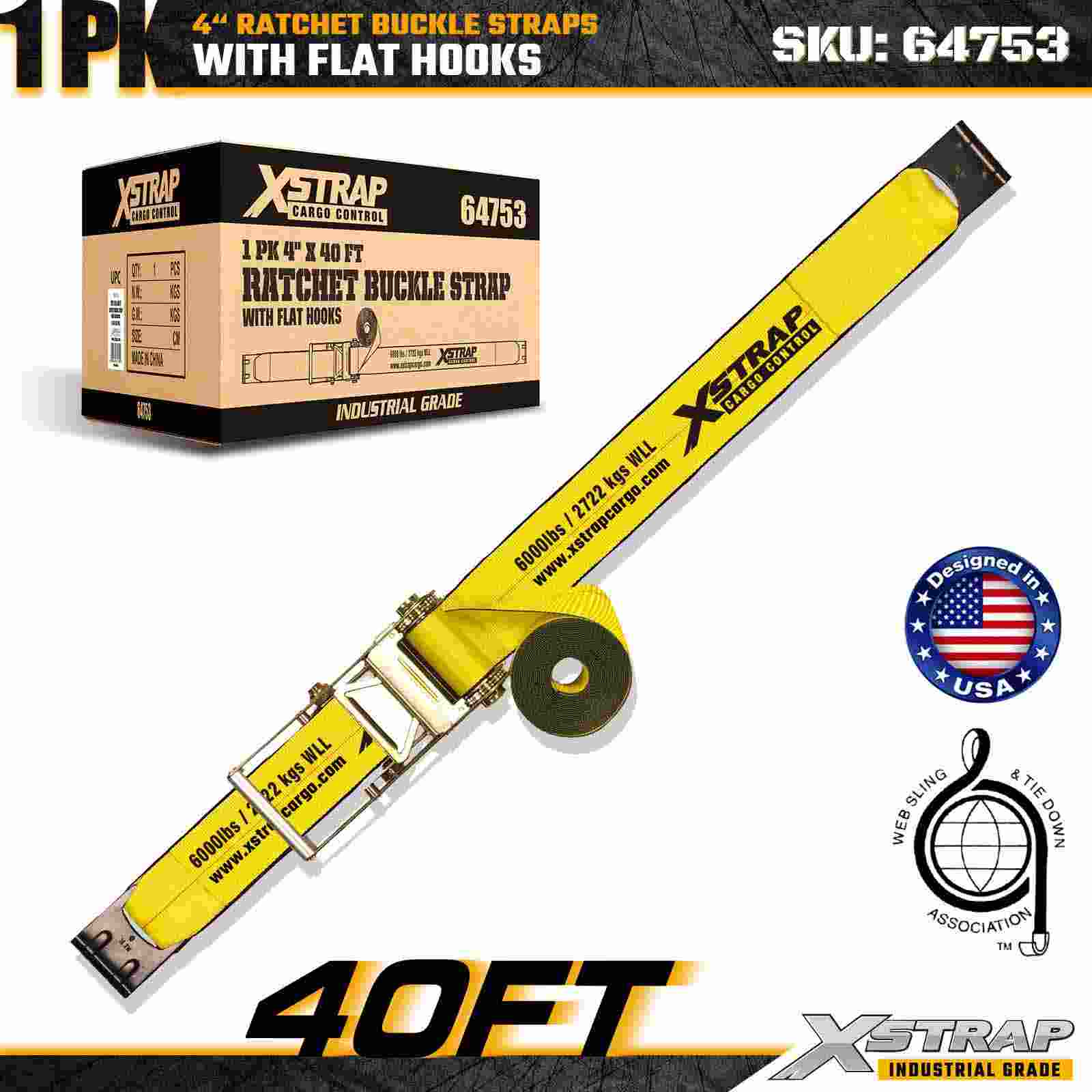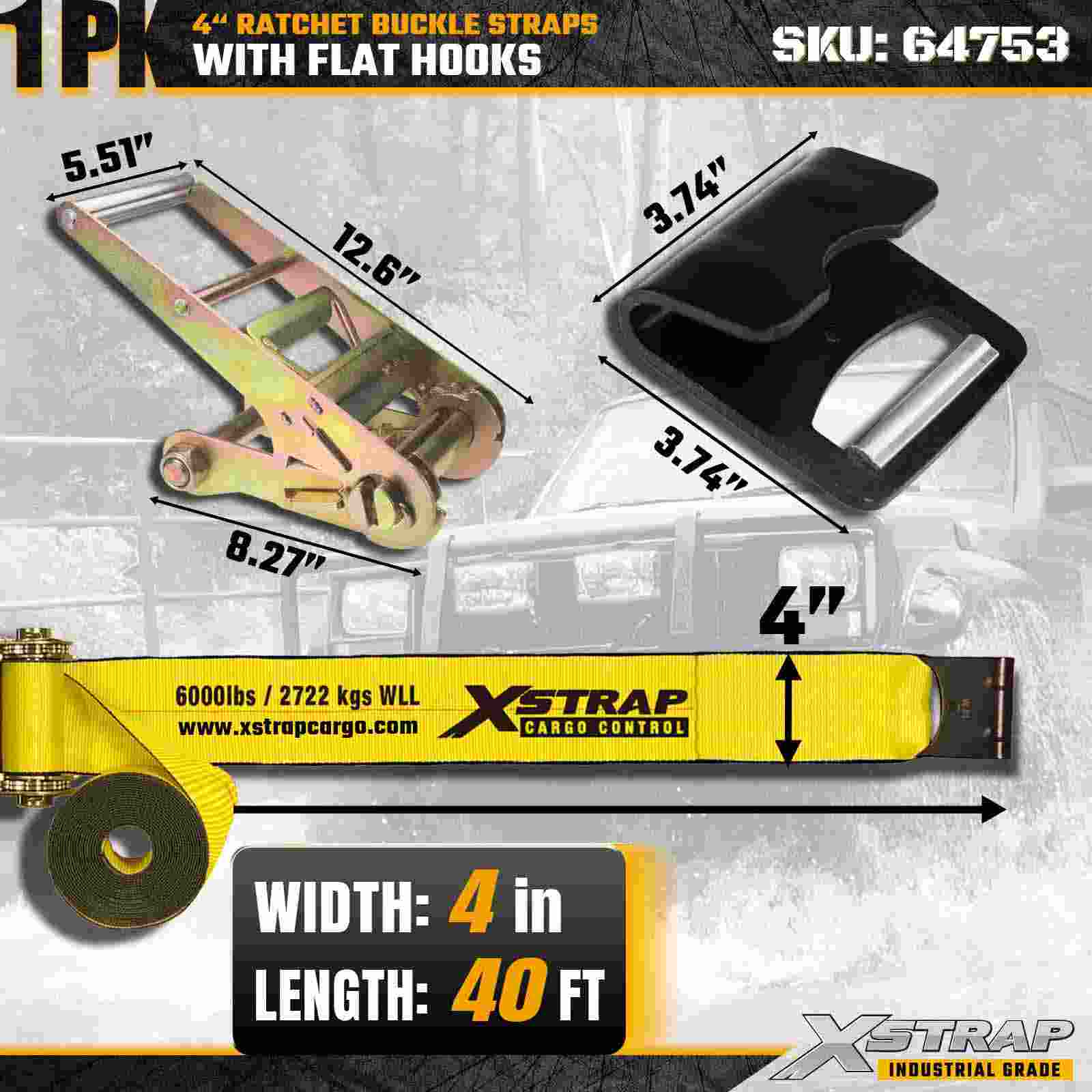Xstrap 64753 4" × 40 stôp račňový popruh s prackou (1 balenie) je navrhnutý na zaistenie nákladu v ťažkých nákladoch, obsahuje zosilnené ploché háky a odolný račňový mechanizmus. S limitom pracovného zaťaženia 6 000 libier a 18 000 libier je tento mimoriadne pevný popruh na prepravu ideálny pre ploché prepravné stroje. aplikácie priemyselného nákladu.
