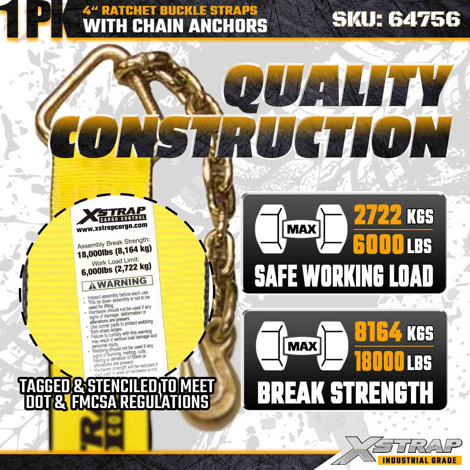 Xstrap 64756 4" × 50 stôp remienok s račňou s prackou (1 balenie) je navrhnutý pre extrémne náročné zaistenie nákladu, obsahuje robustné reťazové kotvy a zosilnený račňový mechanizmus. S limitom pracovného zaťaženia 6 000 libier a silou pri pretrhnutí 18 000 libierdlhý popruh je ideálny pre nadrozmerné náklady, prepravu strojov, prepravu ocele a priemyselnú logistiku vyžadujúcu maximálny dosah a spoľahlivosť.