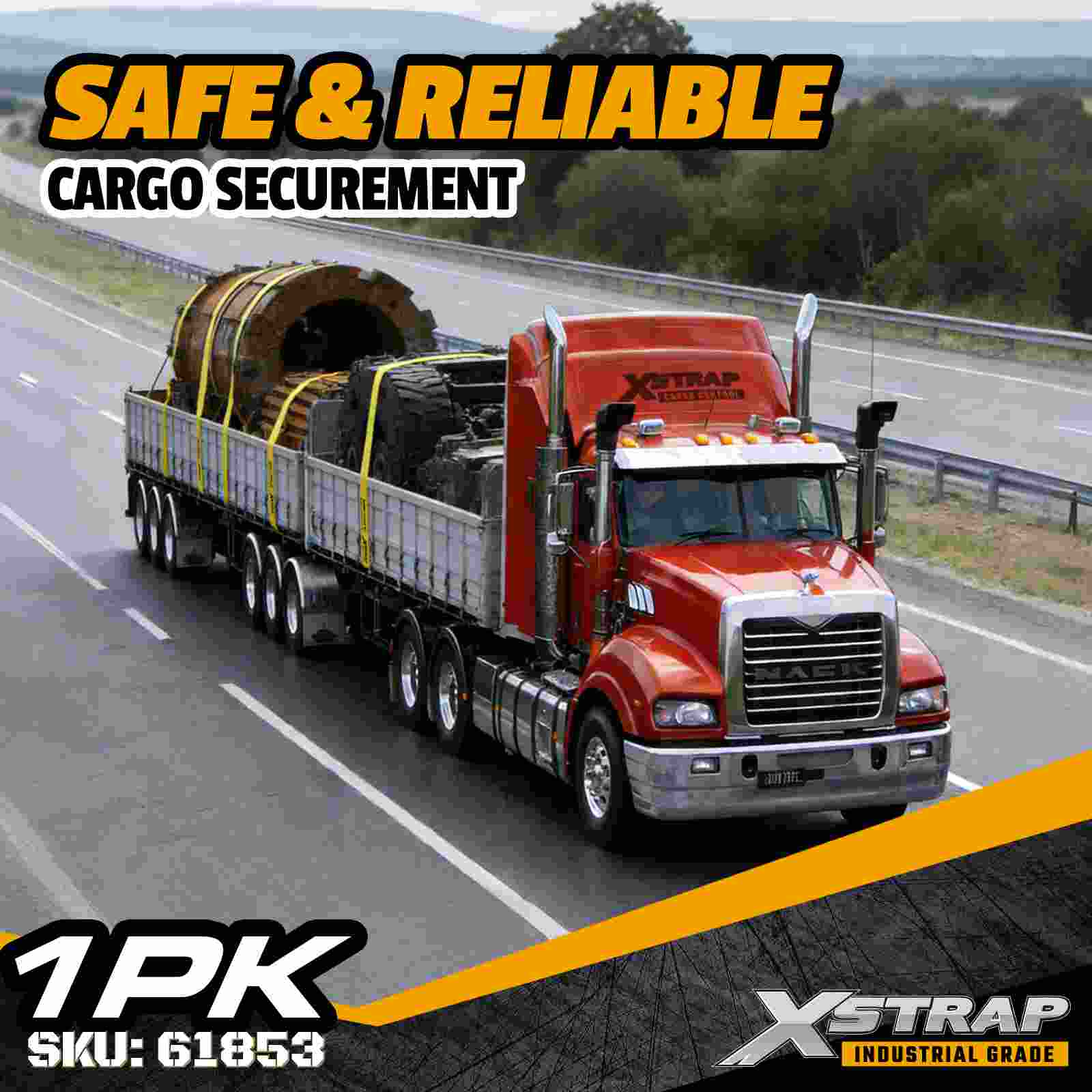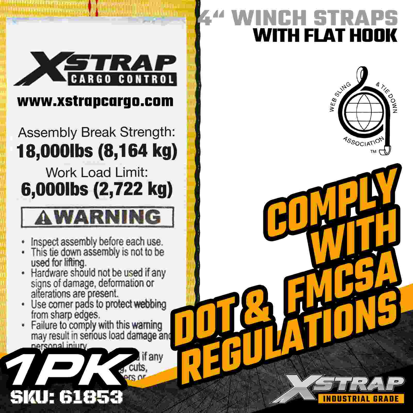 Xstrap 61853 4" × 40 stôp štandardný popruh na navijak je vysokokapacitný popruh na zaistenie nákladu s predĺženým dosahom navrhnutý pre valníkové prívesy a nadrozmernú priemyselnú nákladnú dopravu. Tento 4-palcový popruh na navijak so zosilneným plochým hákom a extra širokým 4-palcovým polyesterovým popruhom zaisťuje pracovné zaťaženie 6 000 lbs 1000 a 600 lbs. Pevnosť Extra dlhá dĺžka 40 stôp poskytuje výnimočný dosah na zaistenie širokých, vysokých alebo nepravidelne tvarovaných nákladov, ktoré vyžadujú maximálne pokrytie a stabilitu.