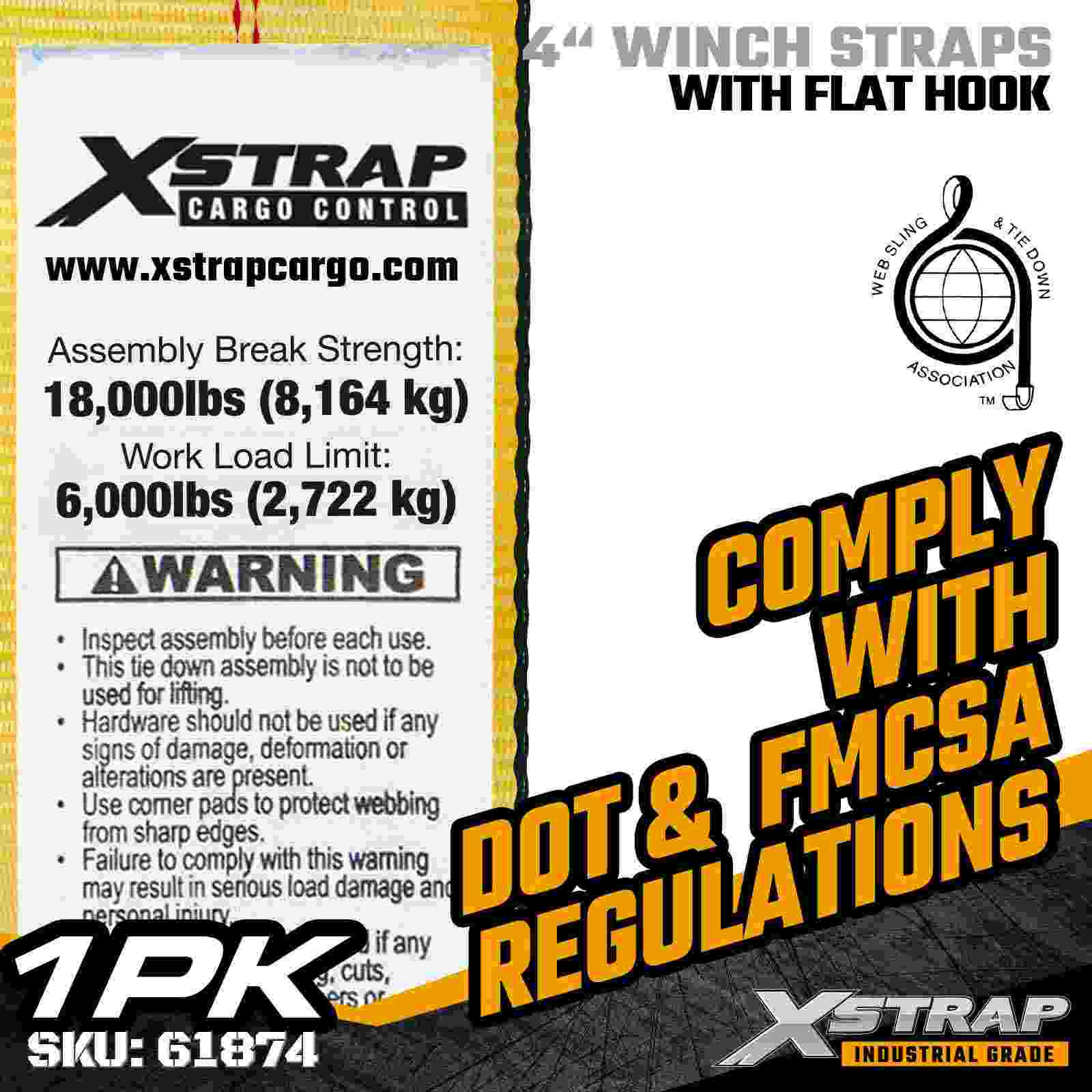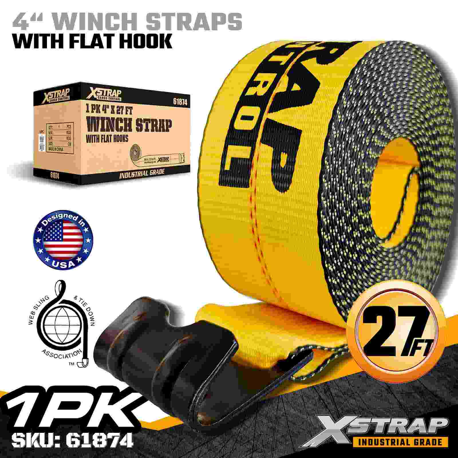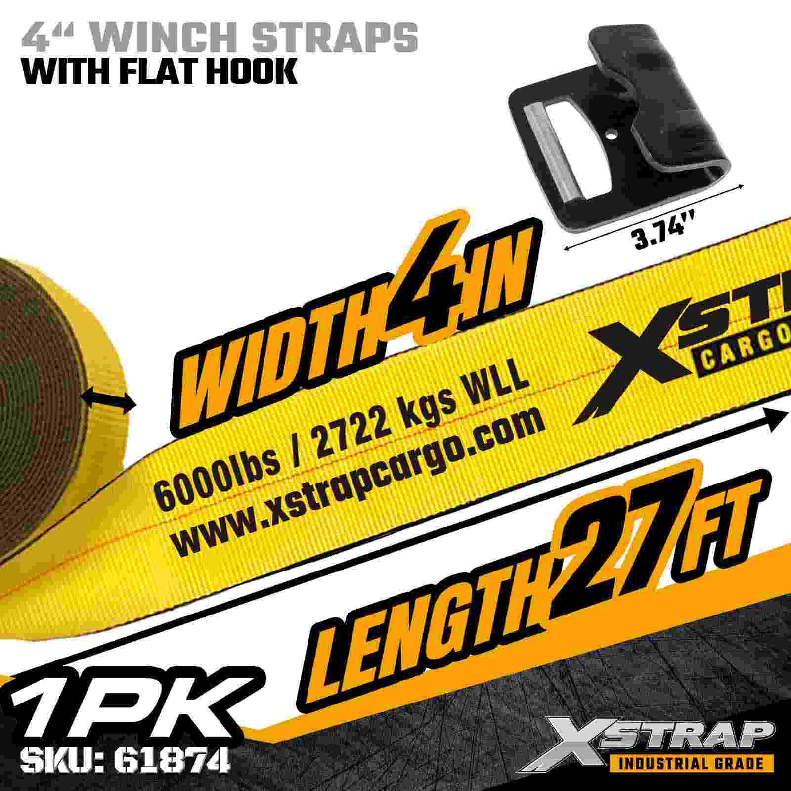 Xstrap 61874 4" × 27 stôp štandardný popruh na navijak je odolný a vysokokapacitný popruh na zaistenie nákladu navrhnutý pre valníkové prívesy a priemyselnú prepravu. Tento 4-palcový popruh na navijak, ktorý obsahuje zosilnený plochý hák a extra široký 4-palcový polyesterový popruh, poskytuje 6 000 libier, širšiu pracovnú záťaž 0 000 libier. popruh poskytuje vynikajúce rozloženie nákladu, vďaka čomu je ideálny na zabezpečenie ťažkého, objemného alebo jemného nákladu, ktorý vyžaduje maximálnu stabilitu.