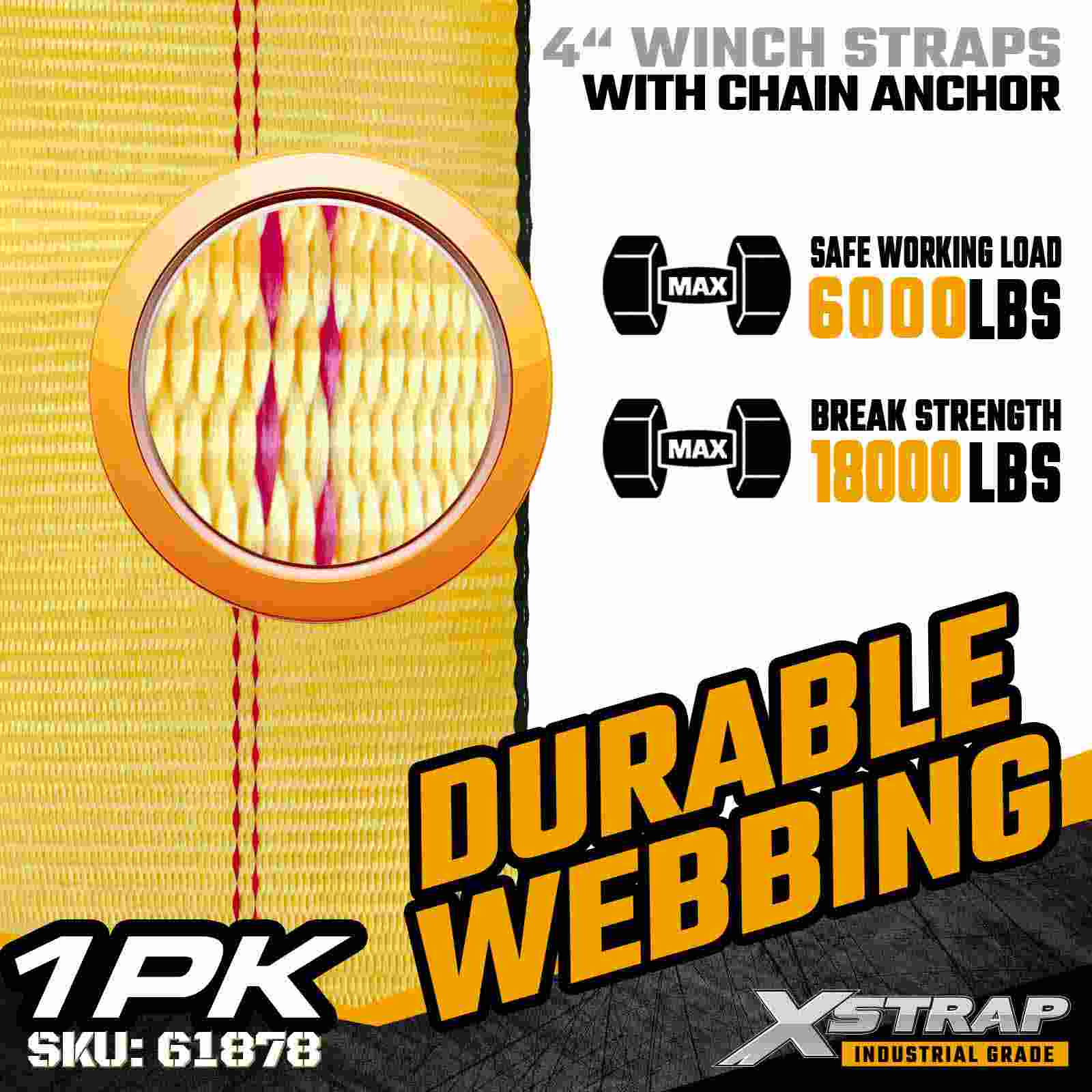 Xstrap 61878 4" × 27 stôp štandardný popruh na navijak je odolný popruh na zabezpečenie priemyselného nákladu navrhnutý pre valníkové prívesy a podmienky extrémneho zaťaženia. Tento 4-palcový popruh na navijak s kovanou kotvou reťaze a ultra širokým 4-palcovým polyesterovým popruhom poskytuje 6 000 lbs Streng.8 lbs. Konštrukcia kotvy poskytuje bezkonkurenčnú priľnavosť a odolnosť, vďaka čomu je ideálna na zaistenie ocele, strojov a iného nákladu pod vysokým napätím.
