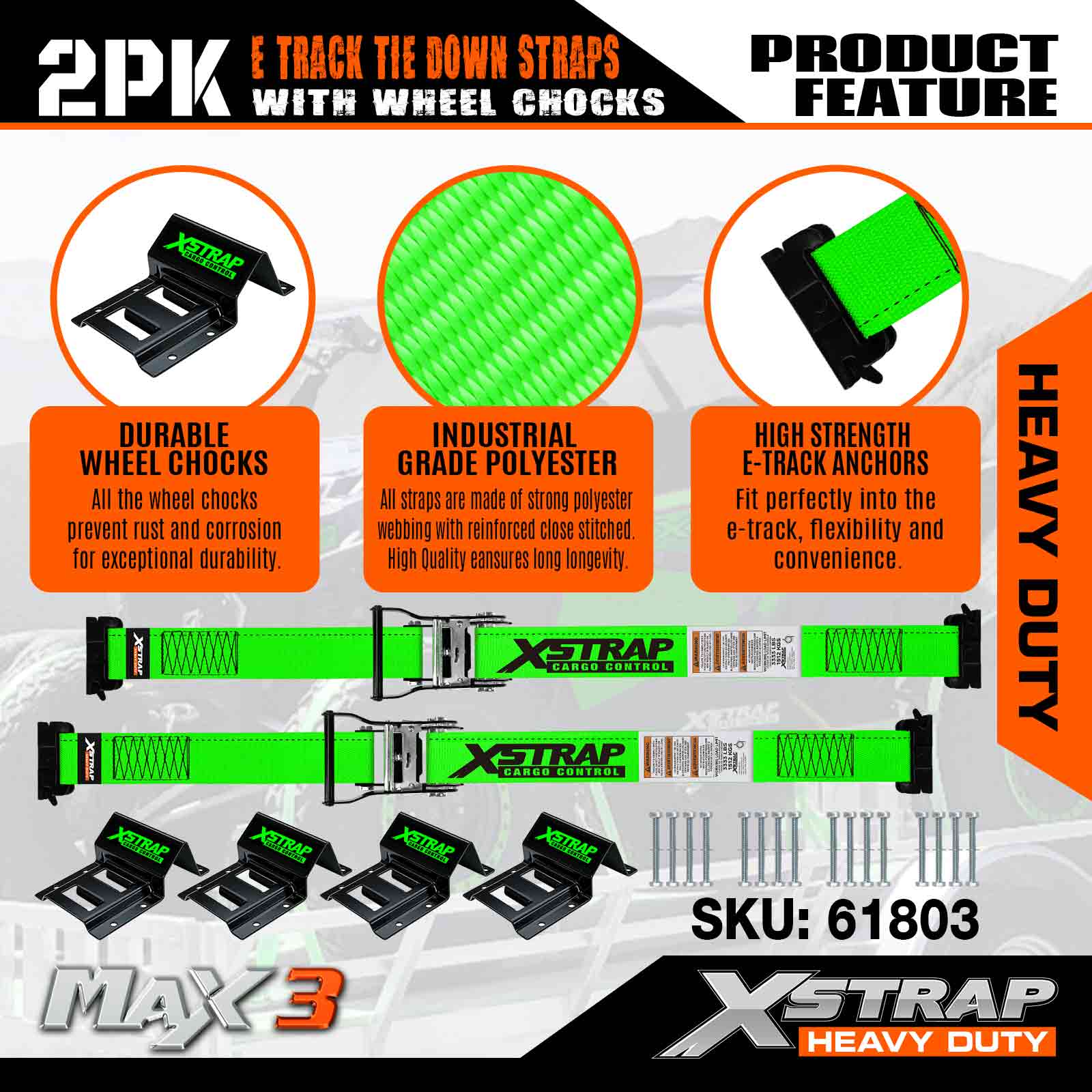 Sortiment zahŕňa sťahovacie popruhy, bungee šnúry, ťažné popruhy, zdvíhacie popruhy, kladkostroje a príslušenstvo 4x4, ktoré sa široko používajú v doprave, logistike, outdoore a priemysle. Jeho interná značka XSTRAP sa teší silnému uznaniu na svetových trhoch spolu s flexibilným OEM/ODM služby pre prispôsobené potreby.