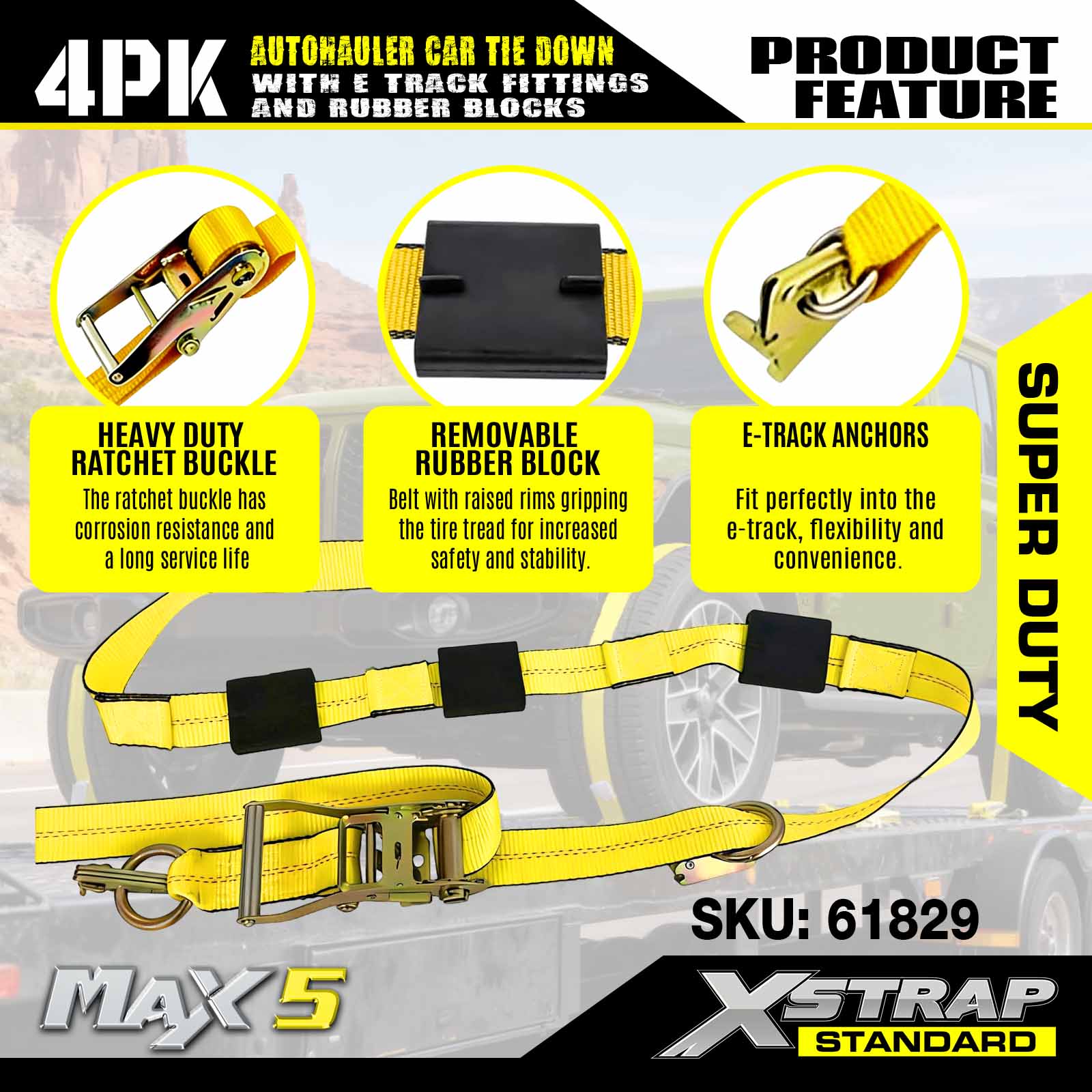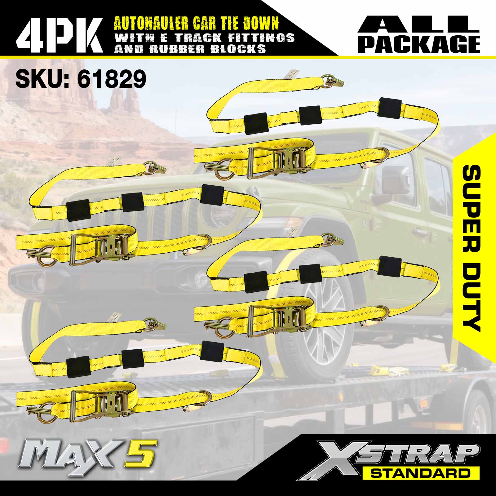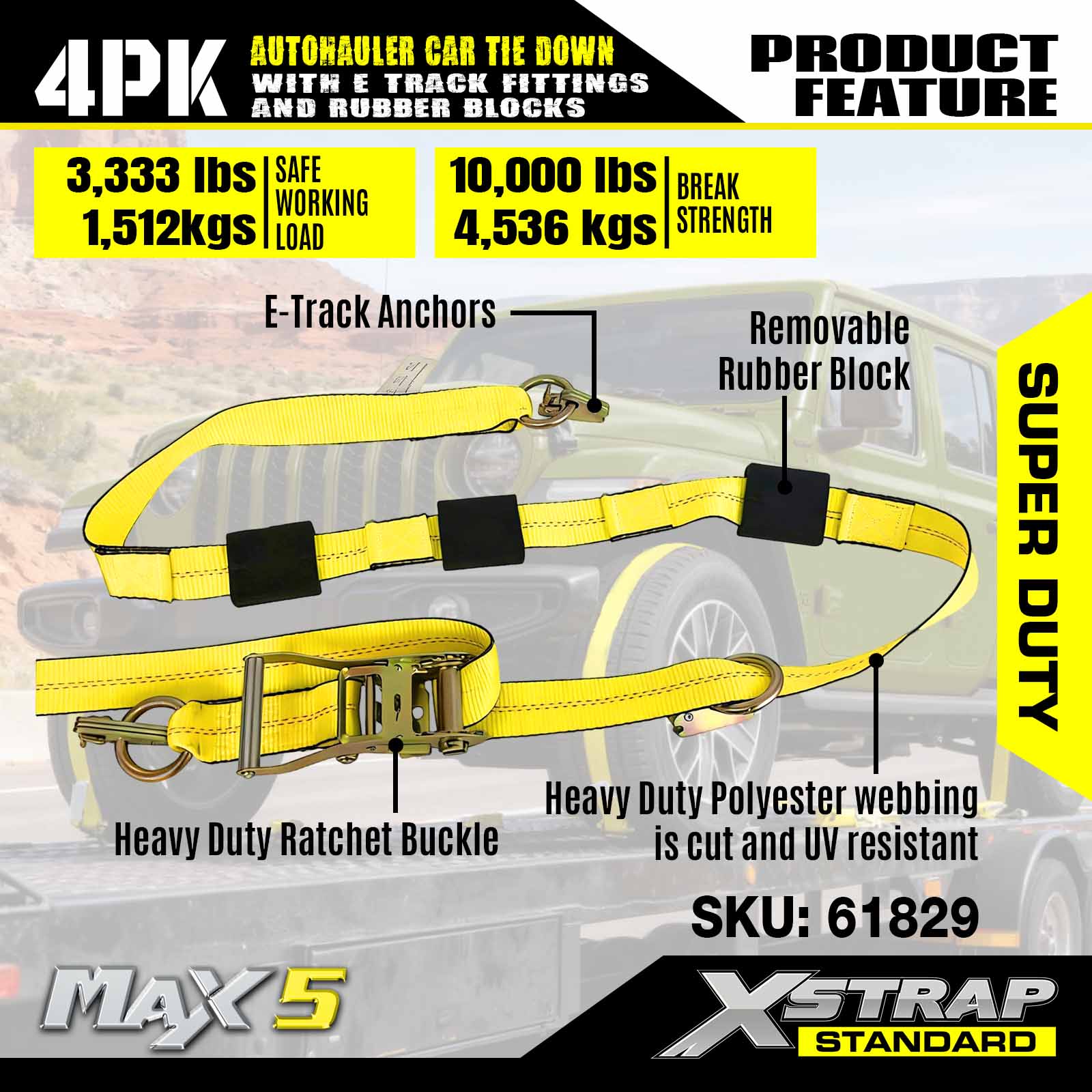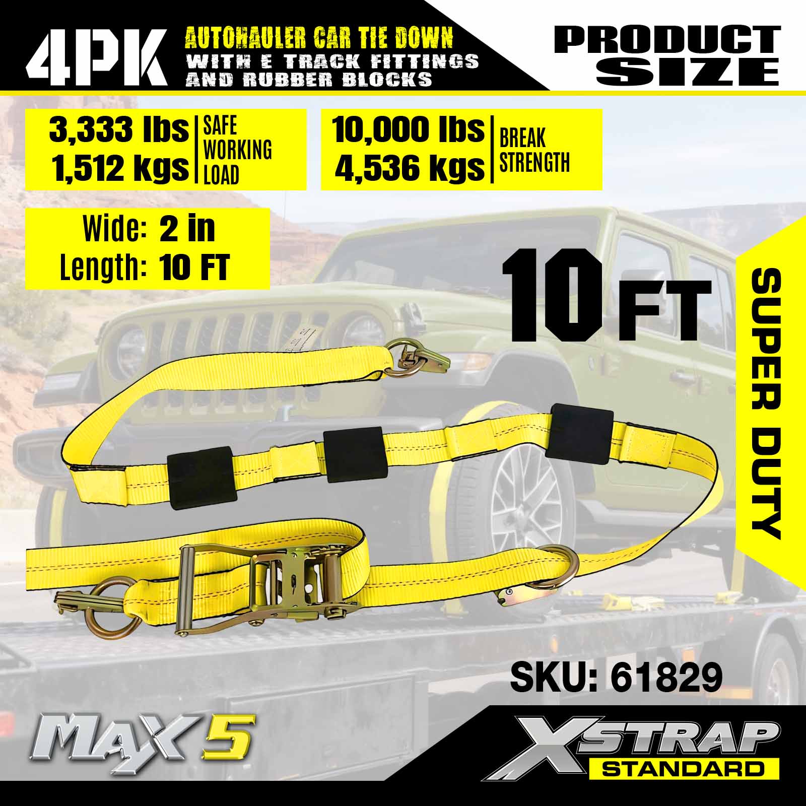 - Bezpečnosť a všestrannosť: Navrhnuté s limitom pracovného zaťaženia 3 333 libier a pevnosťou v pretrhnutí 10 000 libier, tieto popruhy na vozidlá spĺňajú normy DOT a CVSA, poskytujú bezkonkurenčnú bezpečnosť pre vaše autá, štvorkolky, UTV a pretekárske autá na akomkoľvek prívese.