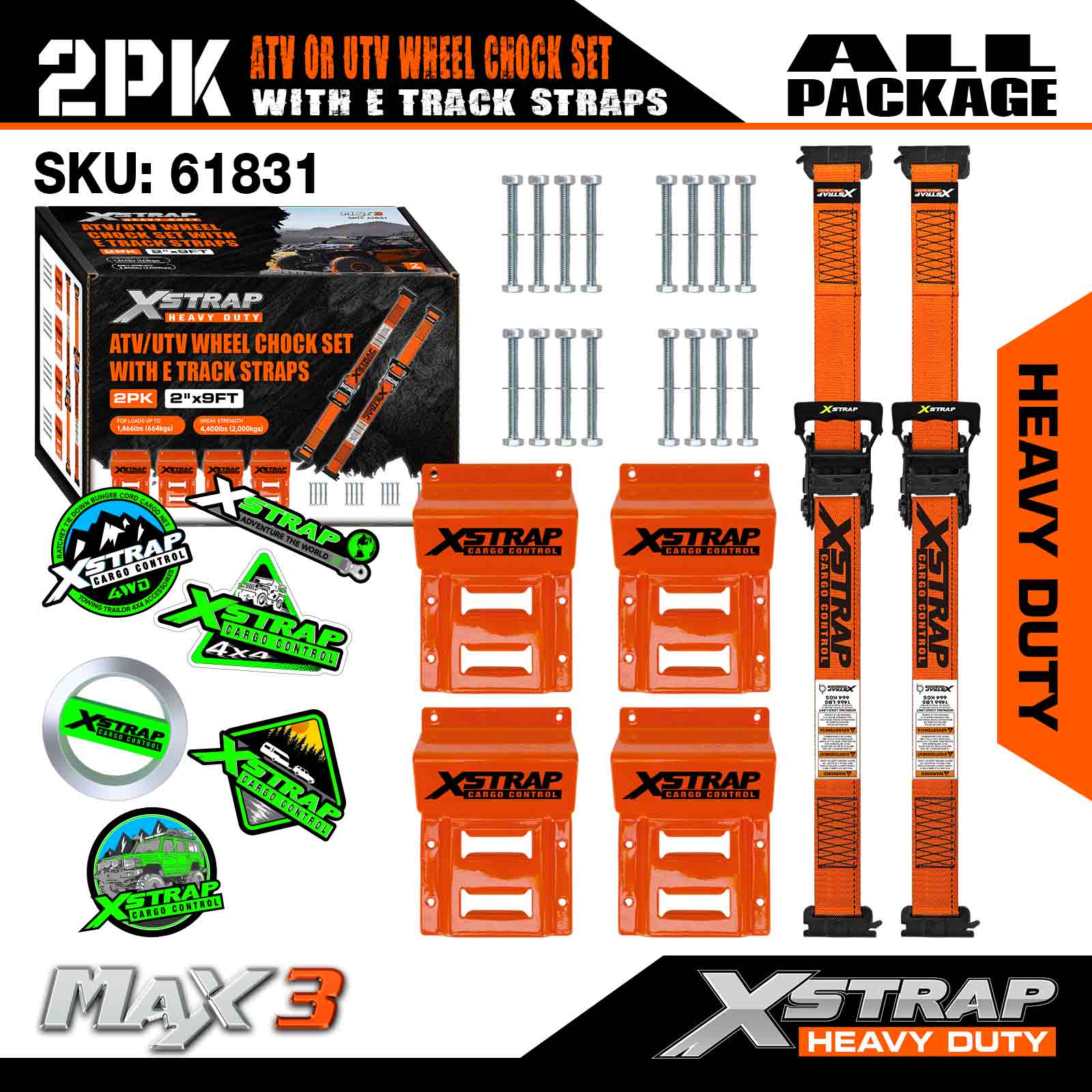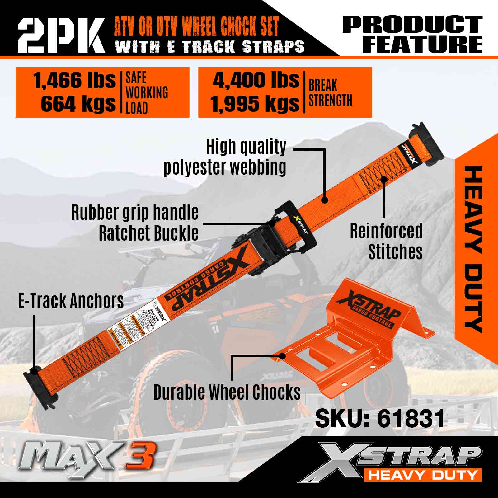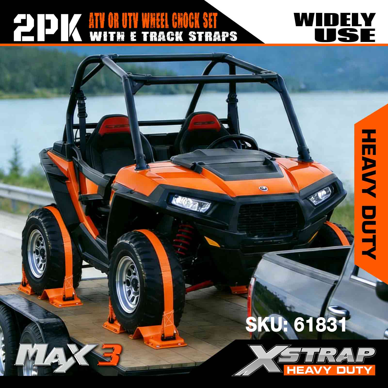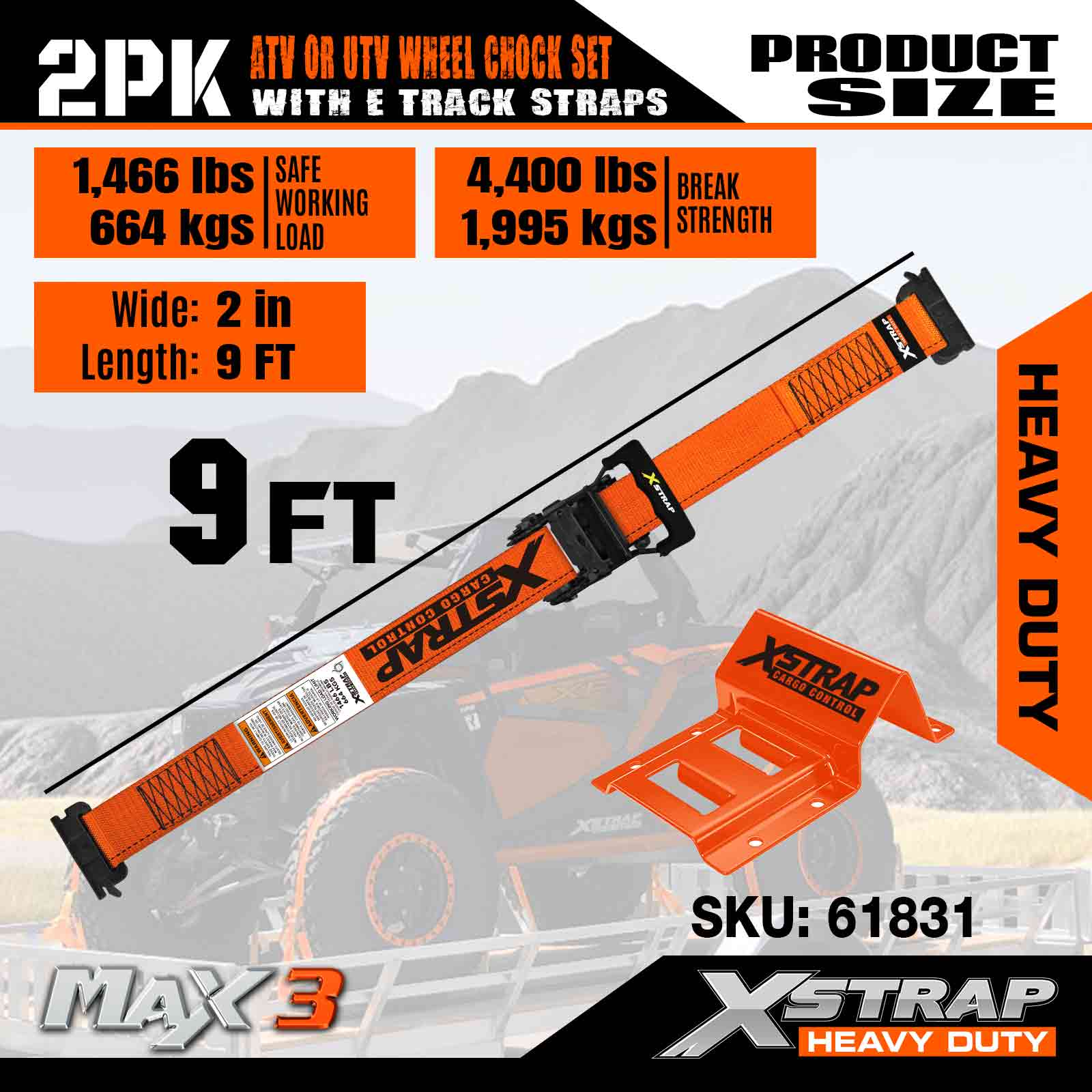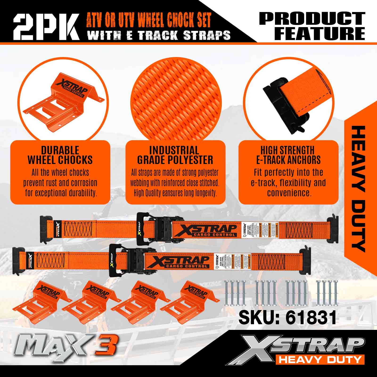 Xstrap UTV súprava na ukotvenie kolies 4400 lb Pevnosť pri pretrhnutí (4) Remene s račňou na pneumatiky prívesu (8) Zakladacie kliny na kolesá – E Track System pre štvorkolky, UTV, kosačky na trávu Four Wheeler – oranžová