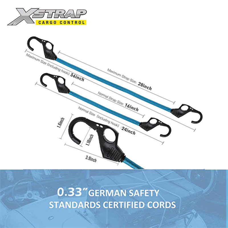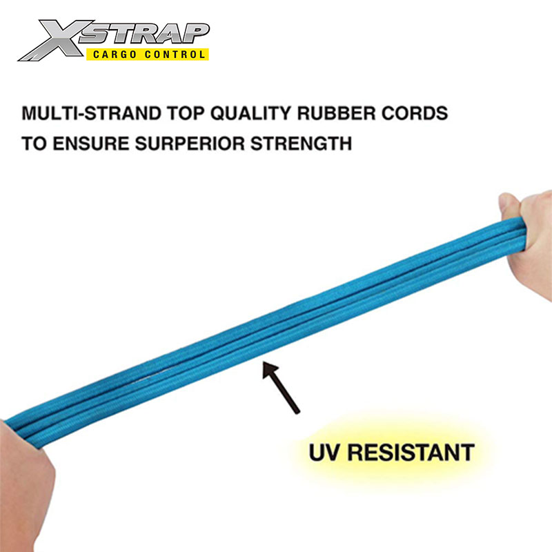 Bungee šnúrky s háčikmi s otvormi na prsty vyrobené z prvotriednej krížovo tkanej gumy odolnej voči UV žiareniu a latexu sa pri každodennom používaní alebo v rôznych klimatických podmienkach neopotrebujú ani nezlomia.