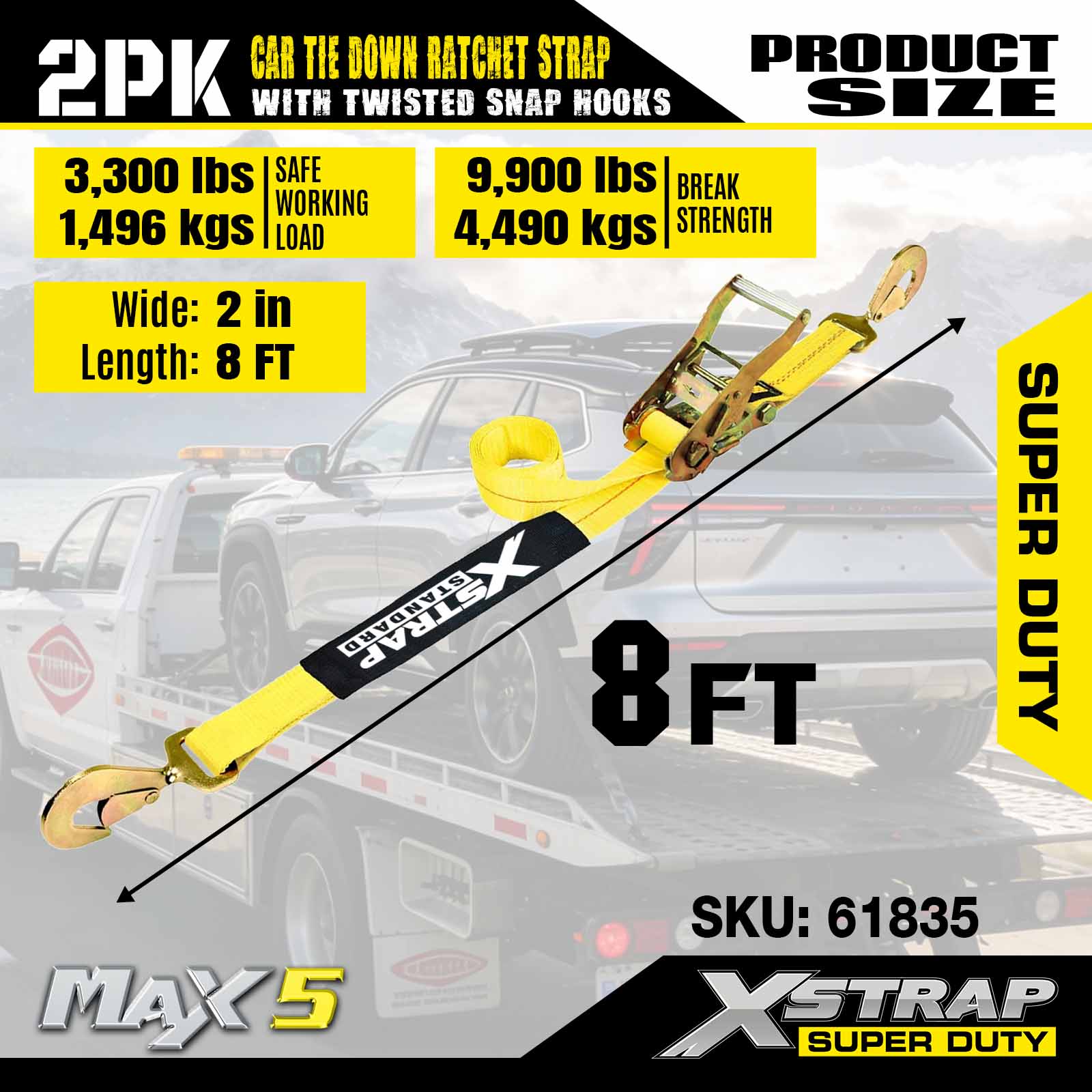 Xstrap upínacie popruhy pre prívesy do auta, 2 palcové x 8 palcové račňové popruhy pre ťažký nákladný automobil, 2PK, pevnosť v pretrhnutí 10 000 libier