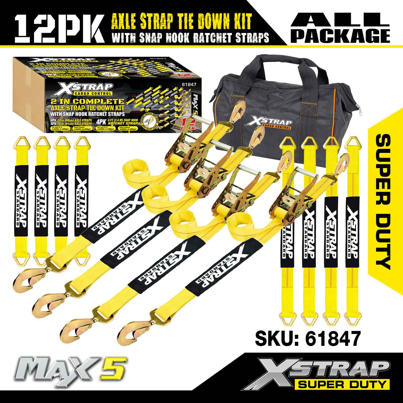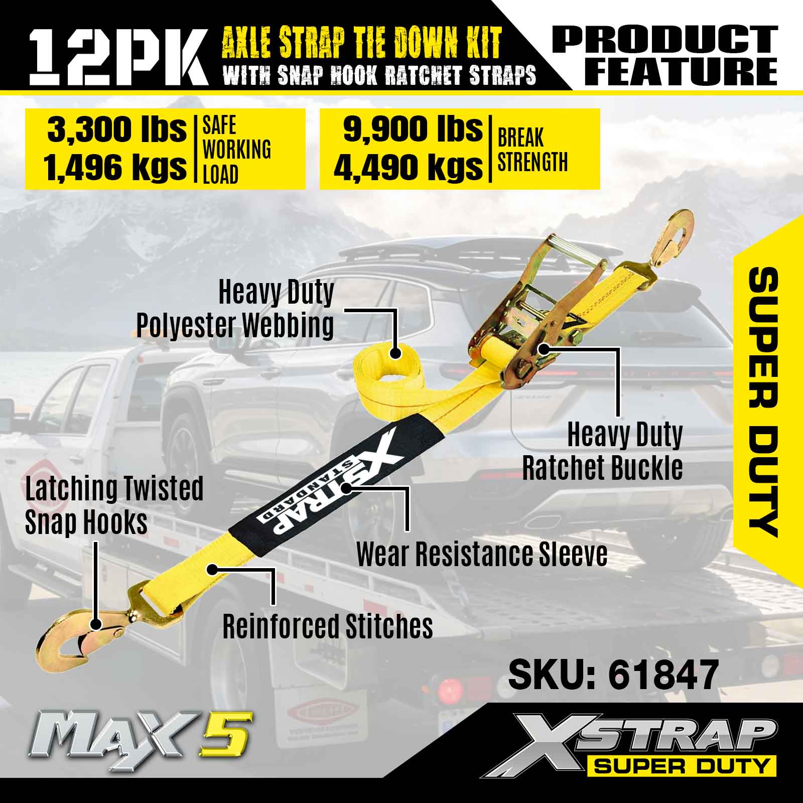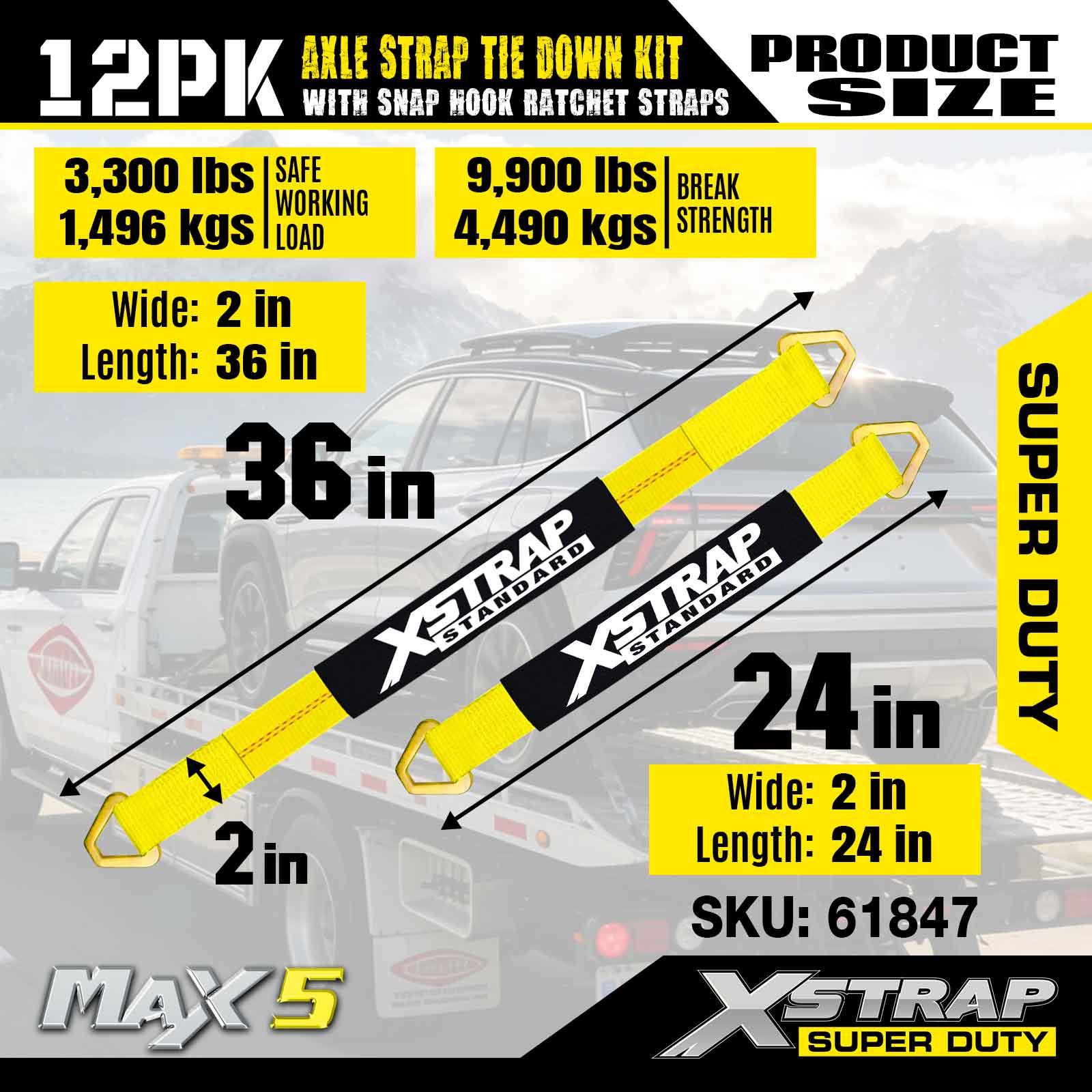 Xstrap 12PK súprava upínacieho popruhu na nápravu (s račňovými popruhmi so západkovým hákom) – Super Duty. Má bezpečnú pracovnú záťaž 3 300 LBS (1 496 kg) a medzu pevnosti 10 000 LBS (4 490 kg).