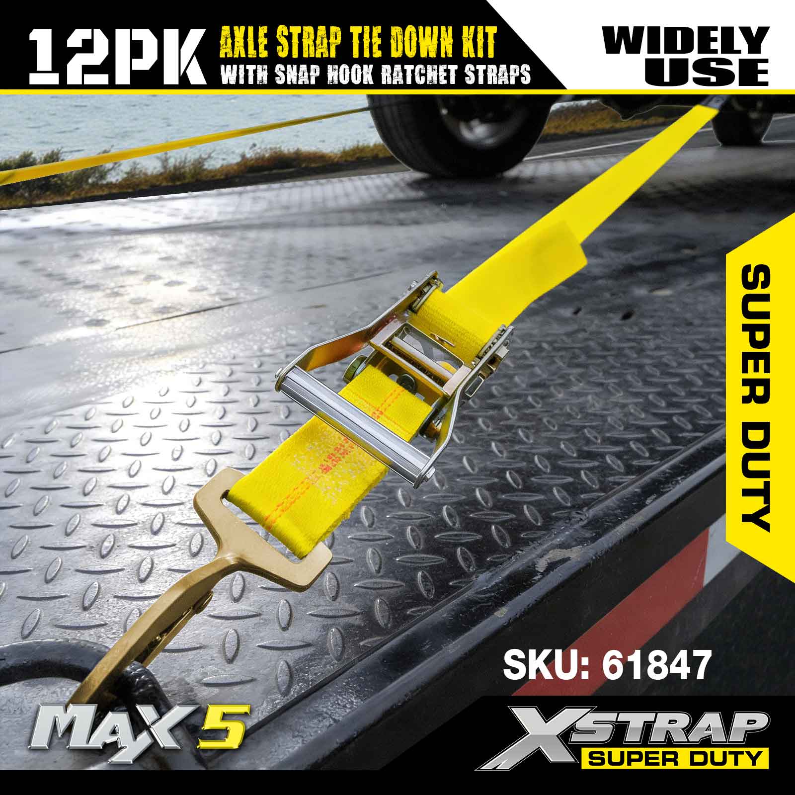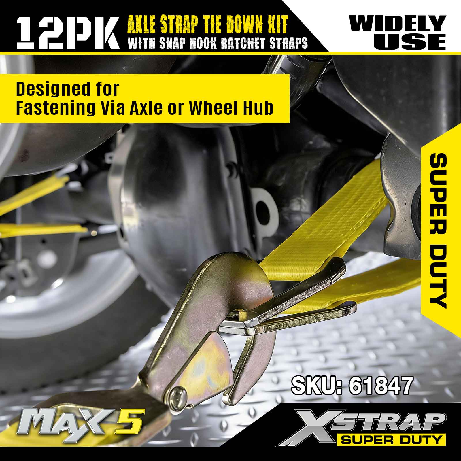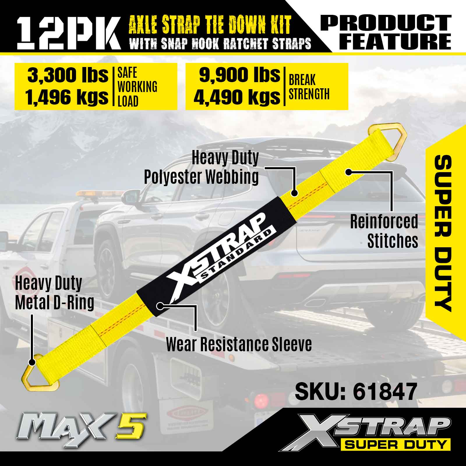 Xstrap 12PK súprava upínacieho popruhu na nápravu (s račňovými popruhmi so západkovým hákom) – Super Duty. Má bezpečnú pracovnú záťaž 3 300 LBS (1 496 kg) a medzu pevnosti 10 000 LBS (4 490 kg).