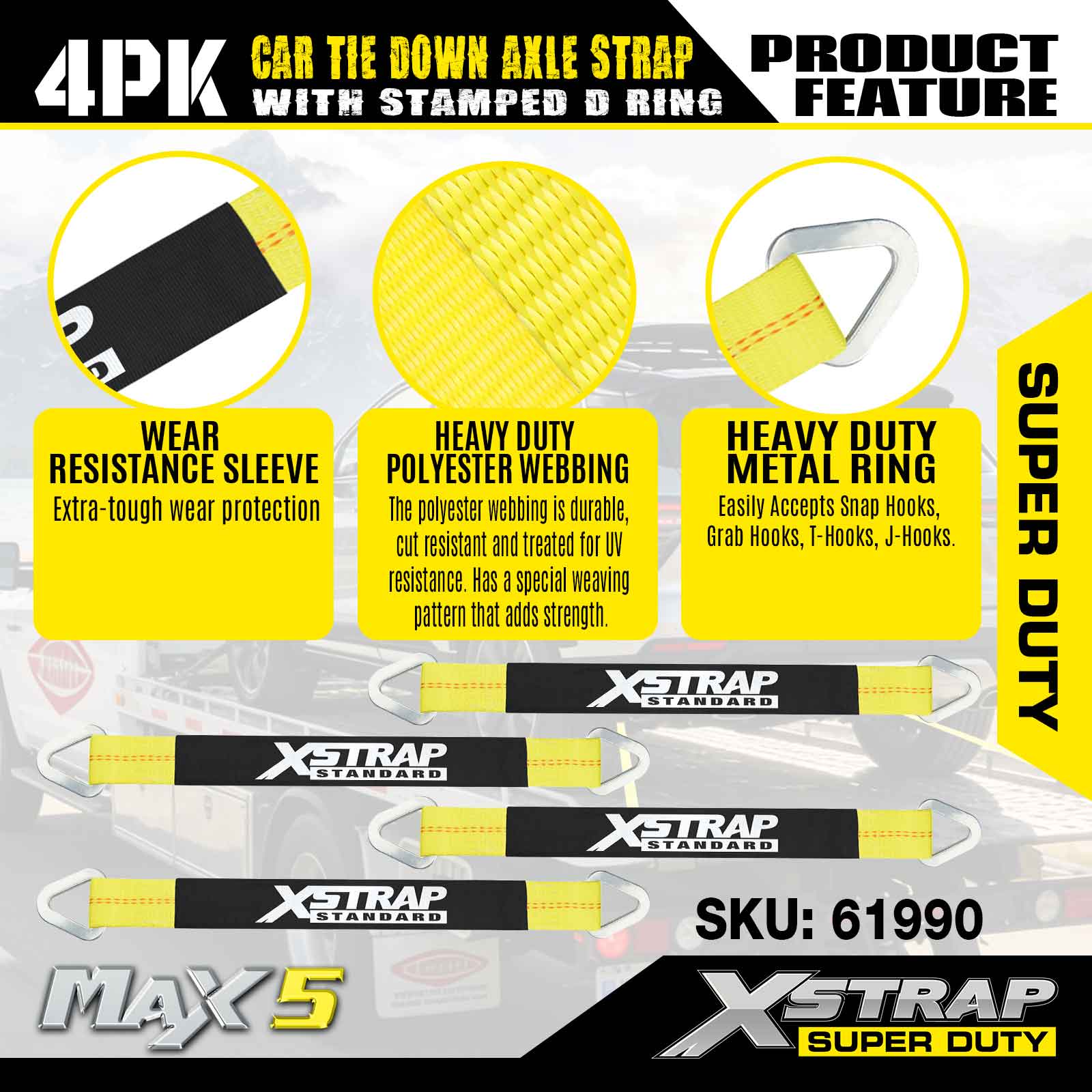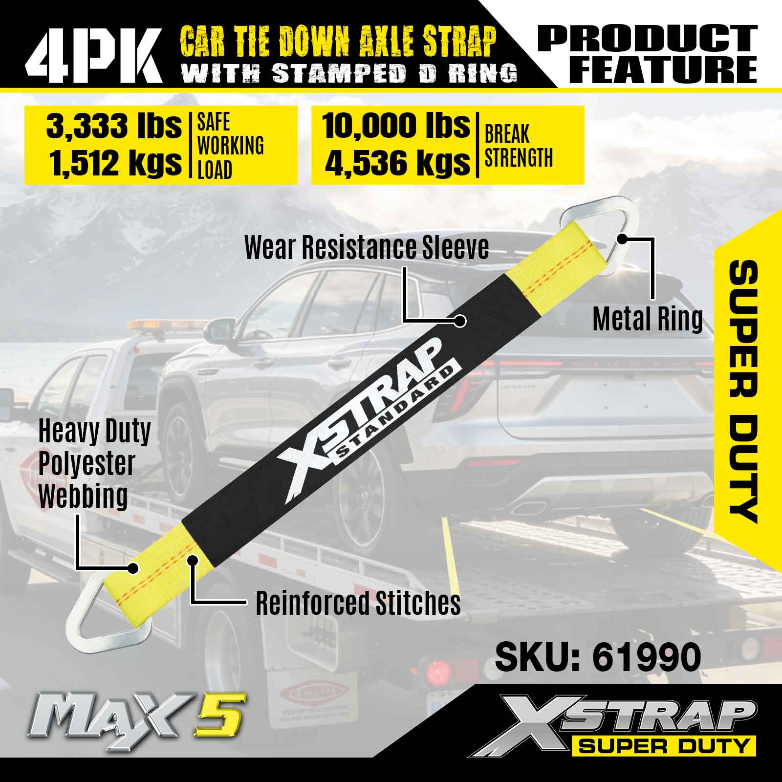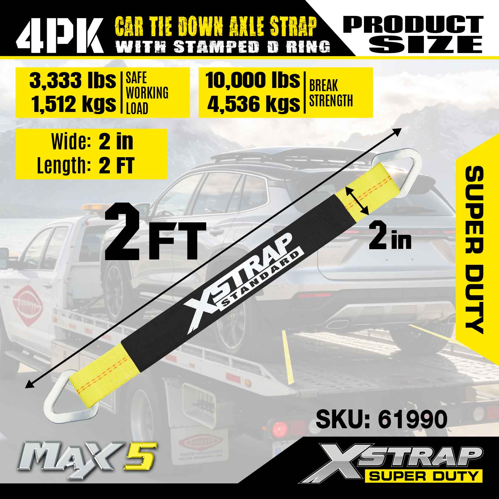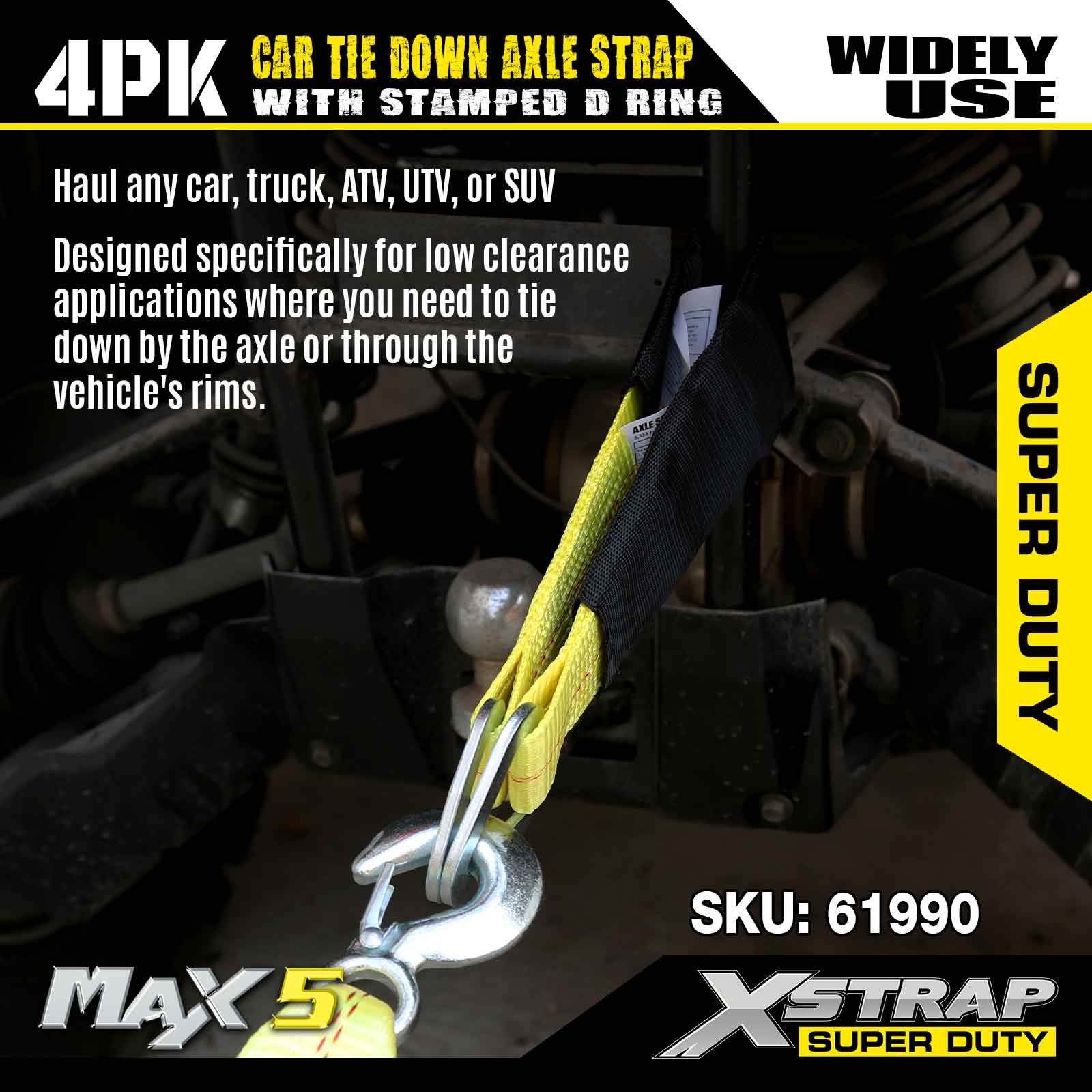 Xstrap 4PK Popruh na ukotvenie nápravy do auta (s vyrazeným D-krúžkom) – Super Duty. Má bezpečnú pracovnú záťaž 3 333 LBS (1 512 kg) a medzu pevnosti 10 000 LBS (4 536 kg).