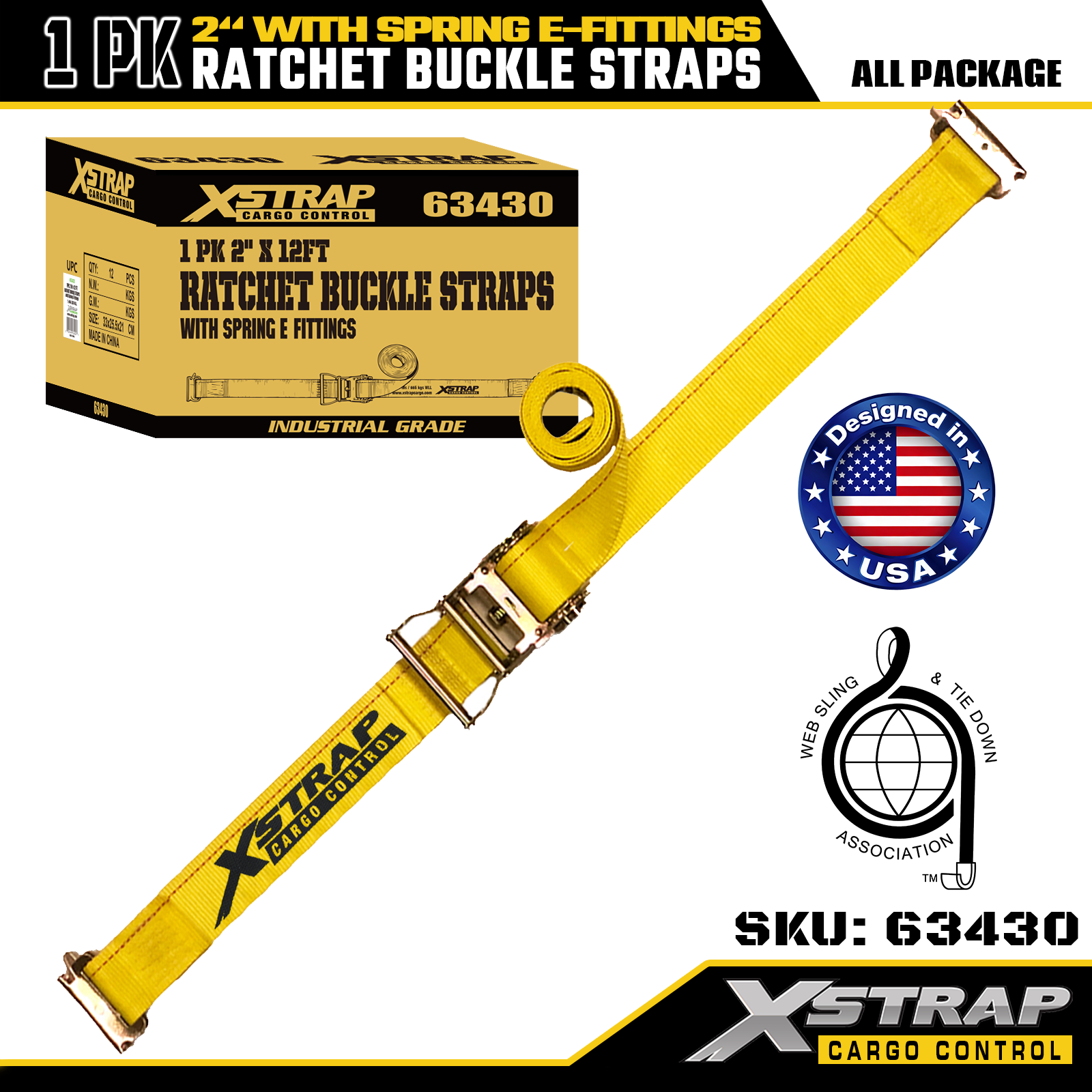 Xstrap 1 balenie polyesterových račňových upínacích popruhov s pružinovým E príslušenstvom, 2" x 12" popruhy na zaistenie nákladu pre ťažký náklad, kapacita 4401 libier (1467 libier) pre nákladné auto, kosačku, štvorkolky