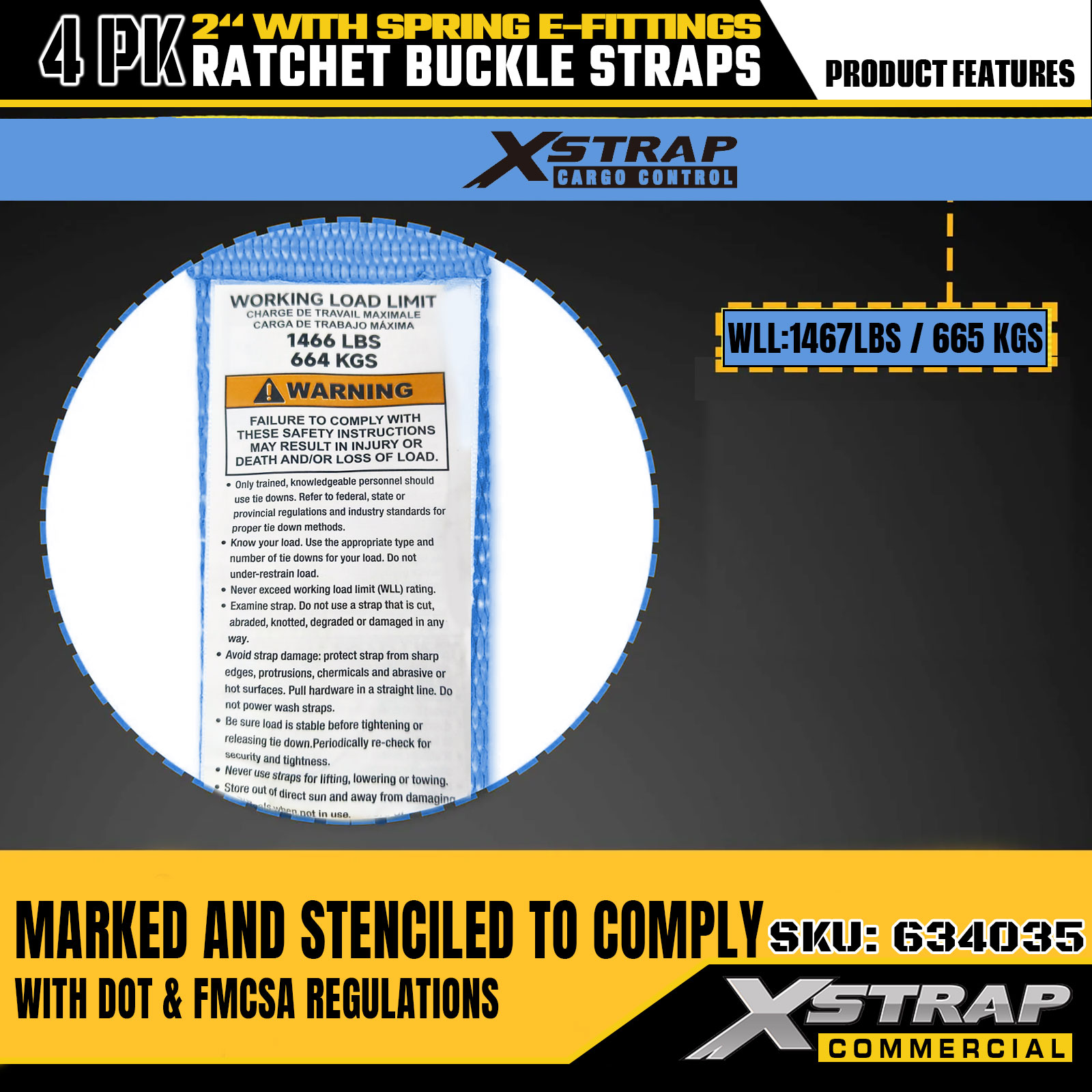 - Jasné štítky SWL a pevnosti pri pretrhnutí na prevenciu preťaženia: Každý popruh je jasne označený bezpečnou pracovnou záťažou 1467 LBS (SWL) a maximálnou pevnosťou v pretrhnutí 4401 LBS, čo poskytuje základné bezpečnostné informácie, aby sa zabránilo preťaženiu.