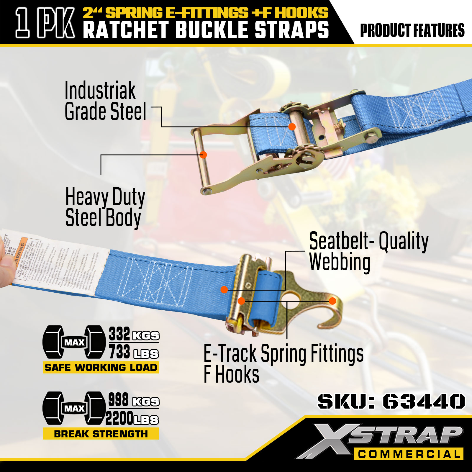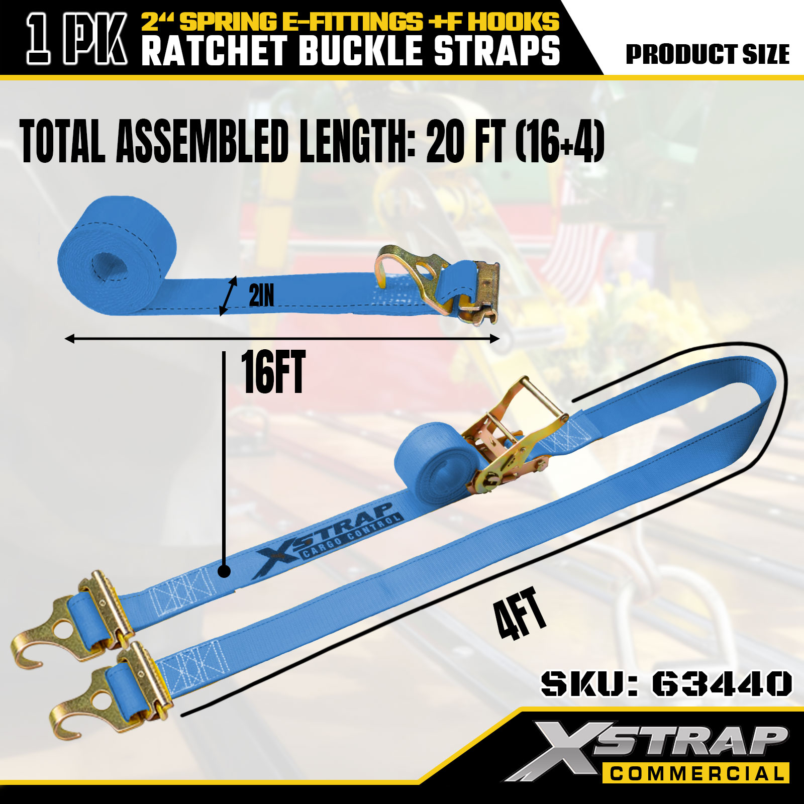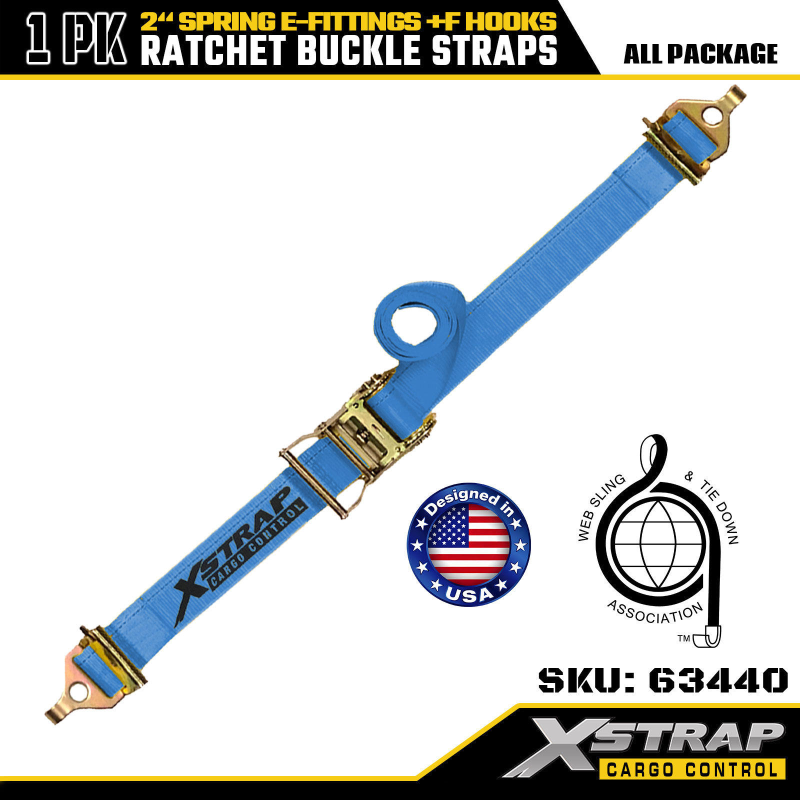 Xstrap 63440 Heavy-Duty Ratchet Strap 2" x 20' (1PK) - Modrý popruh, pružinové E-fitingy a F háčiky, 733 libier SWL na sťahovanie, prepravu nákladu a použitie v kamiónoch