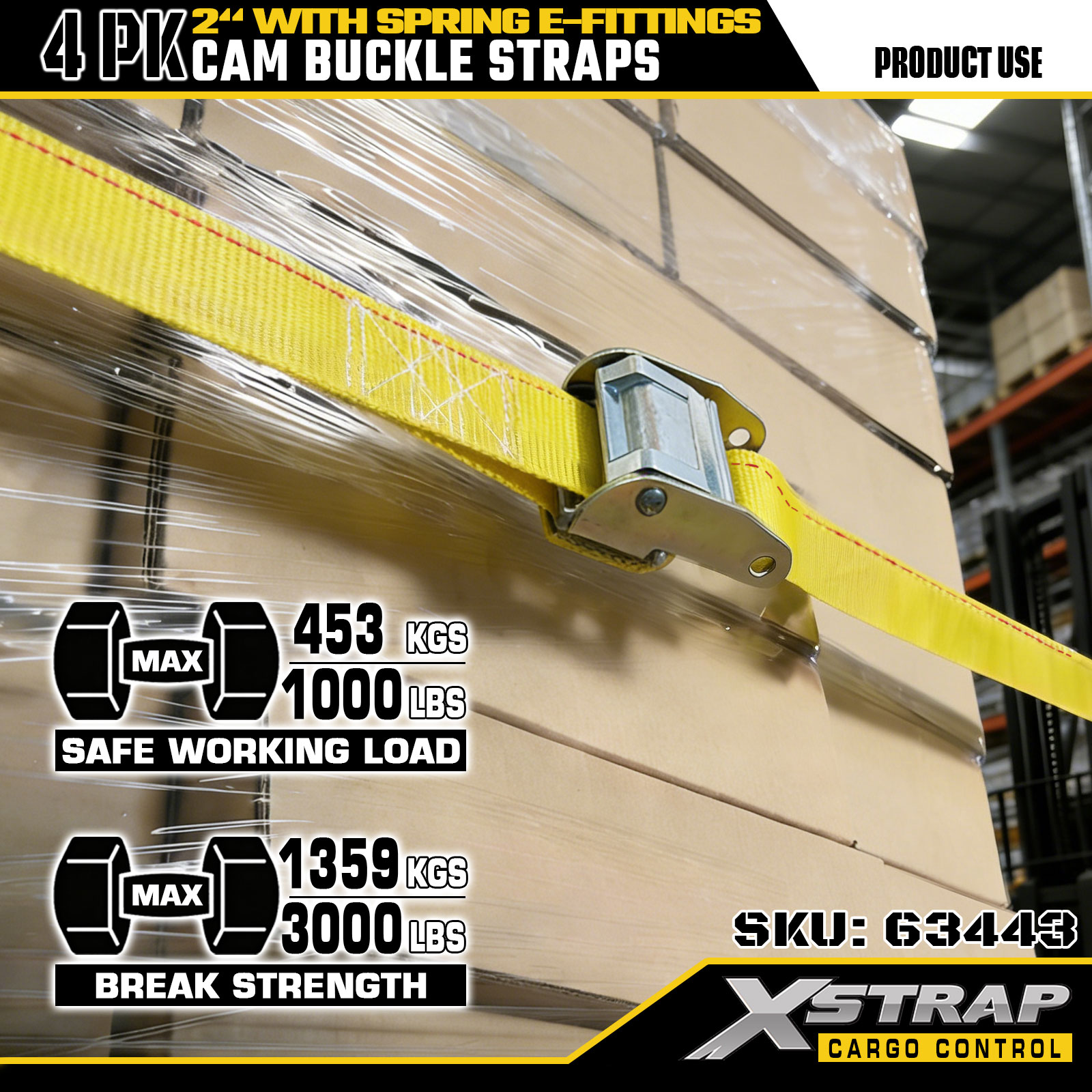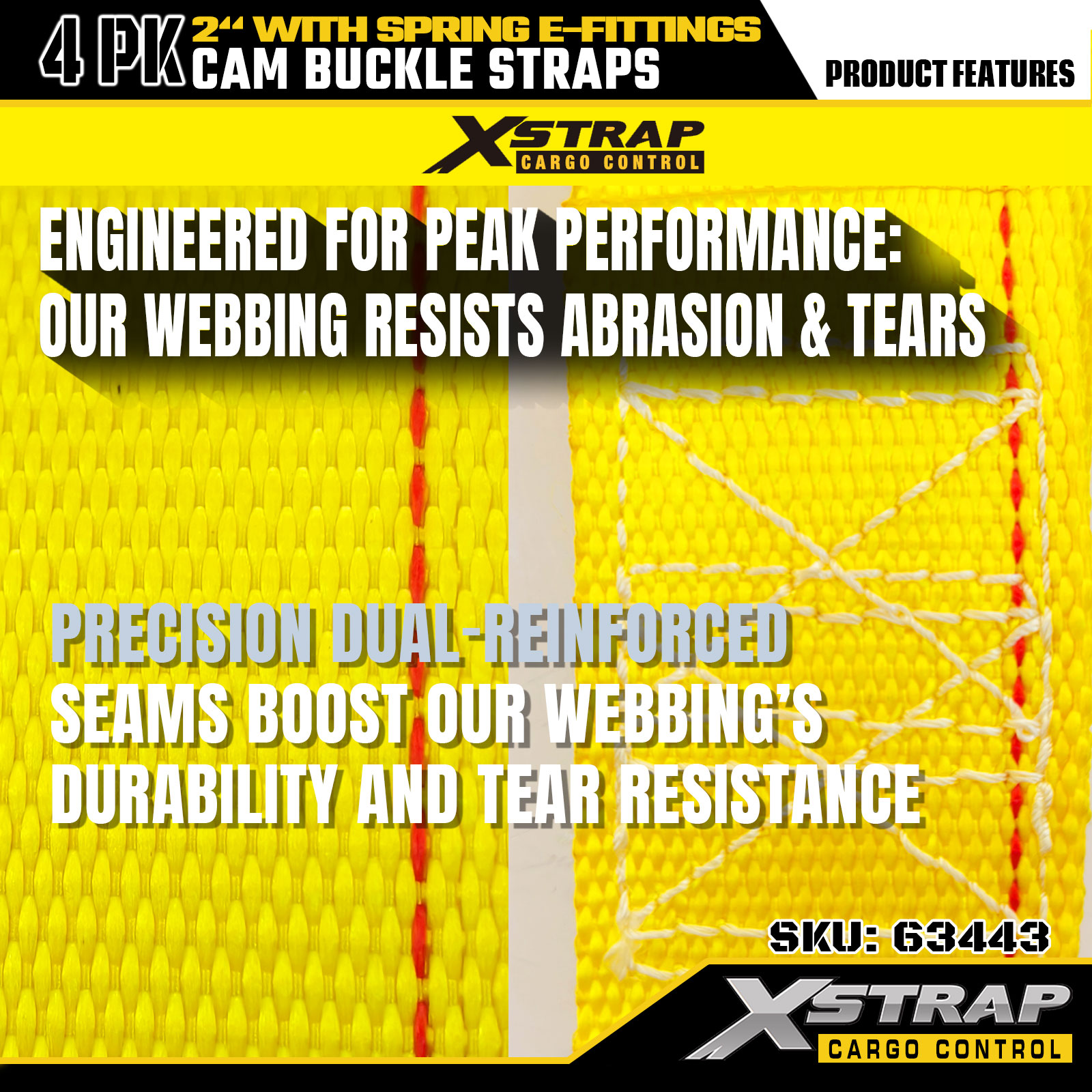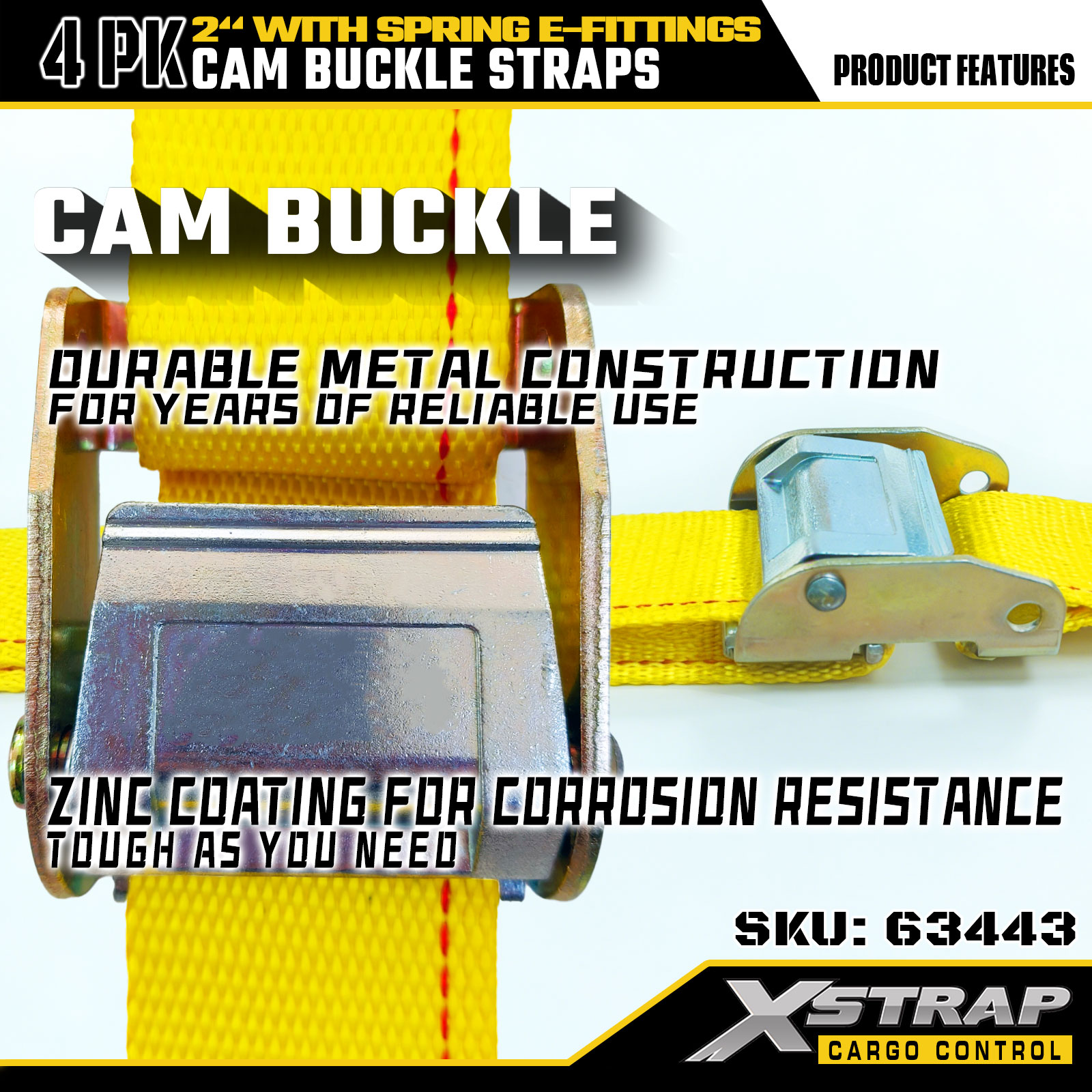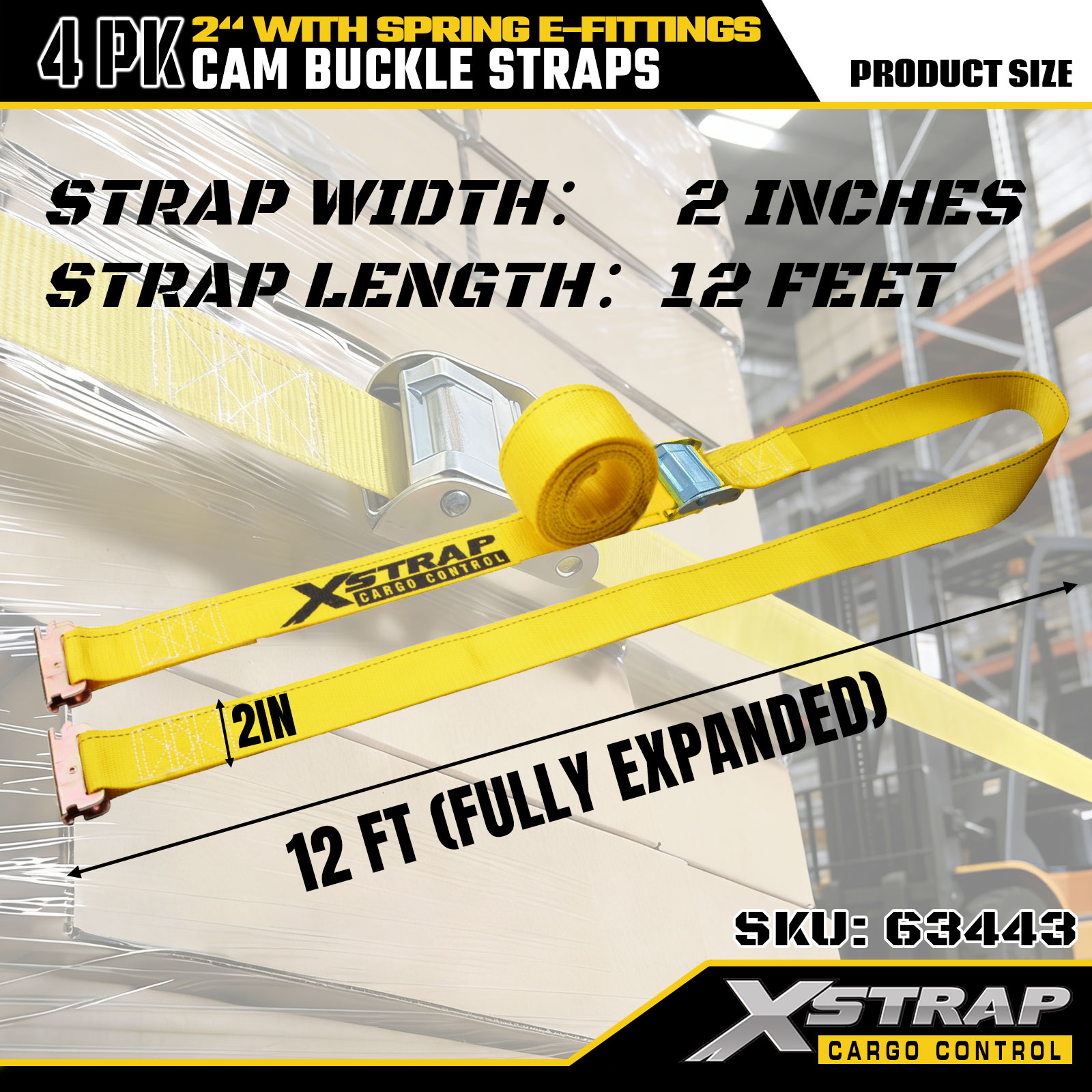 Xstrap 63443 4 balenie 2" x 12" žlté remienky s vačkovou sponou s pružinovým E-fitingom, 1000 libier SWL & 453 libier medza pevnosti pre manipuláciu s nákladom, premiestňovanie a prepravu