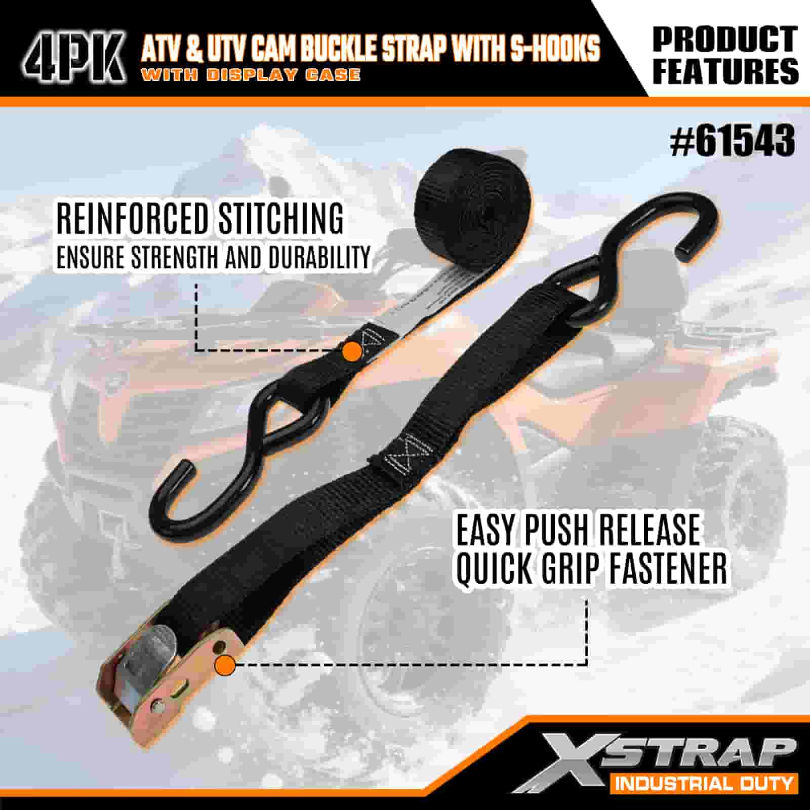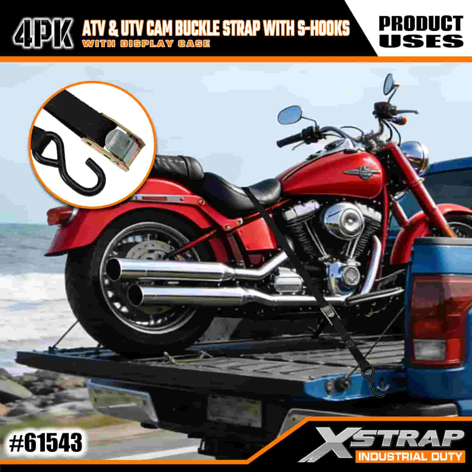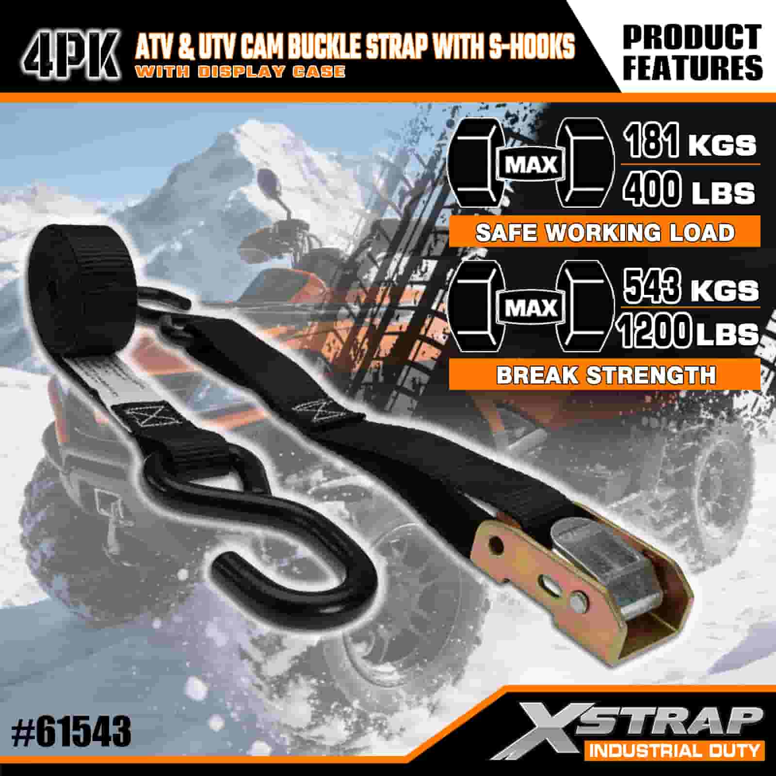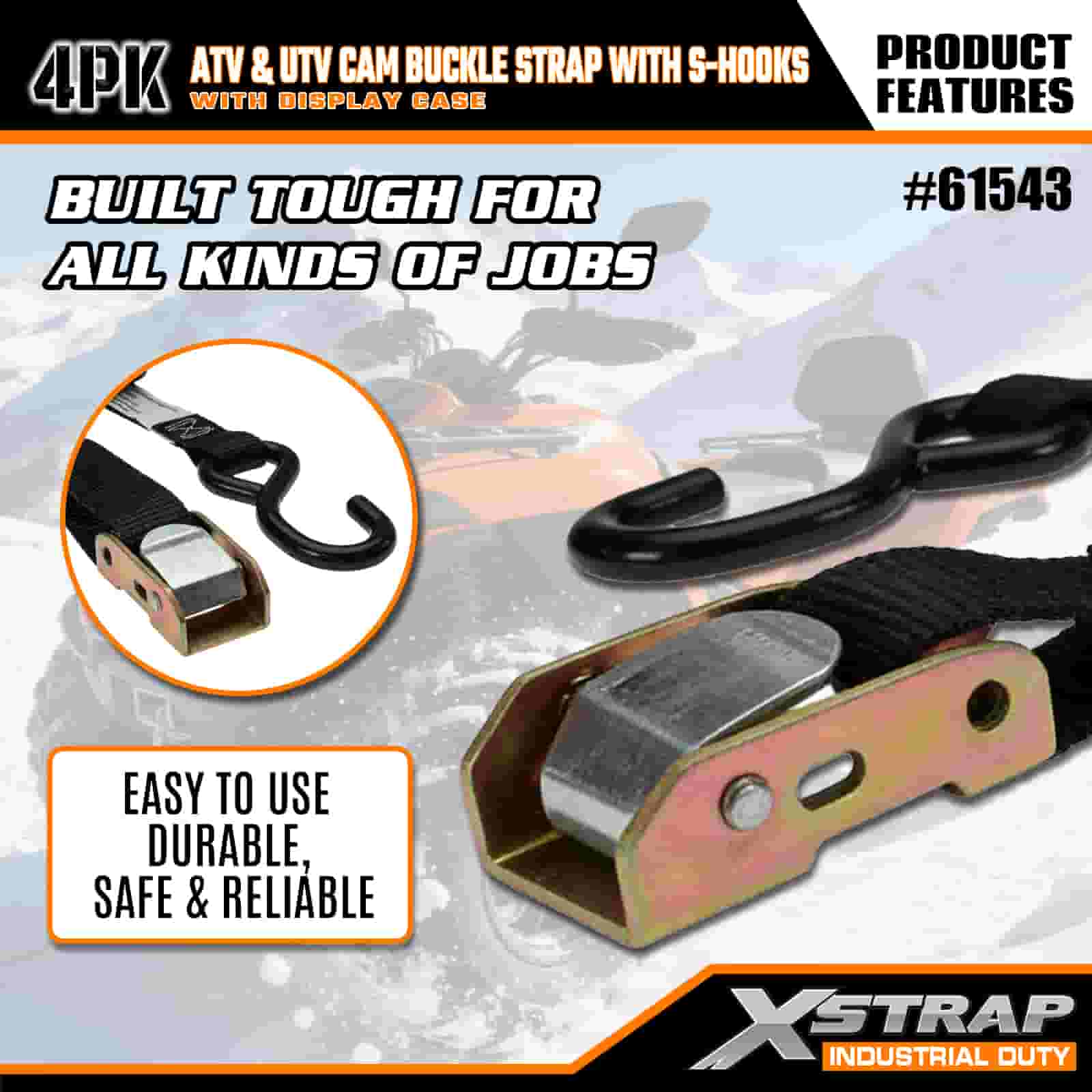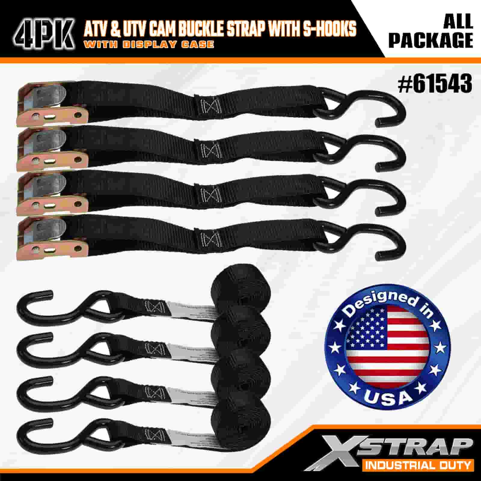 Xstrap 4PK Remienok s prackou na štvorkolku a AUV s háčikmi v tvare S, 1" x 6" polyesterový popruh s upínacím popruhom s račňou, popruhy na upevnenie nákladu s kapacitou 400 libier s háčikom S pre serióznych profesionálov na zabezpečenie nákladného prívesu, prívesu na plošinu, malého auta, lyžiarskeho prívesu.