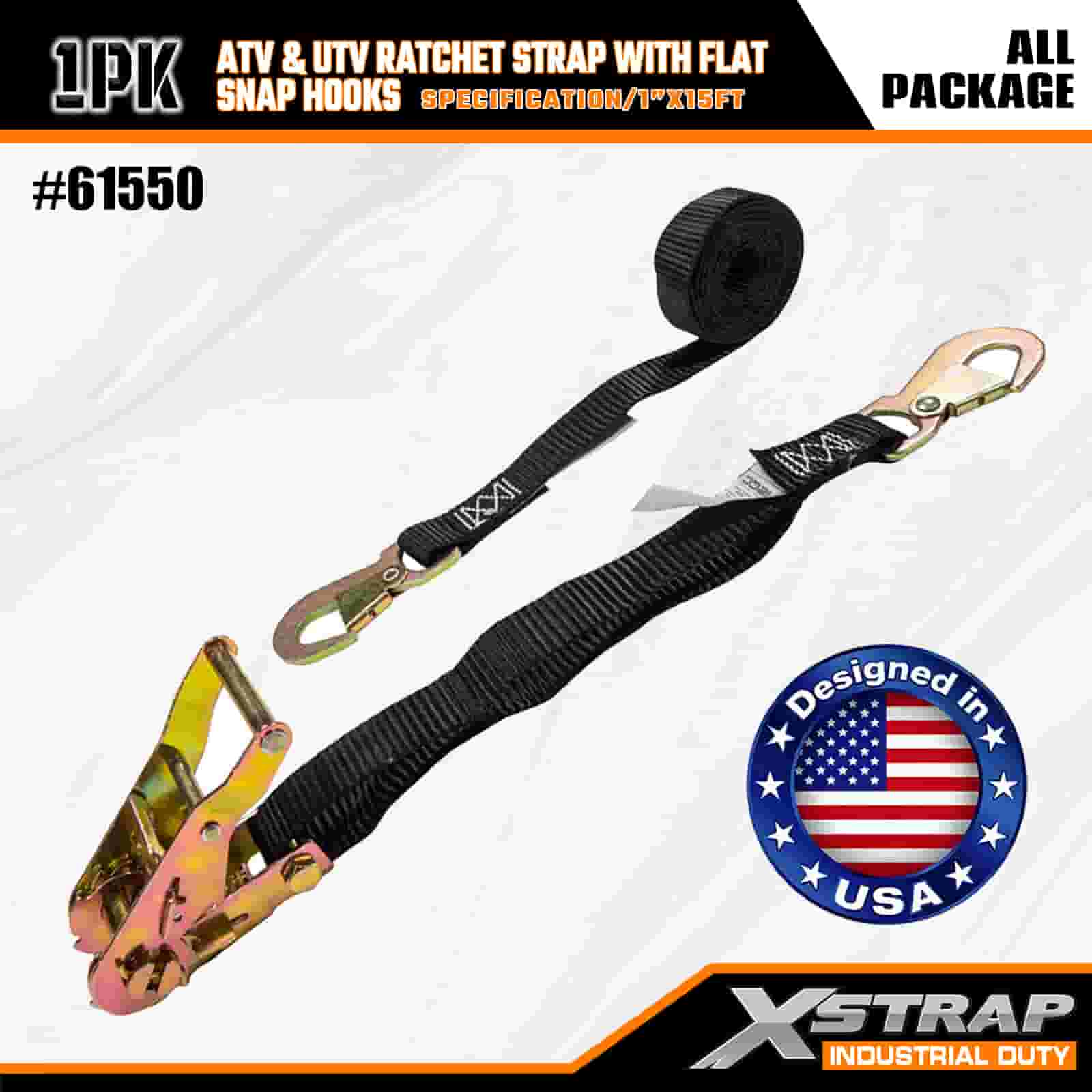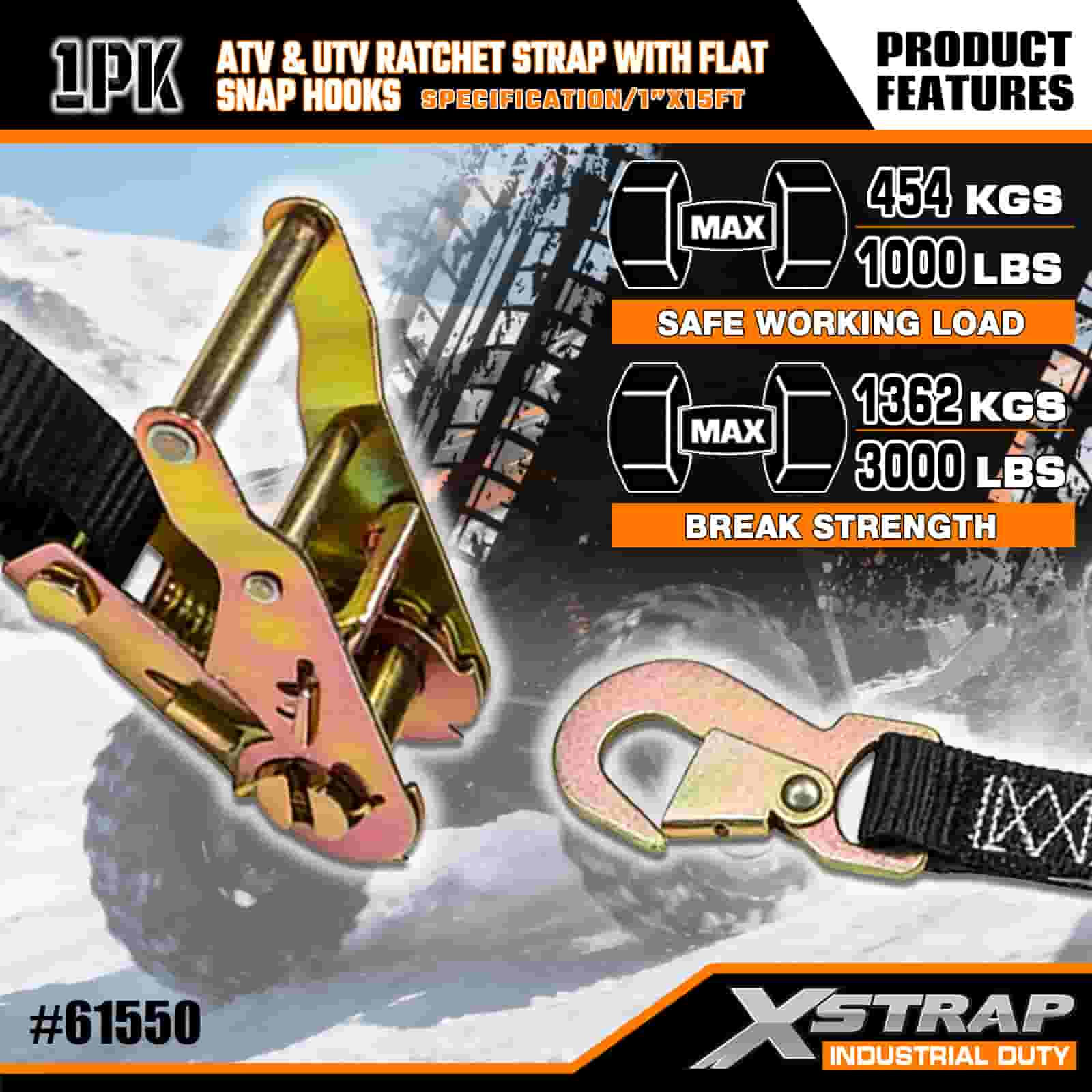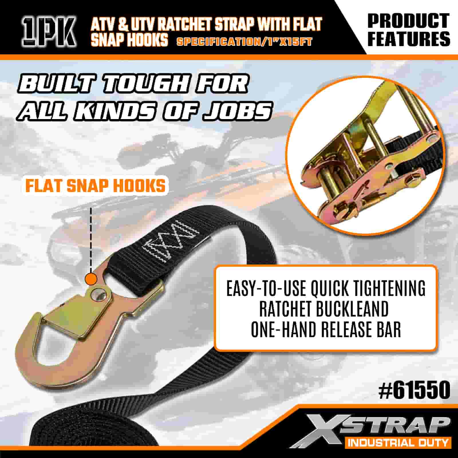 Xstrap ATV a AUV račňový popruh s plochými patentnými háčikmi, 1” x 15' polyesterový remienok s račňou, popruhy na upevnenie nákladu s kapacitou 1 000 libier s plochým uzáverom pre príves, plochý príves lyžiarsky čln, malé auto, ťažké vybavenie.