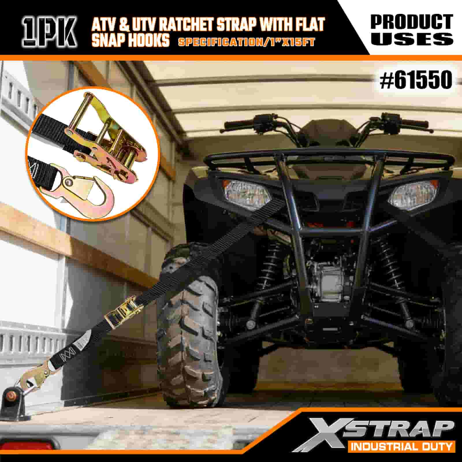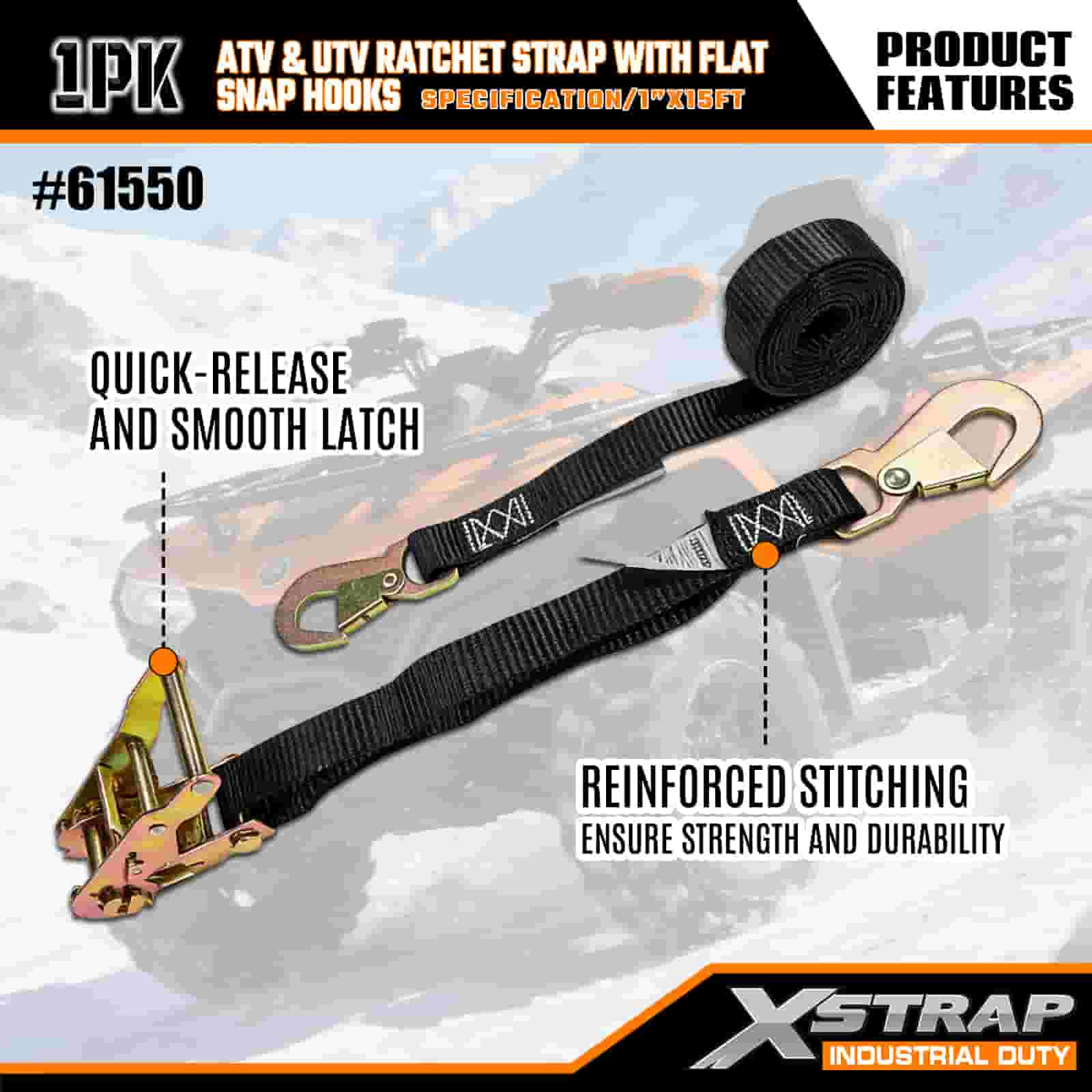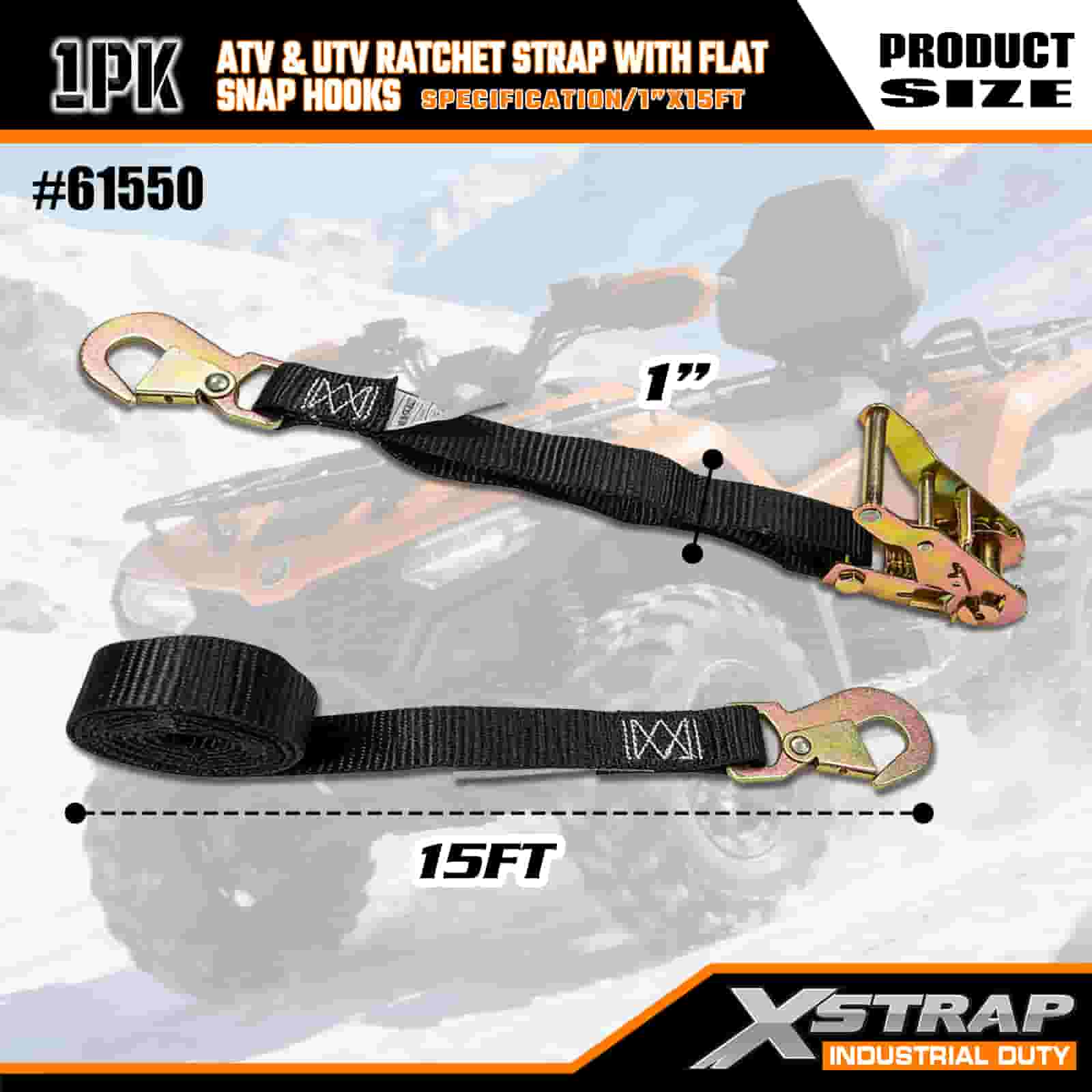 Xstrap ATV a AUV račňový popruh s plochými patentnými háčikmi, 1” x 15' polyesterový remienok s račňou, popruhy na upevnenie nákladu s kapacitou 1 000 libier s plochým uzáverom pre príves, plochý príves lyžiarsky čln, malé auto, ťažké vybavenie.