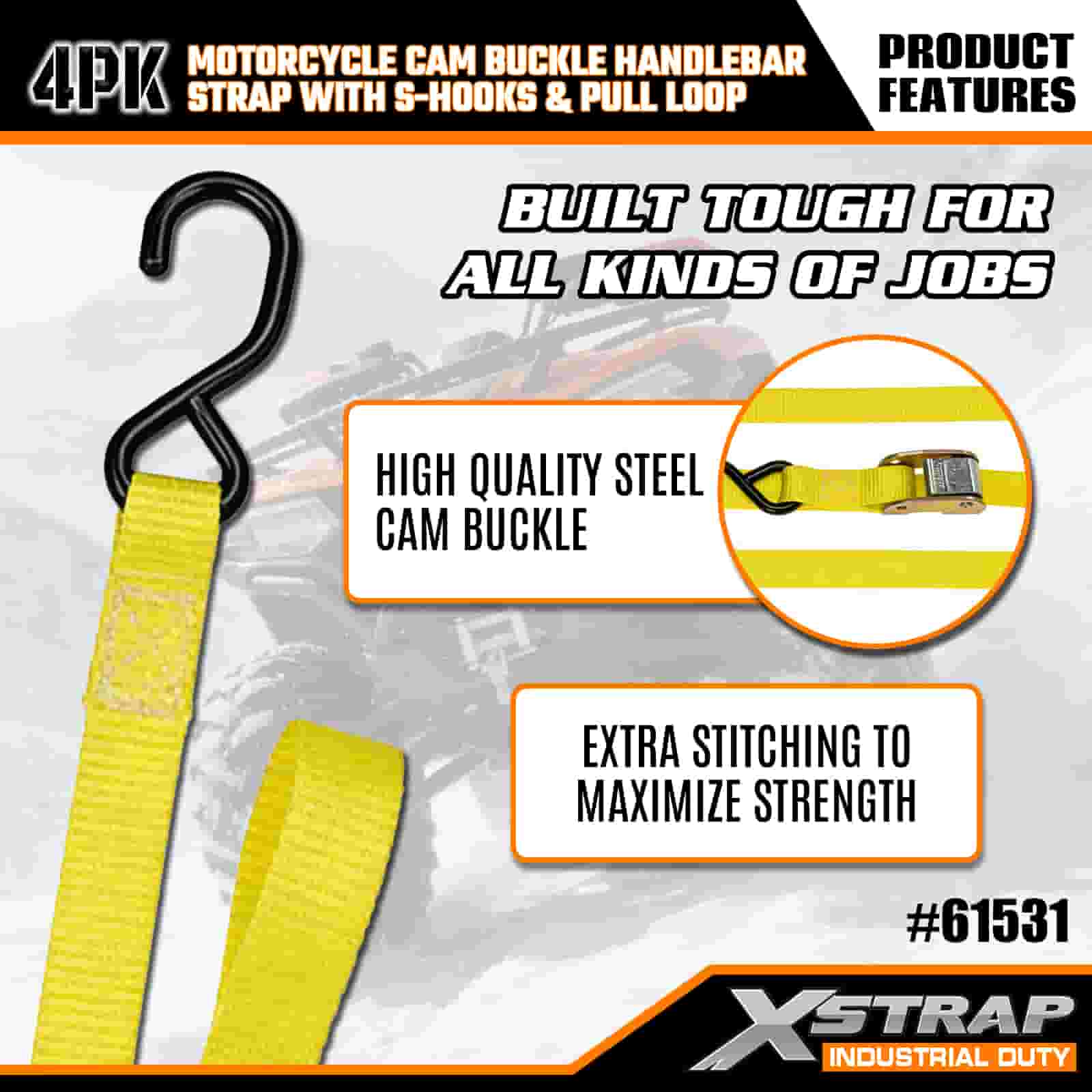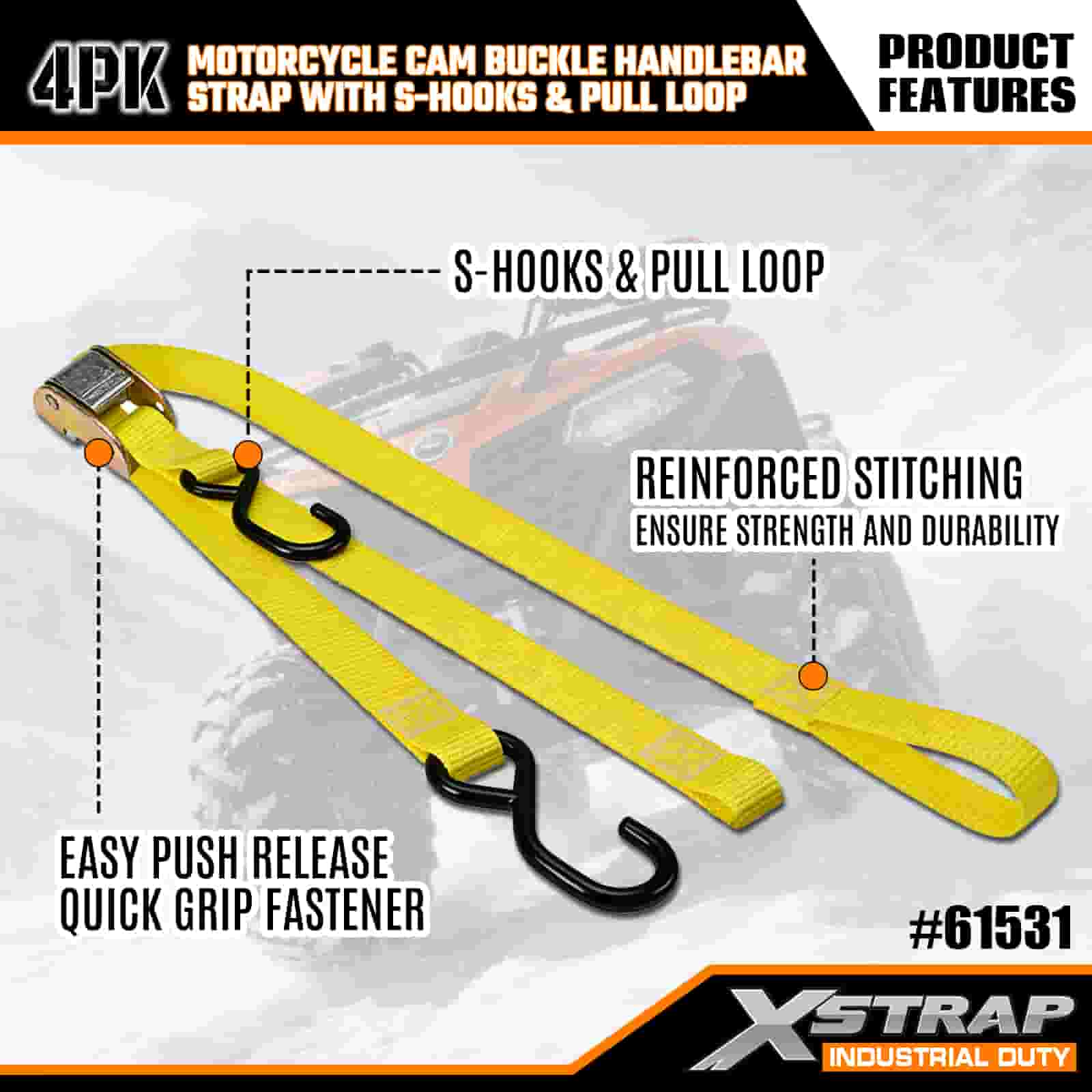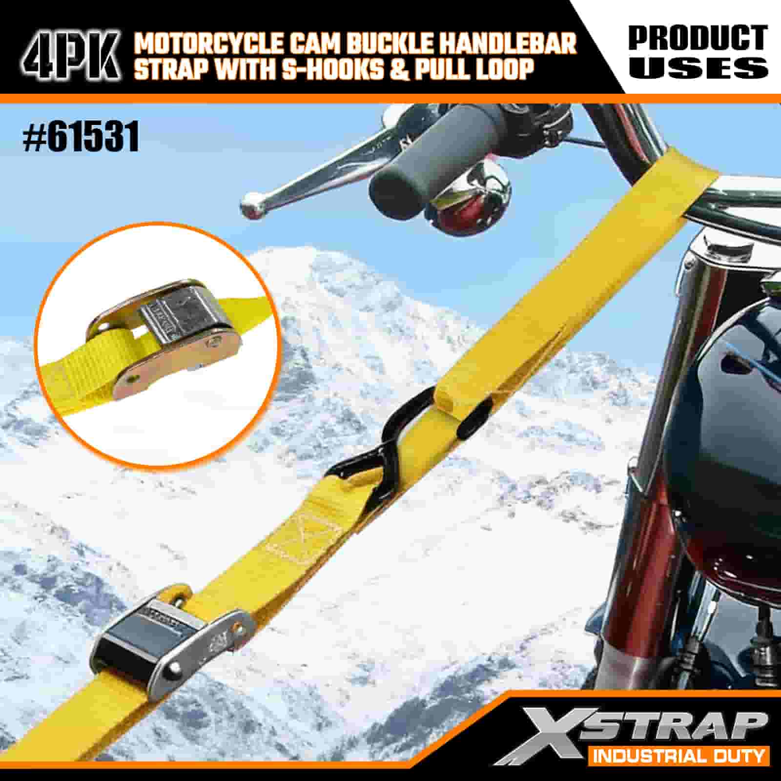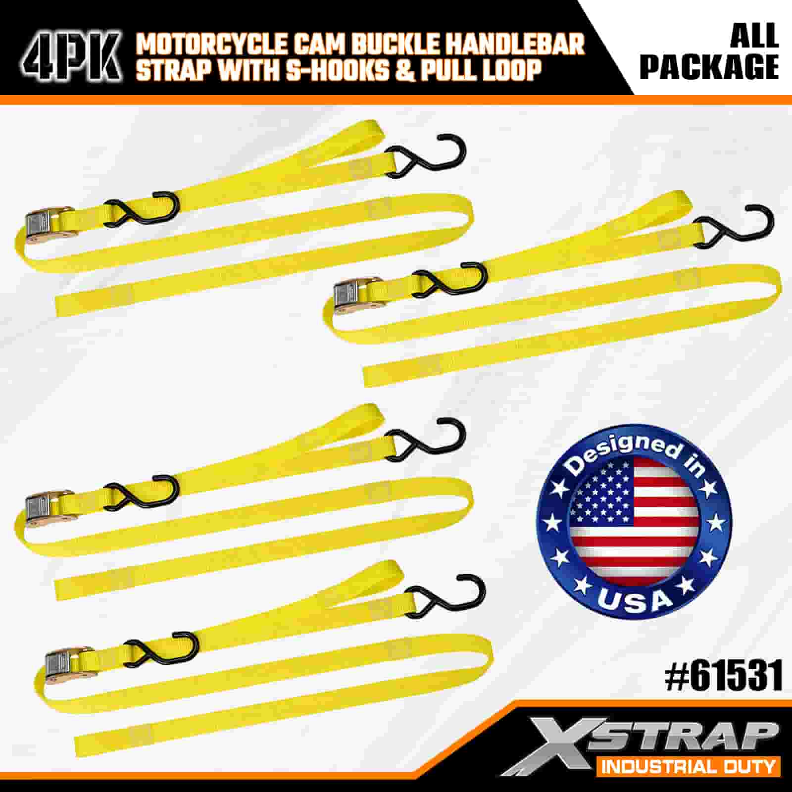 Xstrap 4PK Motocykel Cam Buck Remienok na riadidlá s S háčikmi a sťahovacou slučkou, 1" x 6" Polyesterový upínací popruh Vyťahovací Cam Buckle popruh, Kapacita 400 libier Upevňovacie popruhy nákladu s S háčikmi pre seriózneho profesionála na zaistenie nákladného prívesu, plochého prívesu, malého auta. Lyžiarsky čln