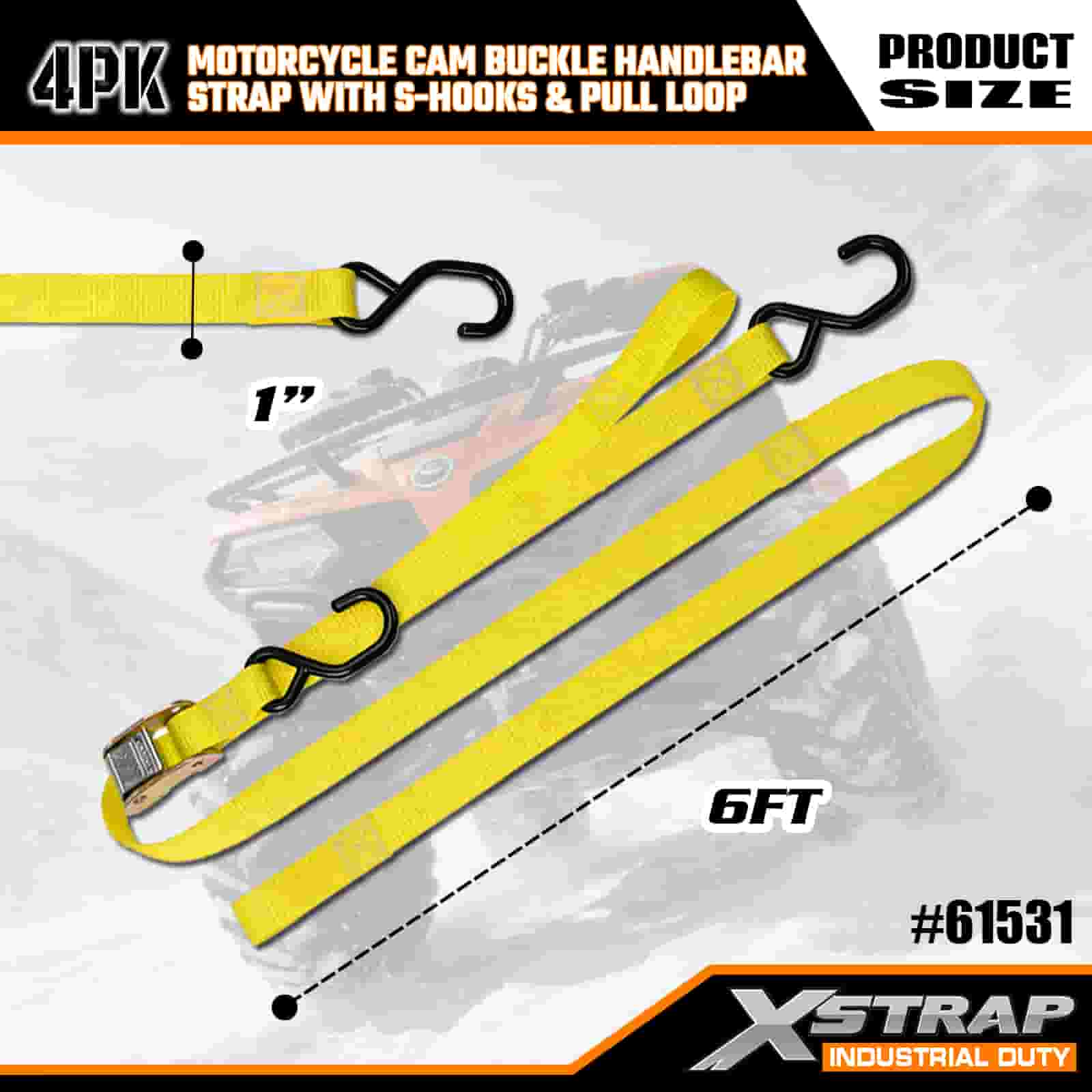 - 4-balenie 6FT popruhov na použitie na motocykli: Predáva sa ako sada 4 popruhov (šírka 1 palec × 6 stôp na dĺžku), ideálne na upevnenie motocyklov, riadidiel a malých zariadení v nákladných autách alebo počas prepravy.