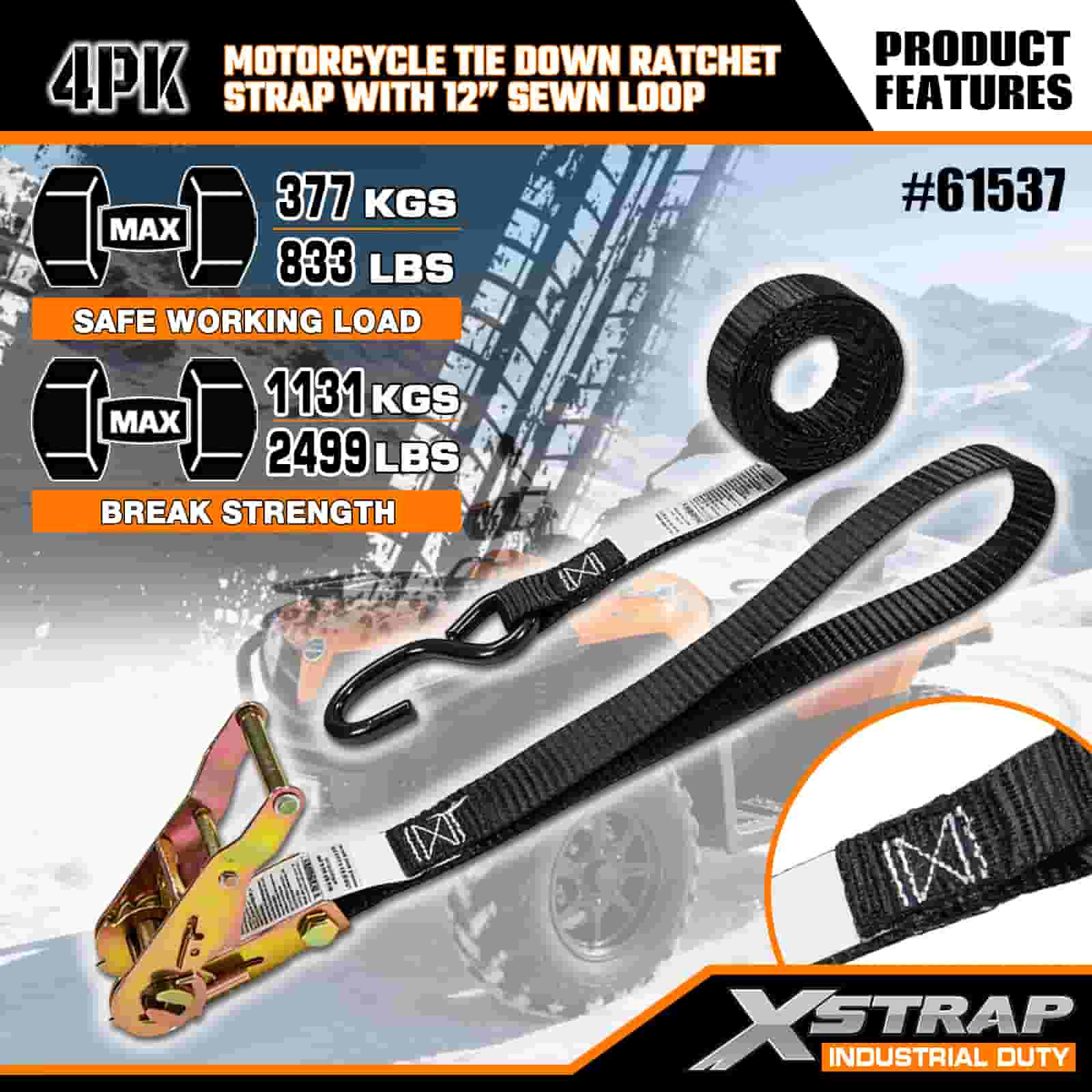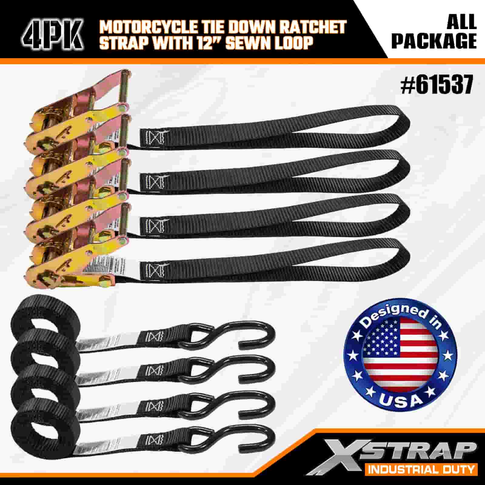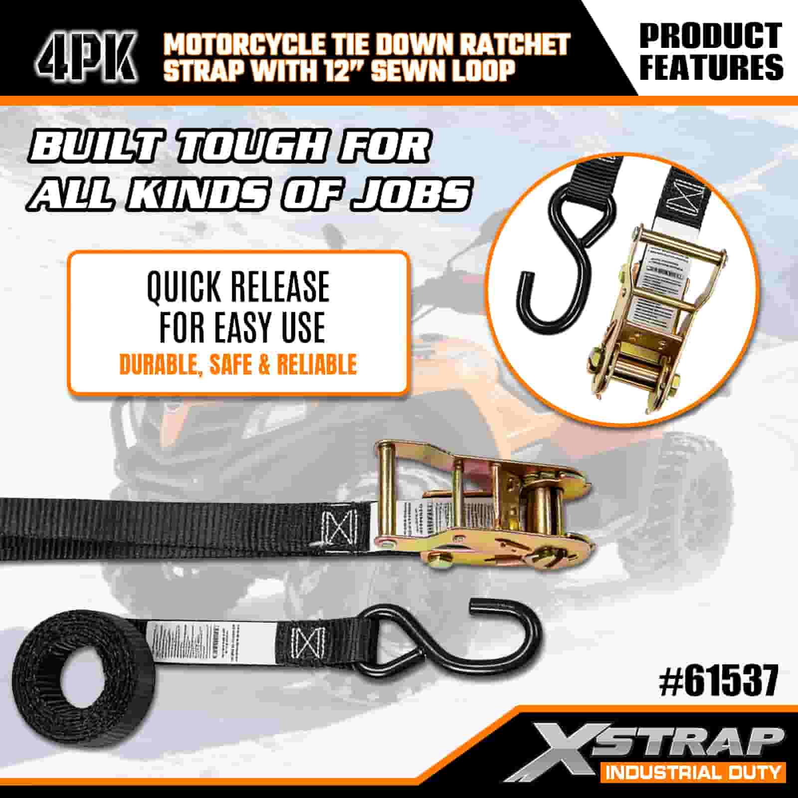 Xstrap 4PK Remienok na uchytenie motocykla s 12” našitou slučkou, 1” x 6” Polyesterový popruh s račňou, popruhy na upevnenie nákladu s kapacitou 833 libier s háčikom S pre serióznych profesionálov na zabezpečenie nákladného prívesu, prívesu s plochým lôžkom, malého auta, lyžiarskeho člna.