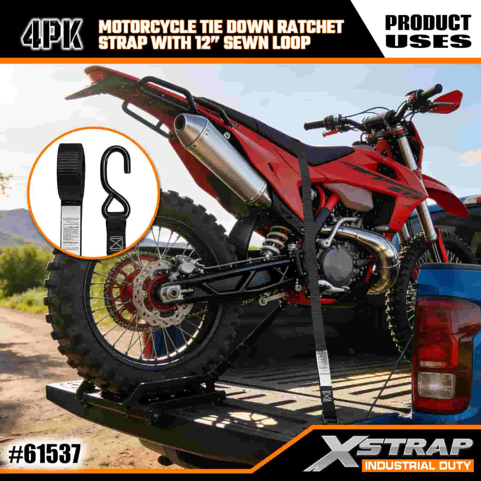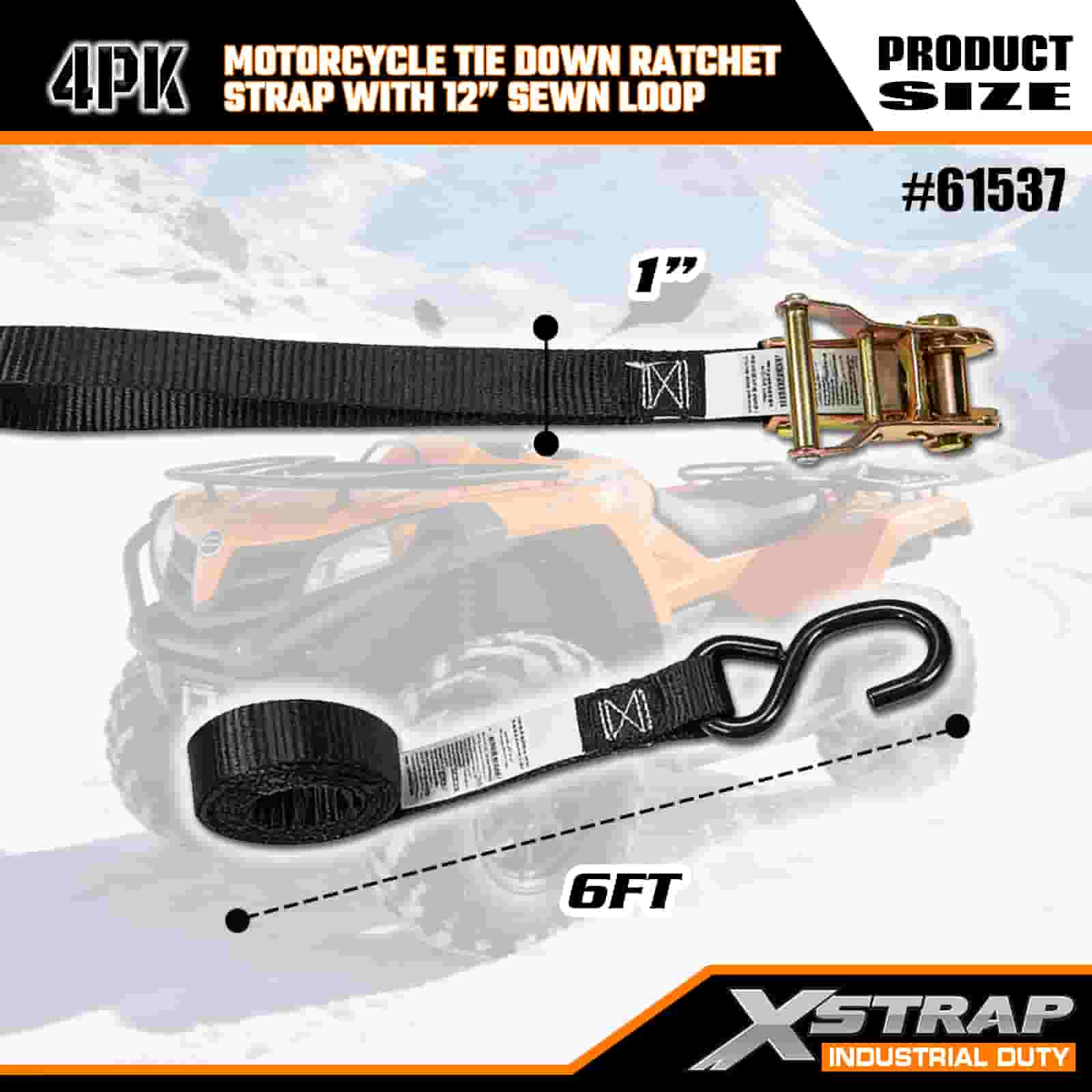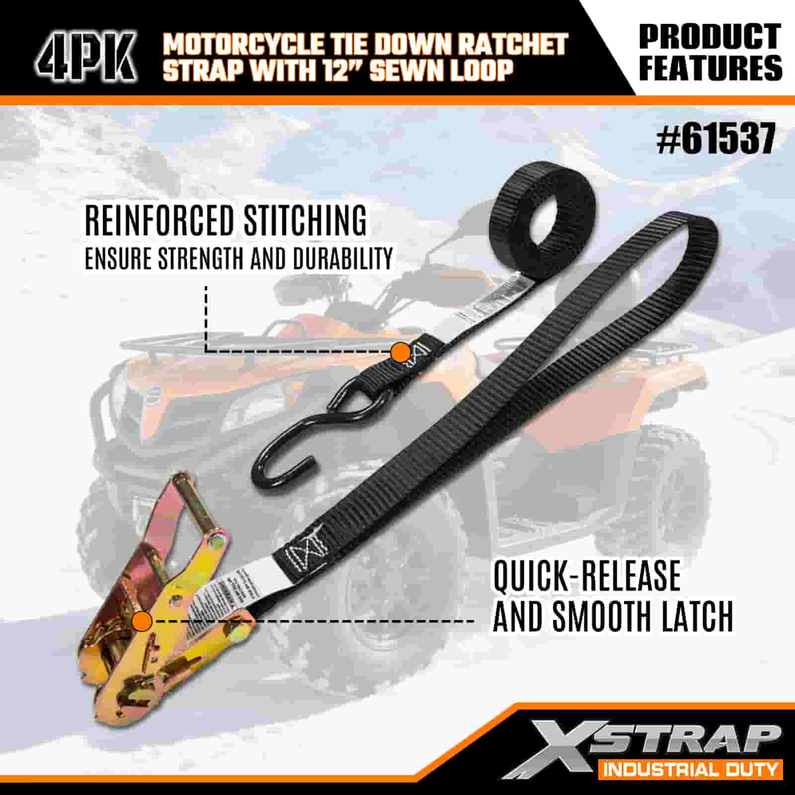 Xstrap 4PK Remienok na uchytenie motocykla s 12” našitou slučkou, 1” x 6” Polyesterový popruh s račňou, popruhy na upevnenie nákladu s kapacitou 833 libier s háčikom S pre serióznych profesionálov na zabezpečenie nákladného prívesu, prívesu s plochým lôžkom, malého auta, lyžiarskeho člna.