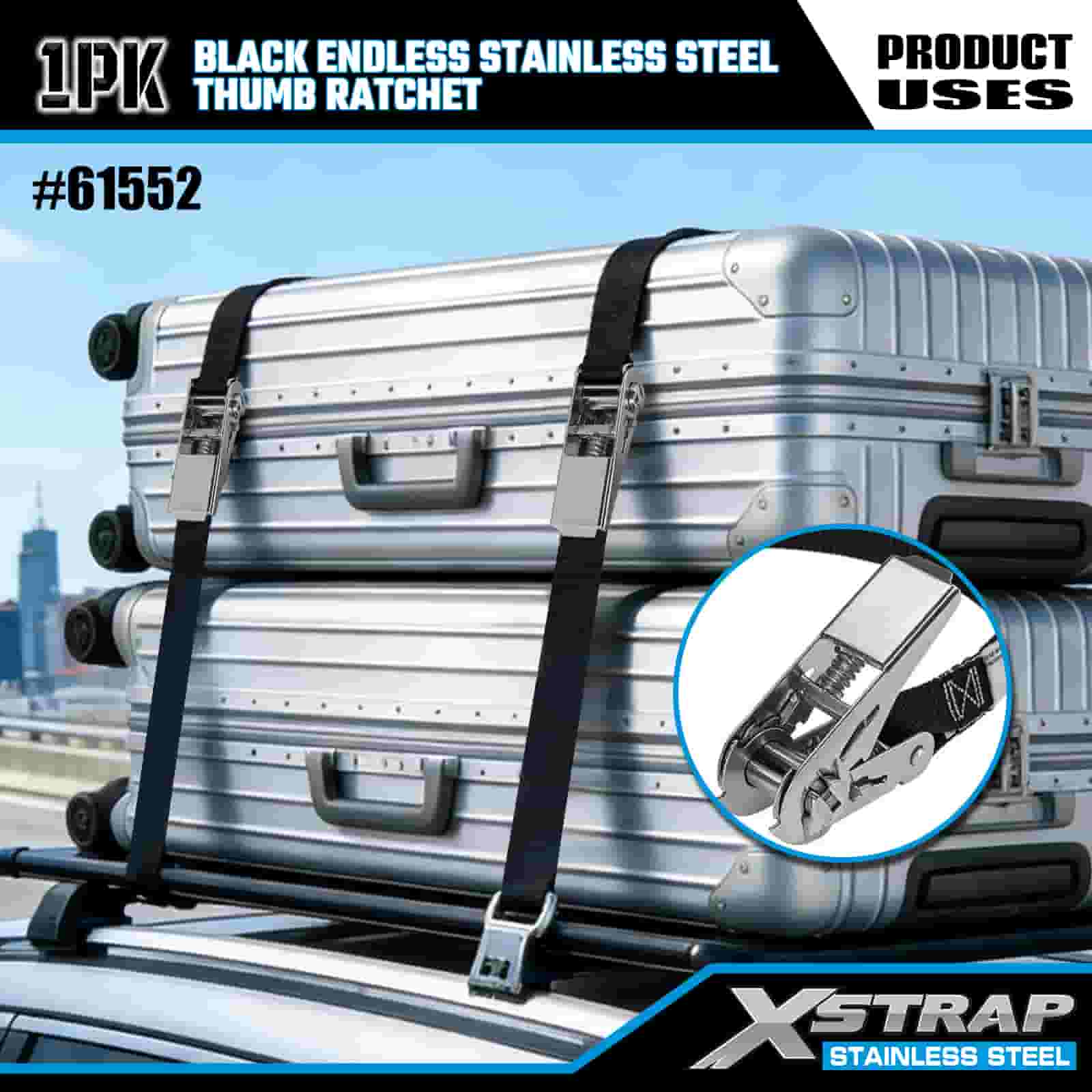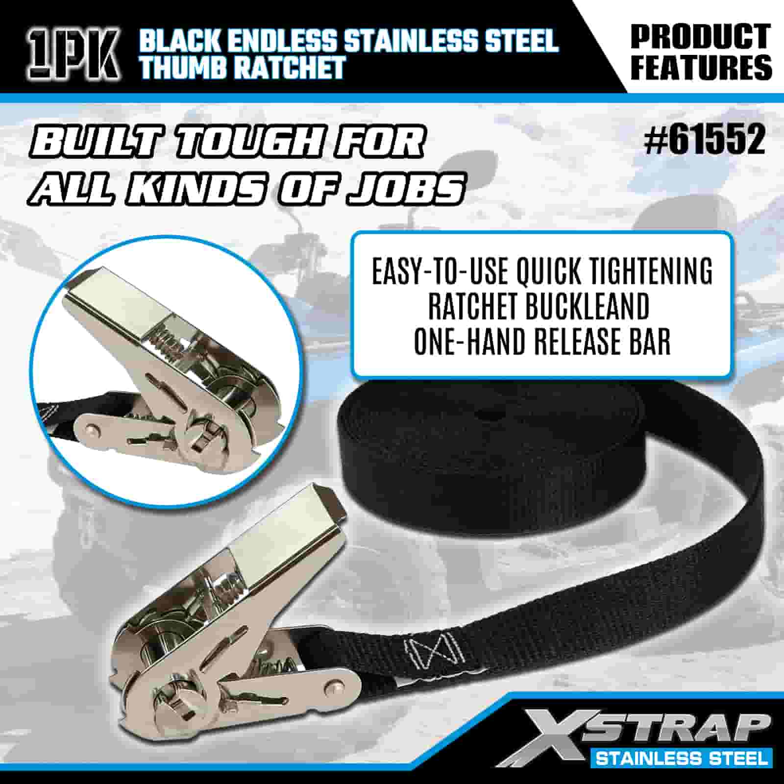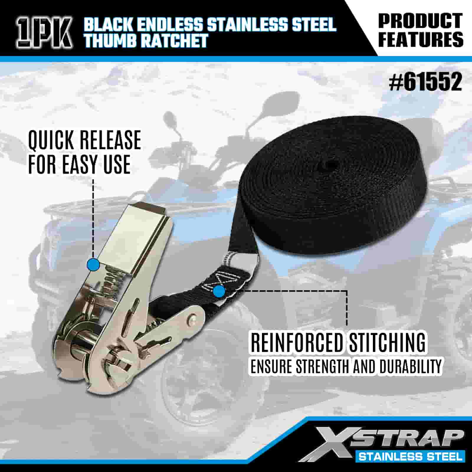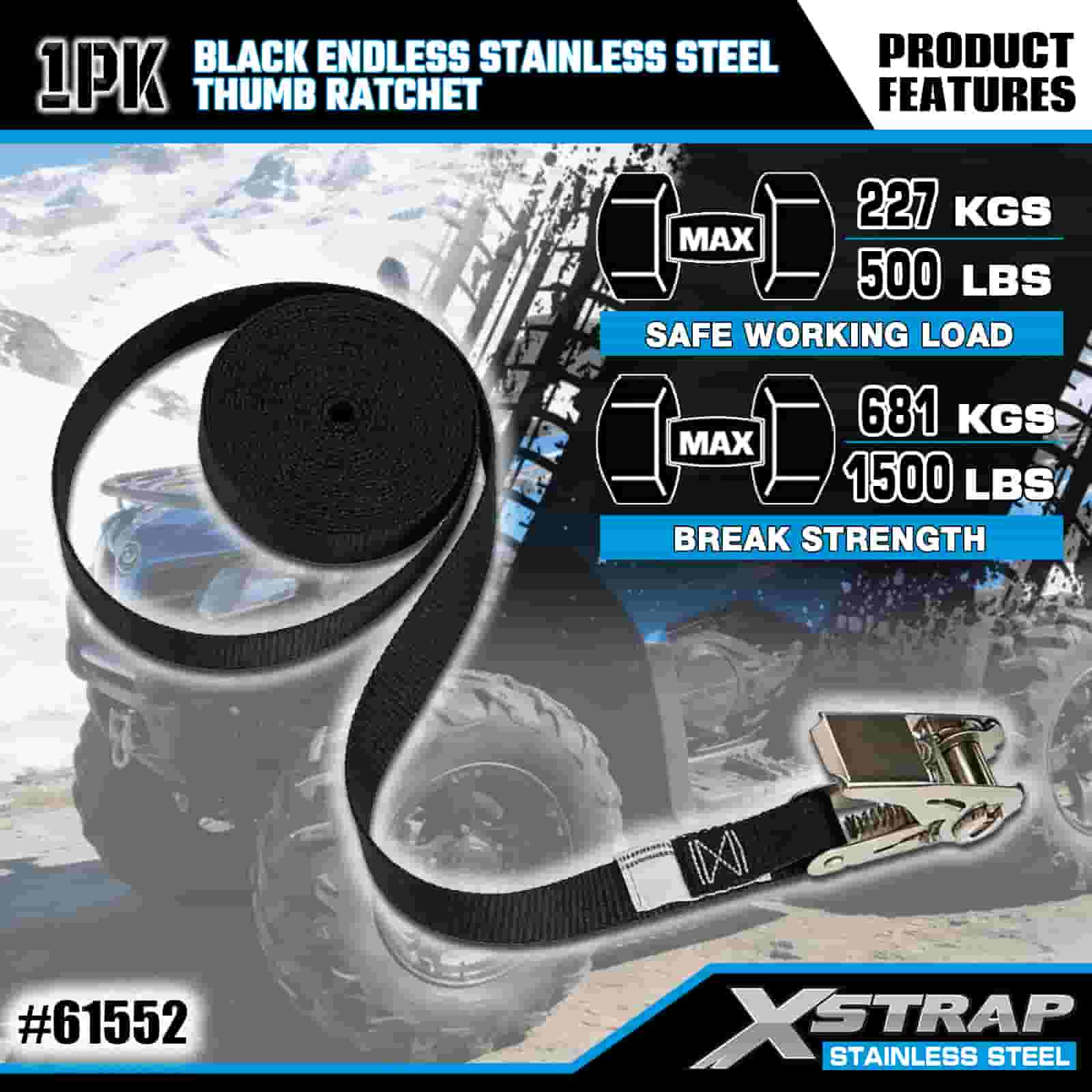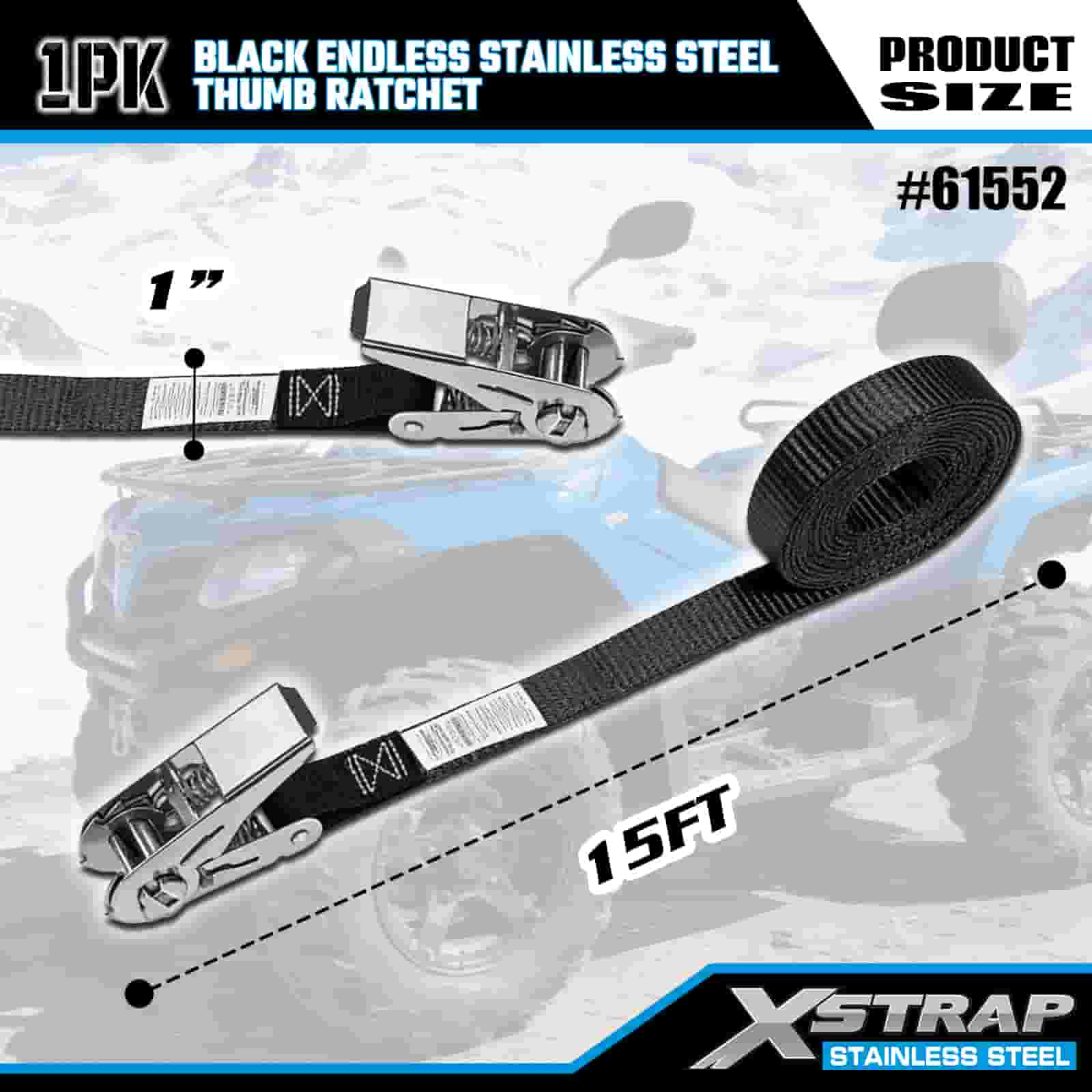 Xstrap Čierna Endless Stainless Steel Thumb Ratchet, 1" x 15" Polyesterový remienok s račňou, 500 lbs kapacitné popruhy na upevnenie nákladu pre príves, lyžiarsky čln s plochým prívesom, malé auto, ťažké vybavenie.