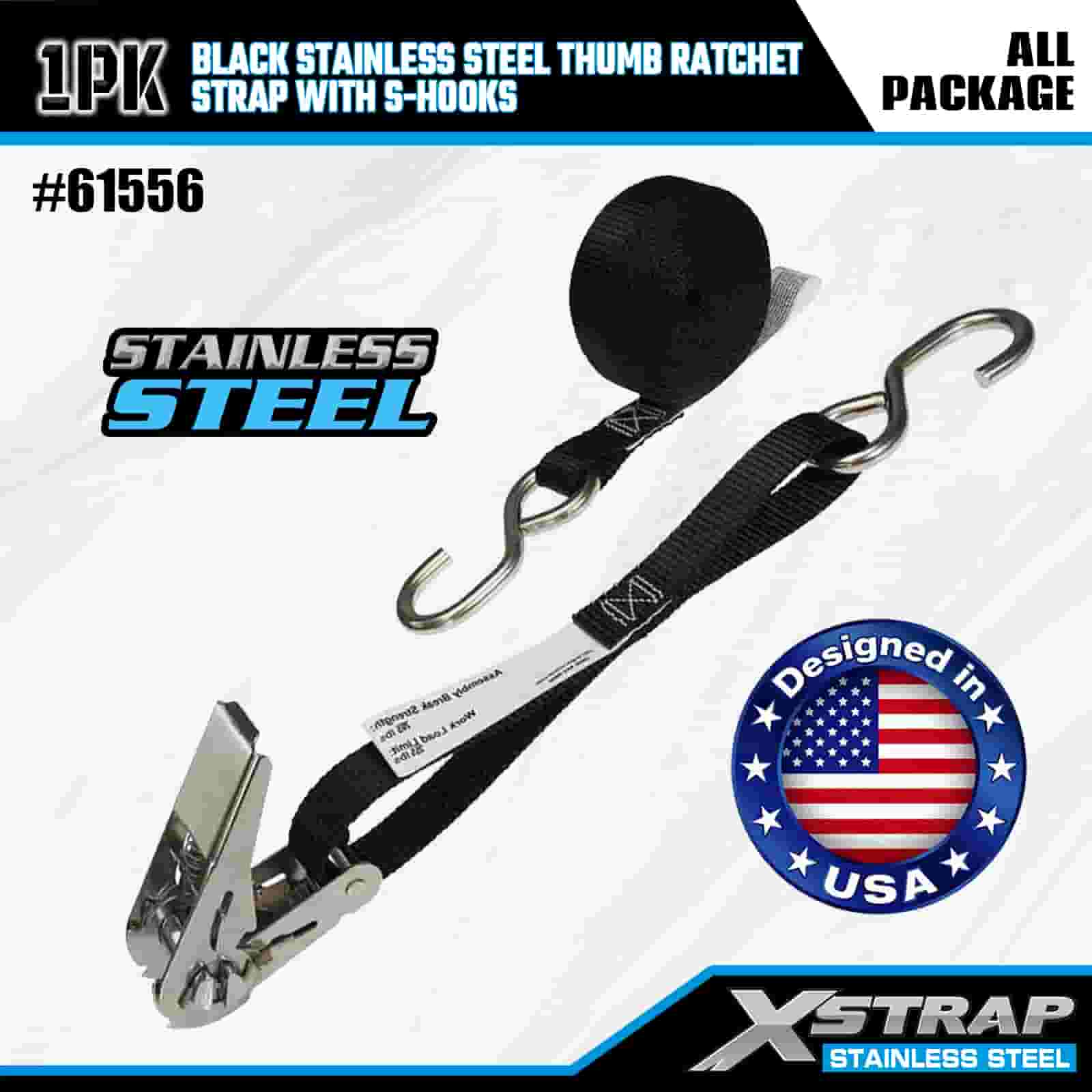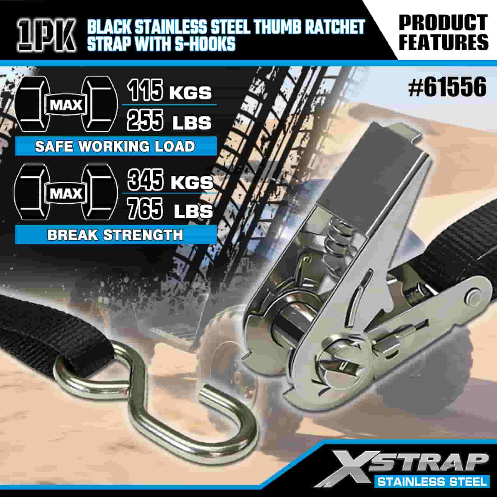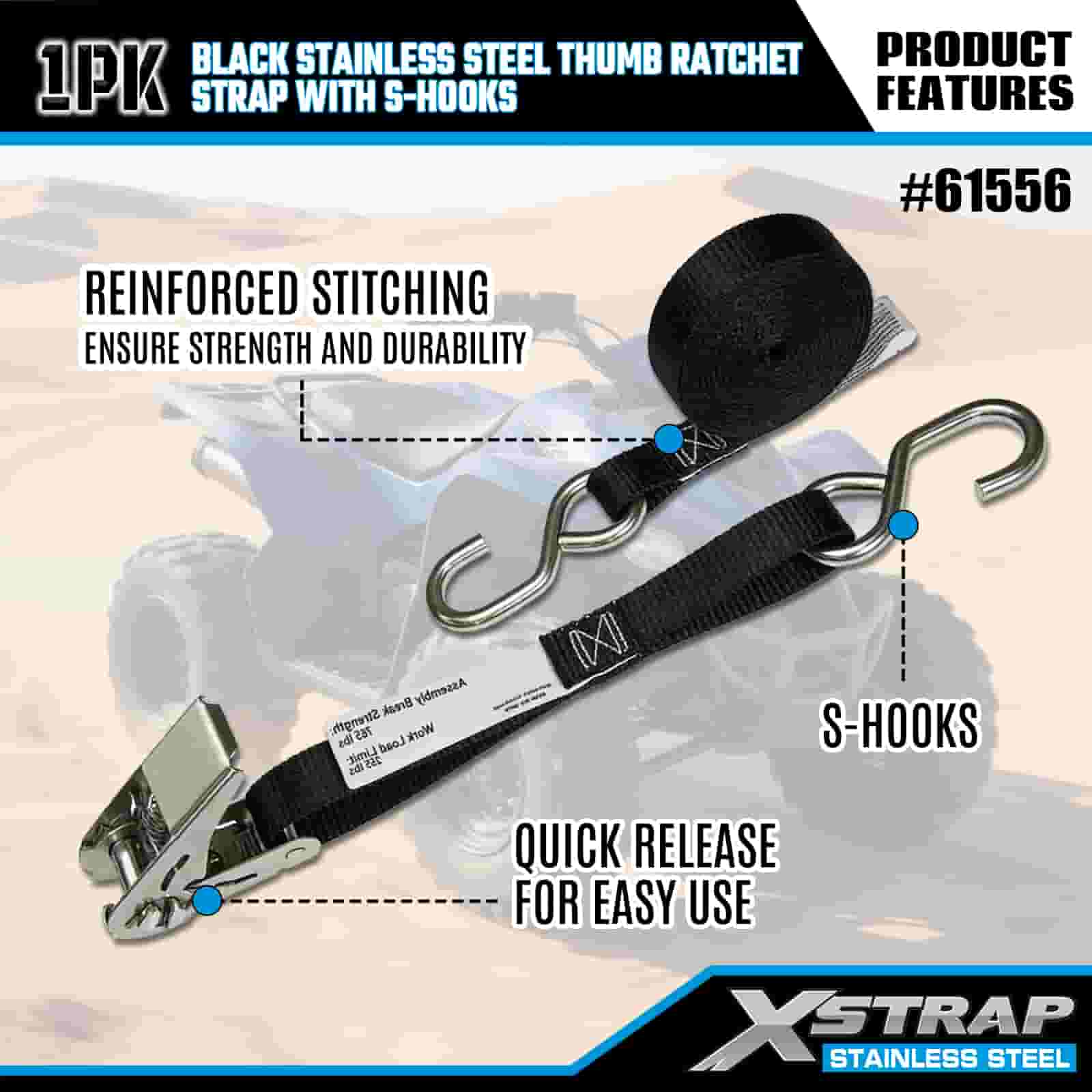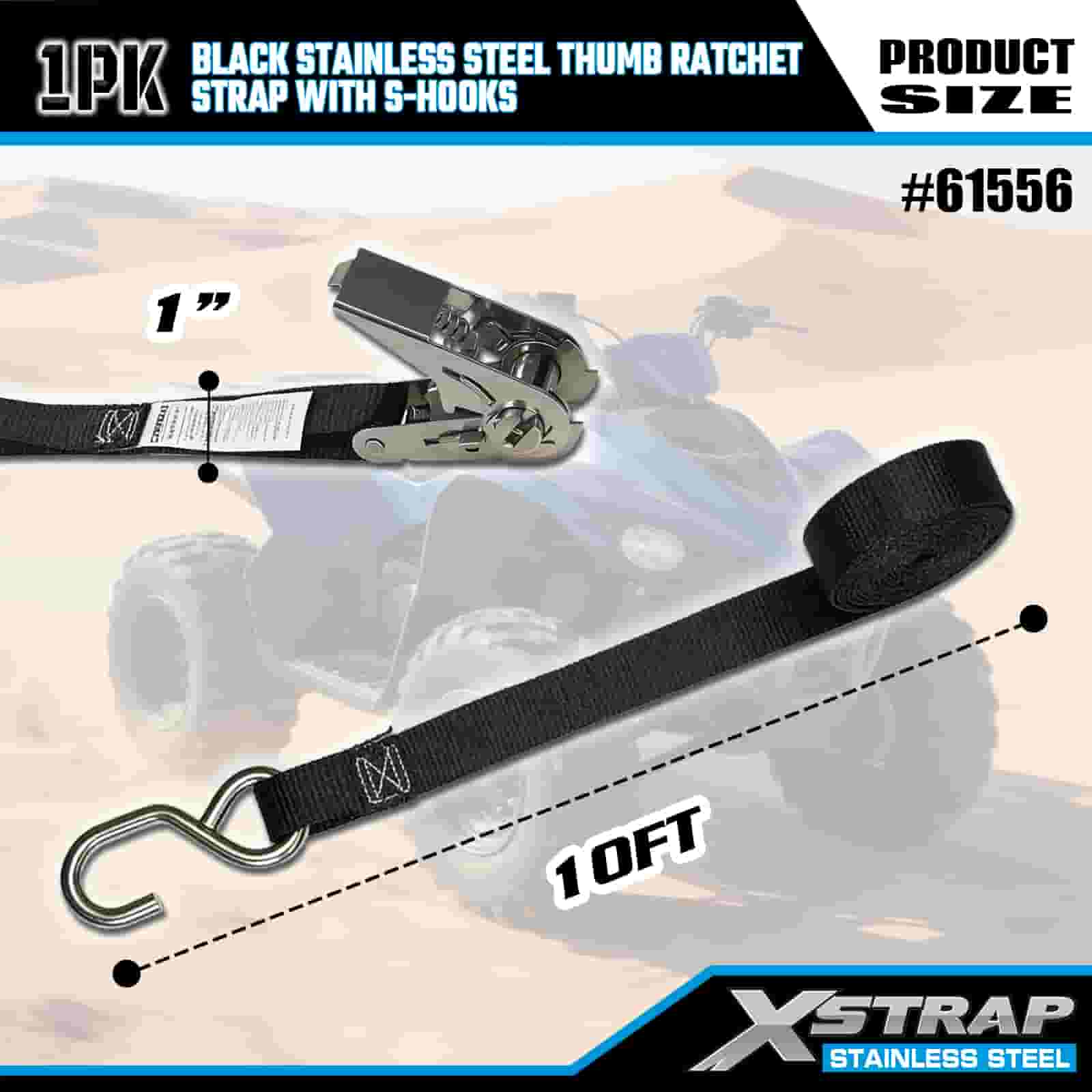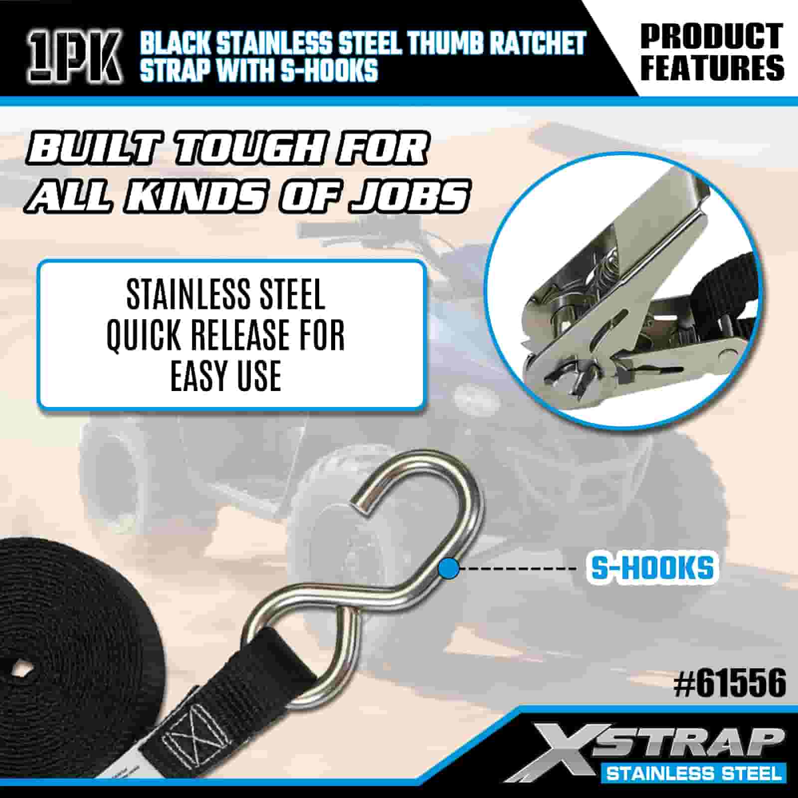 Xstrap čierna nerezová račňa na palec s háčikmi v tvare S, 1” x 10' polyesterový popruh s račňou, popruhy na upevnenie nákladu s kapacitou 255 libier s háčikmi v tvare S pre príves, lyžiarsky čln s plochým prívesom, malé auto, ťažké vybavenie.
