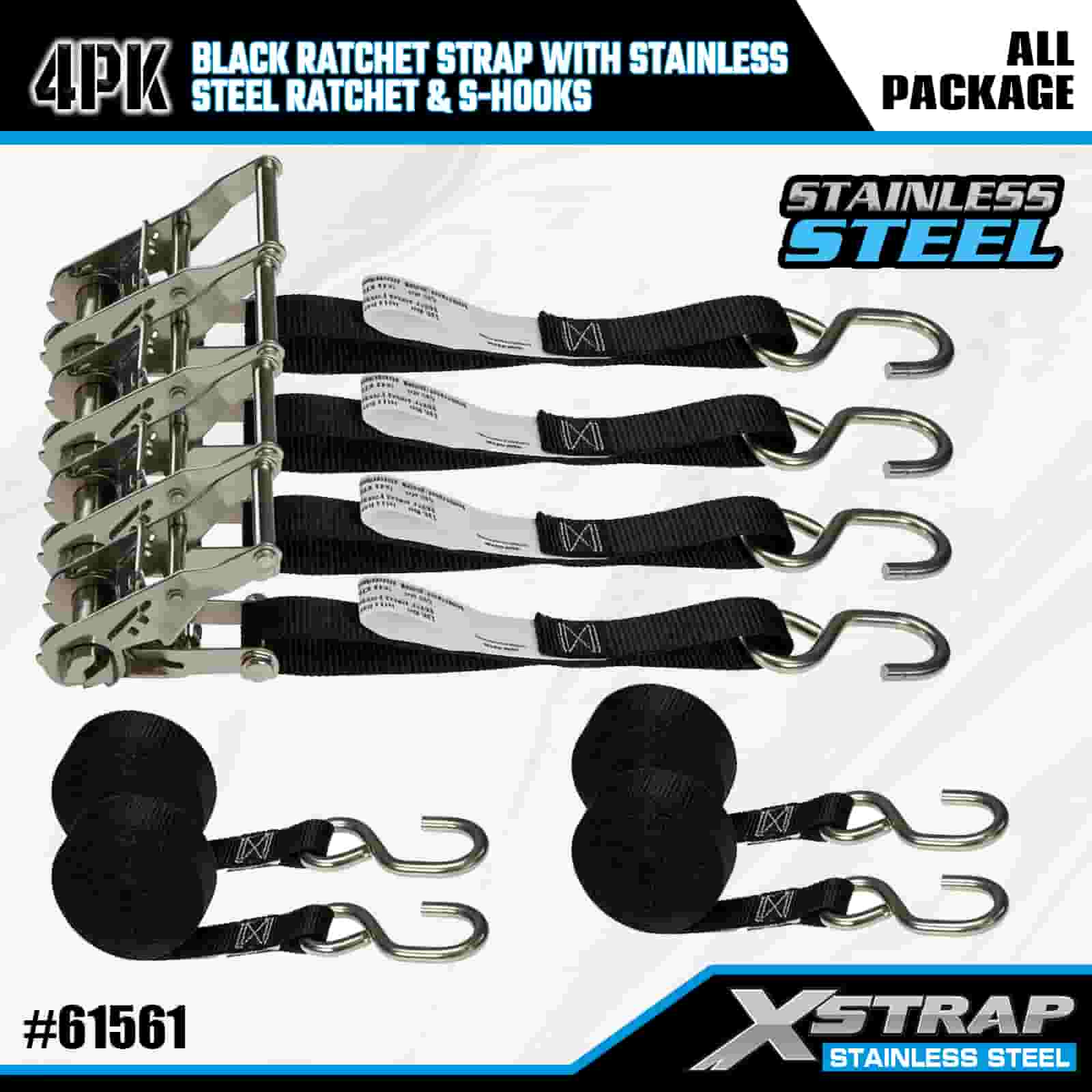 Xstrap 4PK čierny račňový popruh s račňou z nehrdzavejúcej ocele a S háčikmi, 1” x 6' polyesterový remienok s račňou, popruhy na upevnenie nákladu s kapacitou 400 libier s háčikmi v tvare S pre príves, lyžiarsky čln s plochým lôžkom, malé auto, ťažké vybavenie.