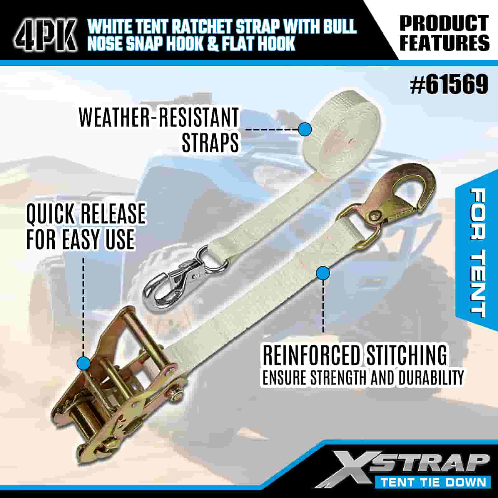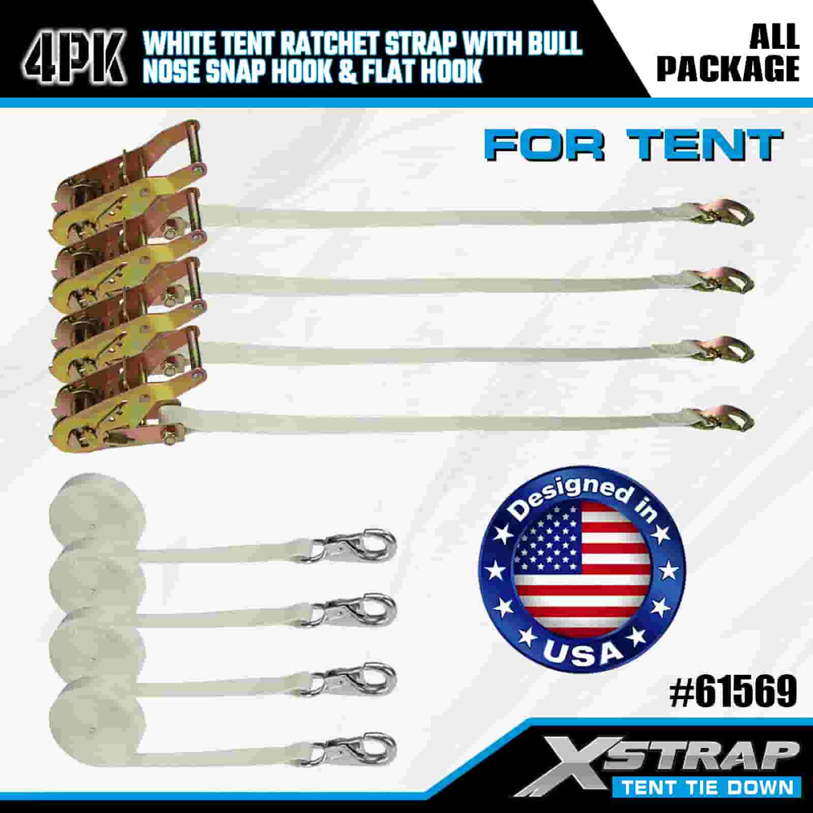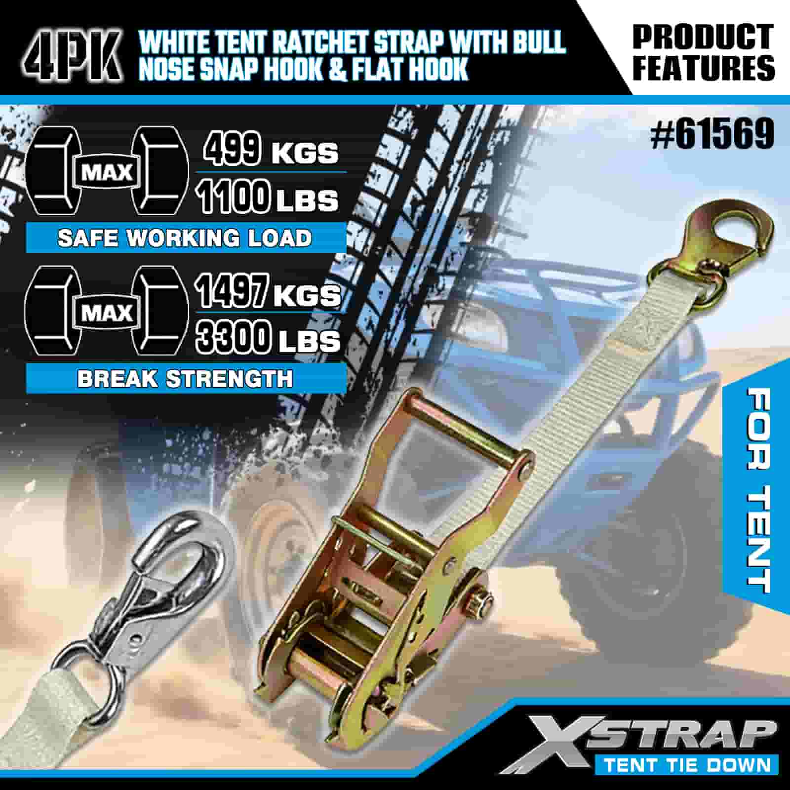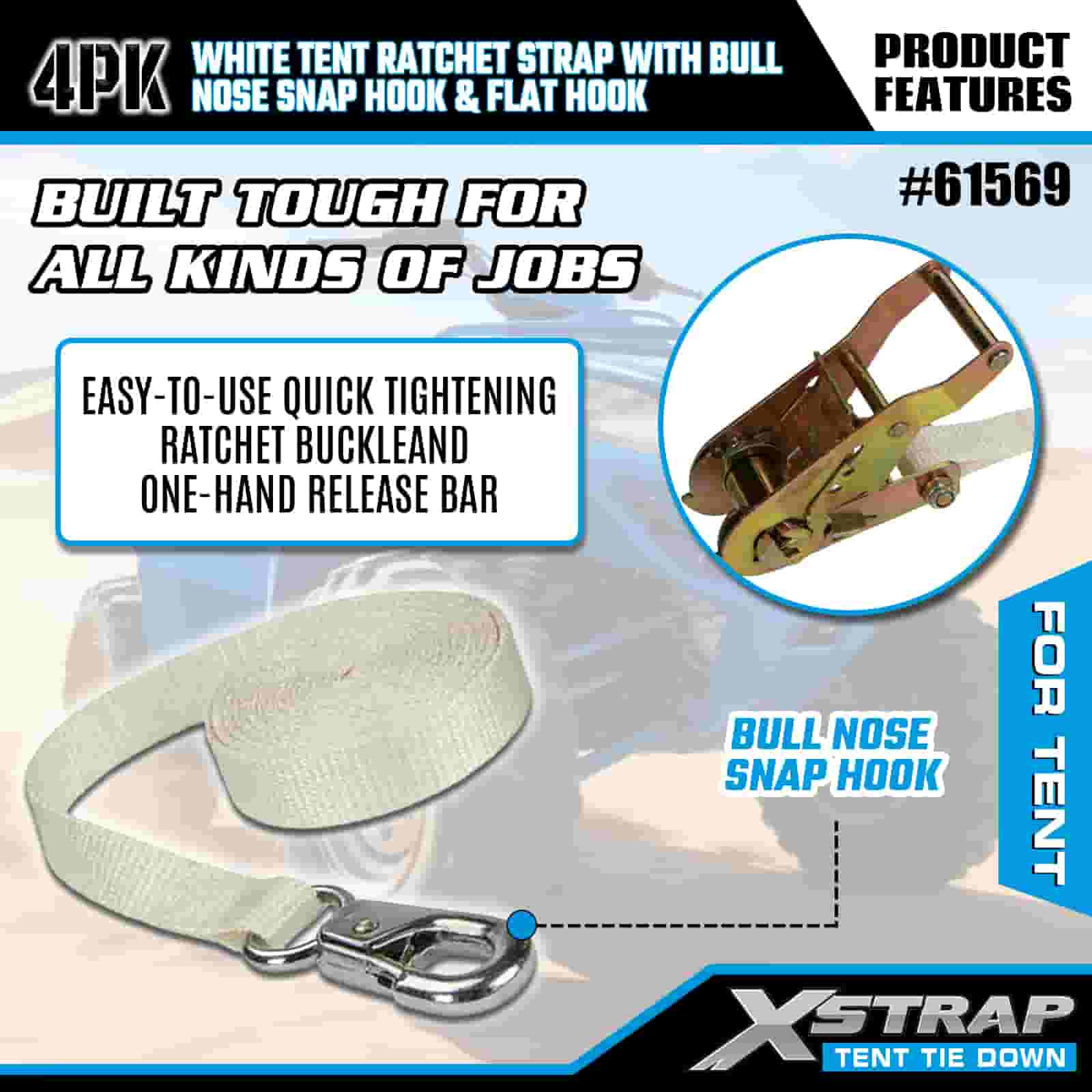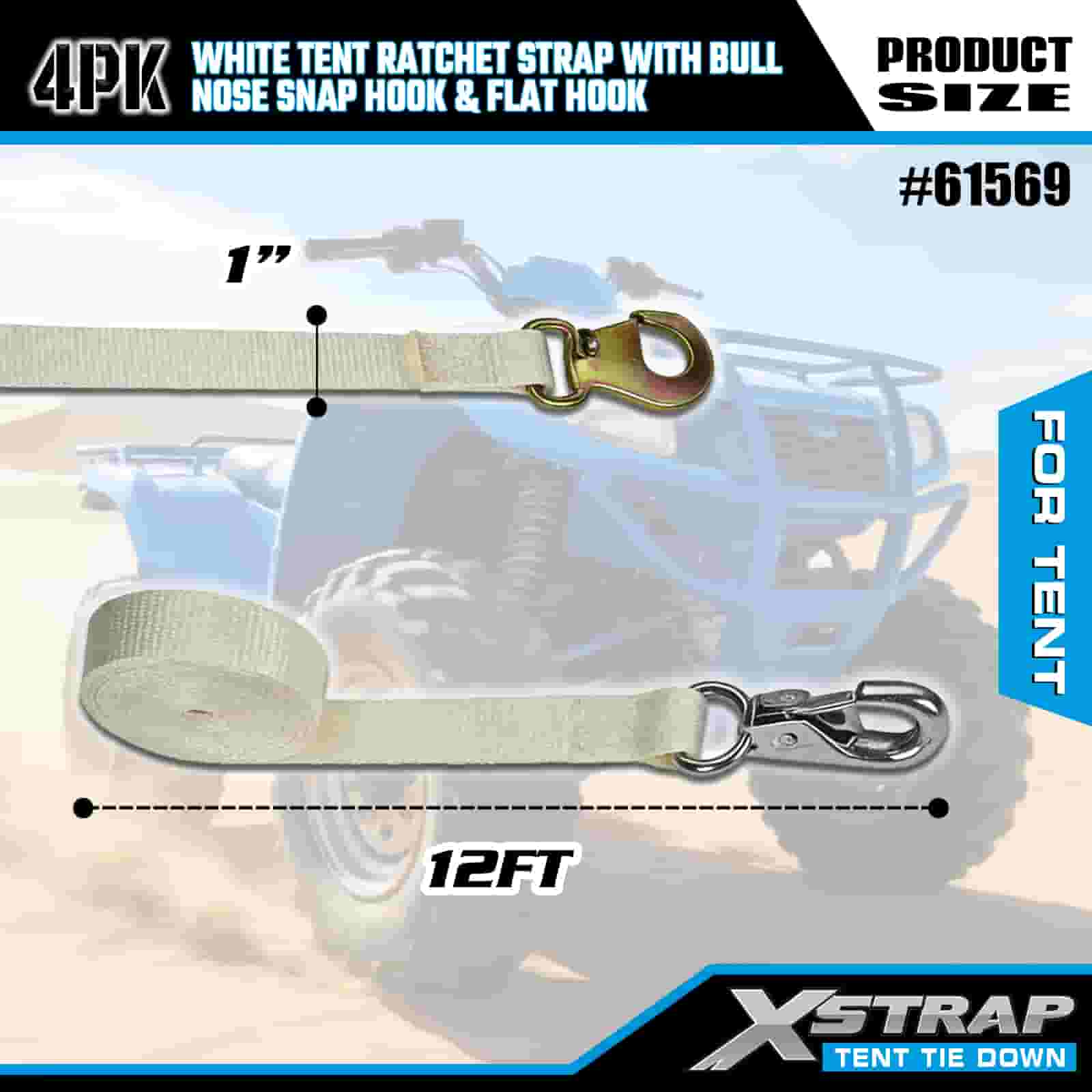 Xstrap 4PK biely račňový remienok na stan s karabínkou a plochým háčikom, 1" x 12 'polyesterový popruh s račňou, 1100 libier zaisťovacie popruhy pre náklad s nosným hákom a plochým háčikom na kontrolu nákladu, fixácia stanu.