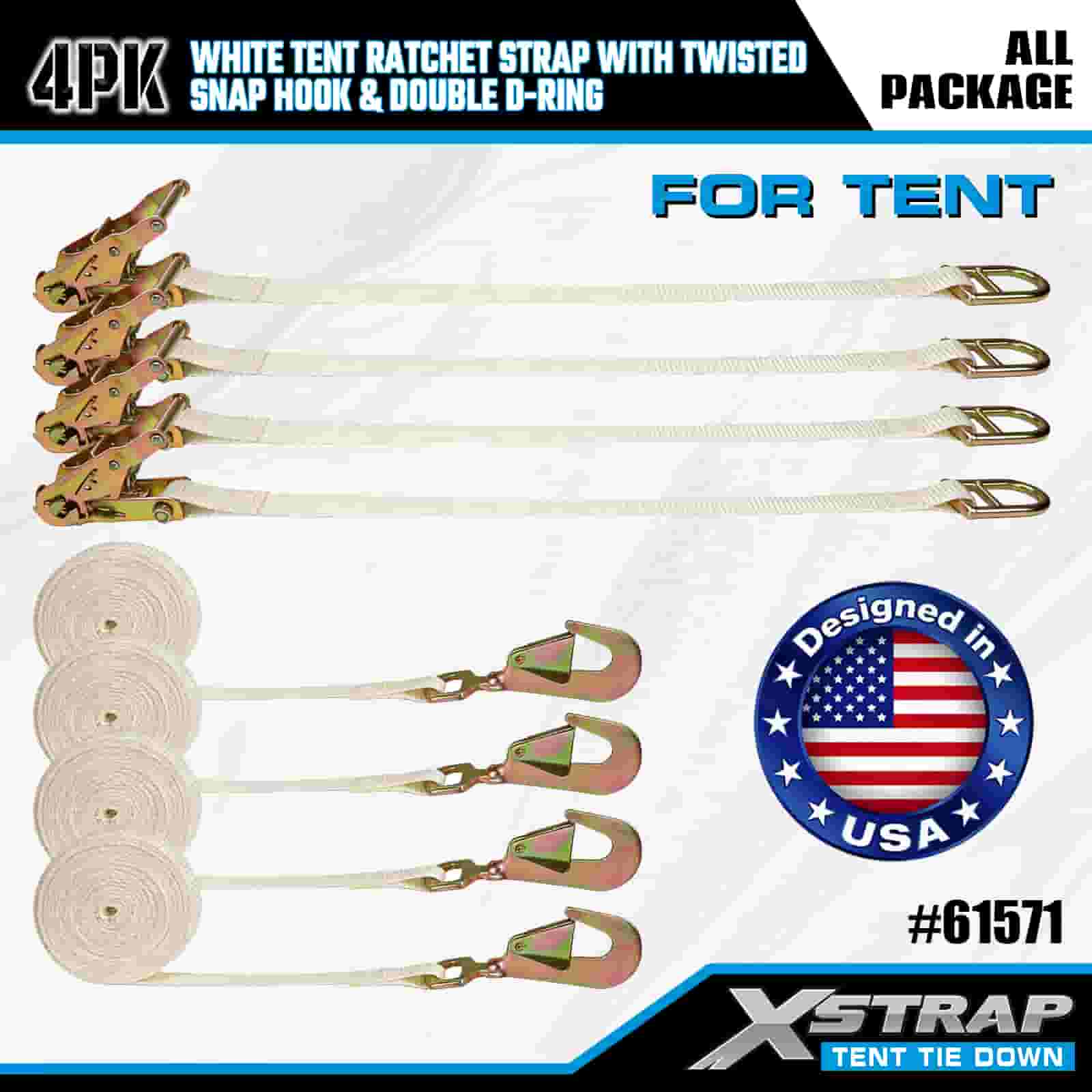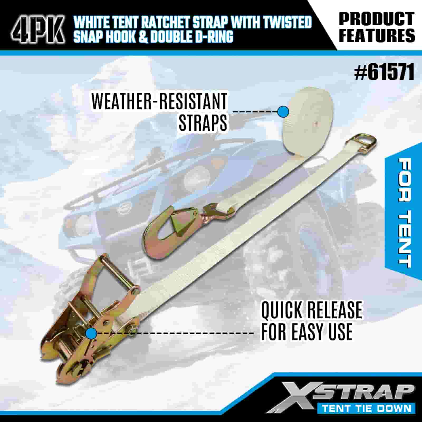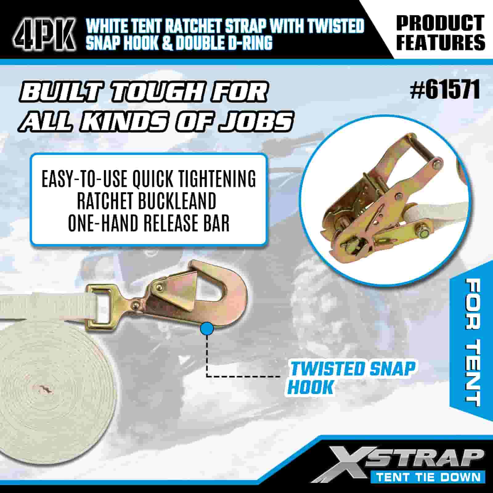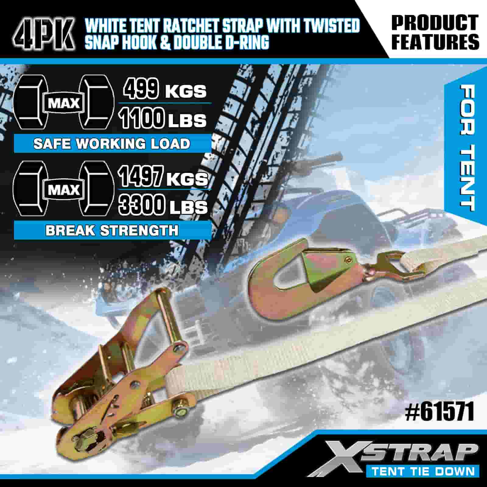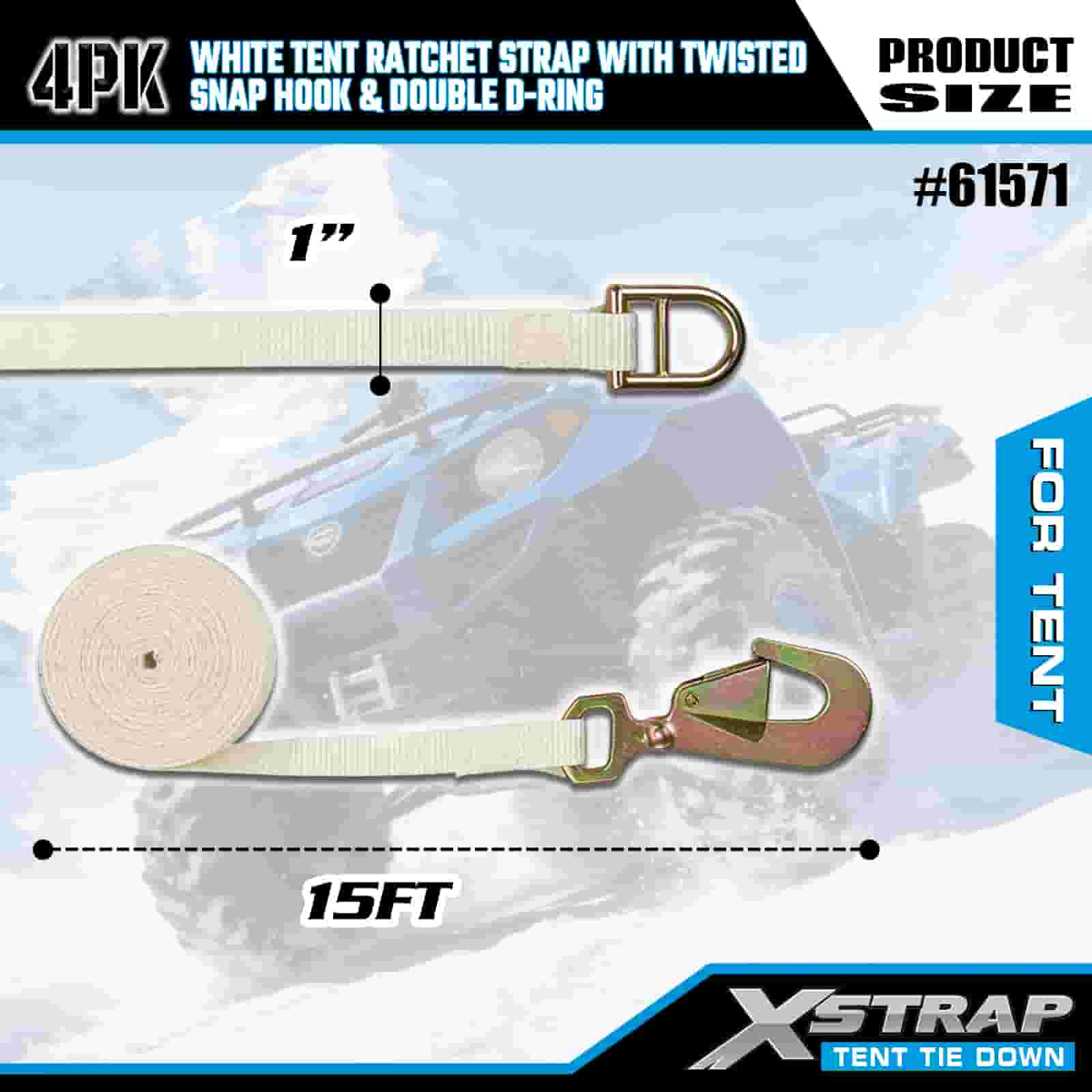 Xstrap 4PK biely račňový popruh pre stan so skrúteným háčikom a dvojitým D krúžkom, 1 "x 15" polyesterový remienok s račňovým popruhom, 1100 libier zaisťovacie popruhy pre náklad s otočným háčikom a dvojitým D krúžkom na kontrolu nákladu, fixácia stanu.