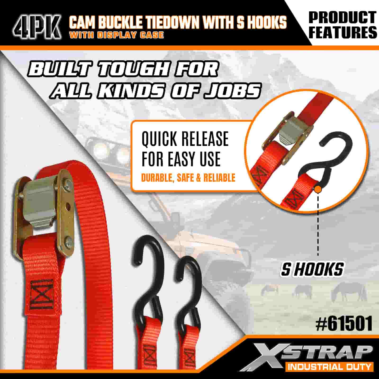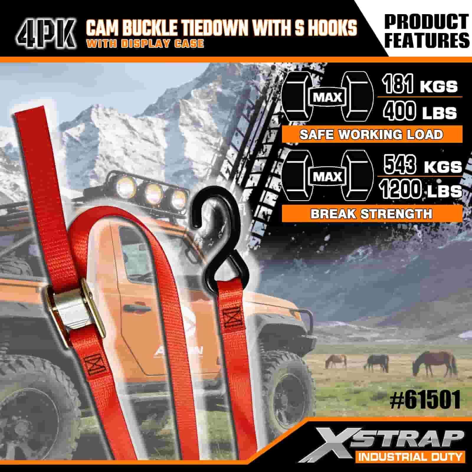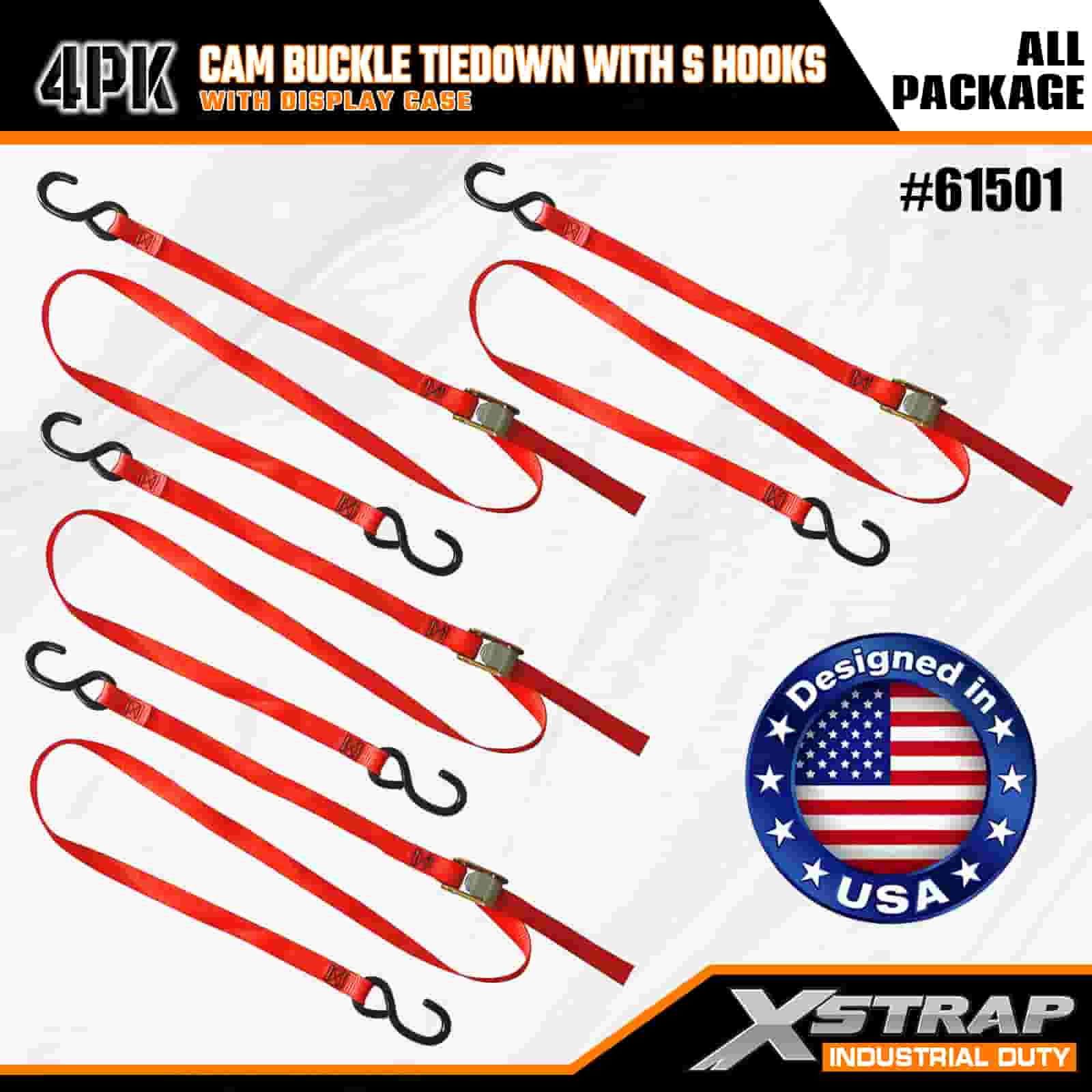 Xstrap 4-balenie vačkovej spony s háčikmi S, 2" x 6" polyesterový remienok s vačkovou sponou, 400 lbs kapacitné popruhy na uchytenie nákladu s háčikmi S pre seriózneho profesionála na zabezpečenie nákladného prívesu, prívesu s plochým lôžkom, lyžiarskeho člna, malého auta.