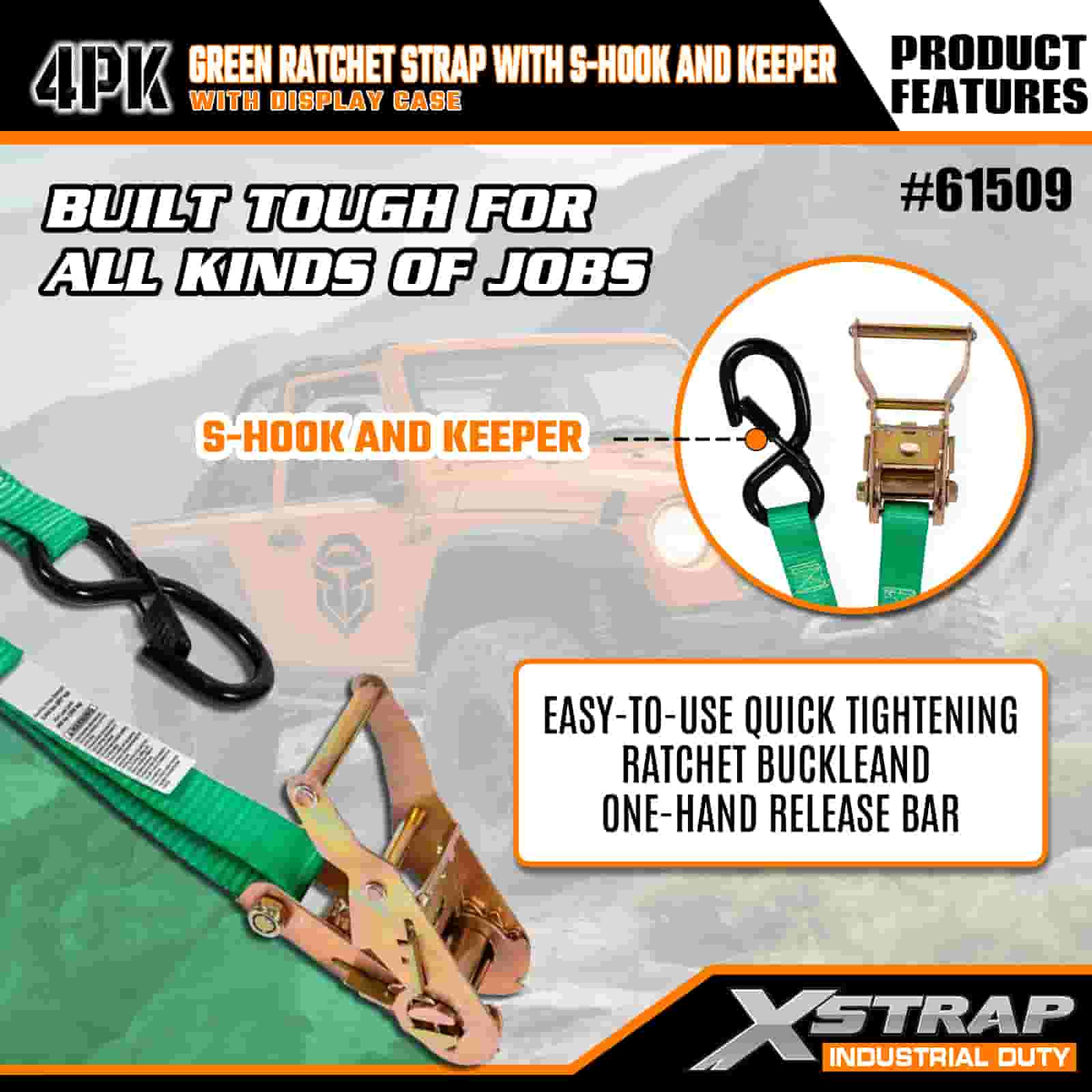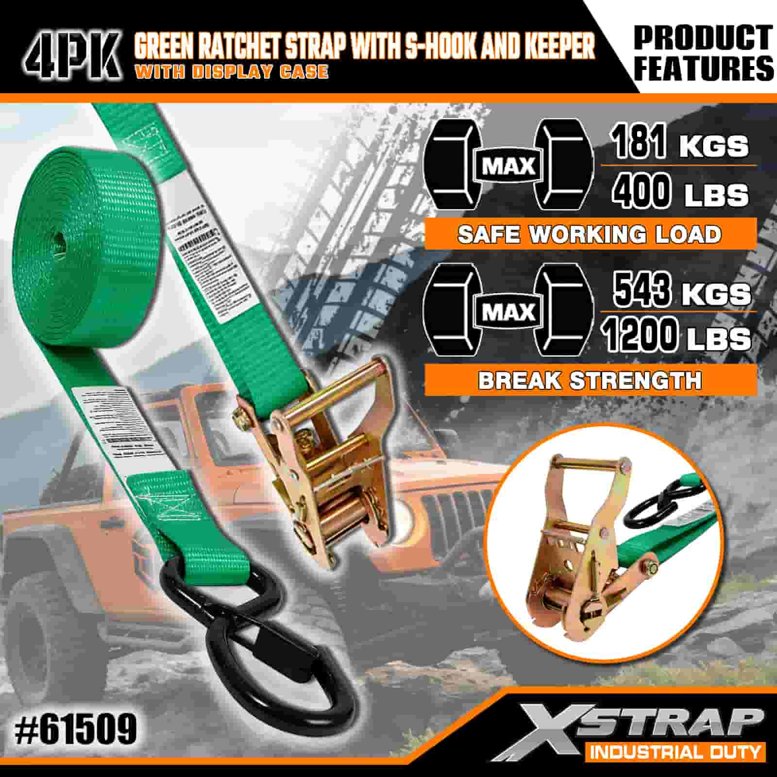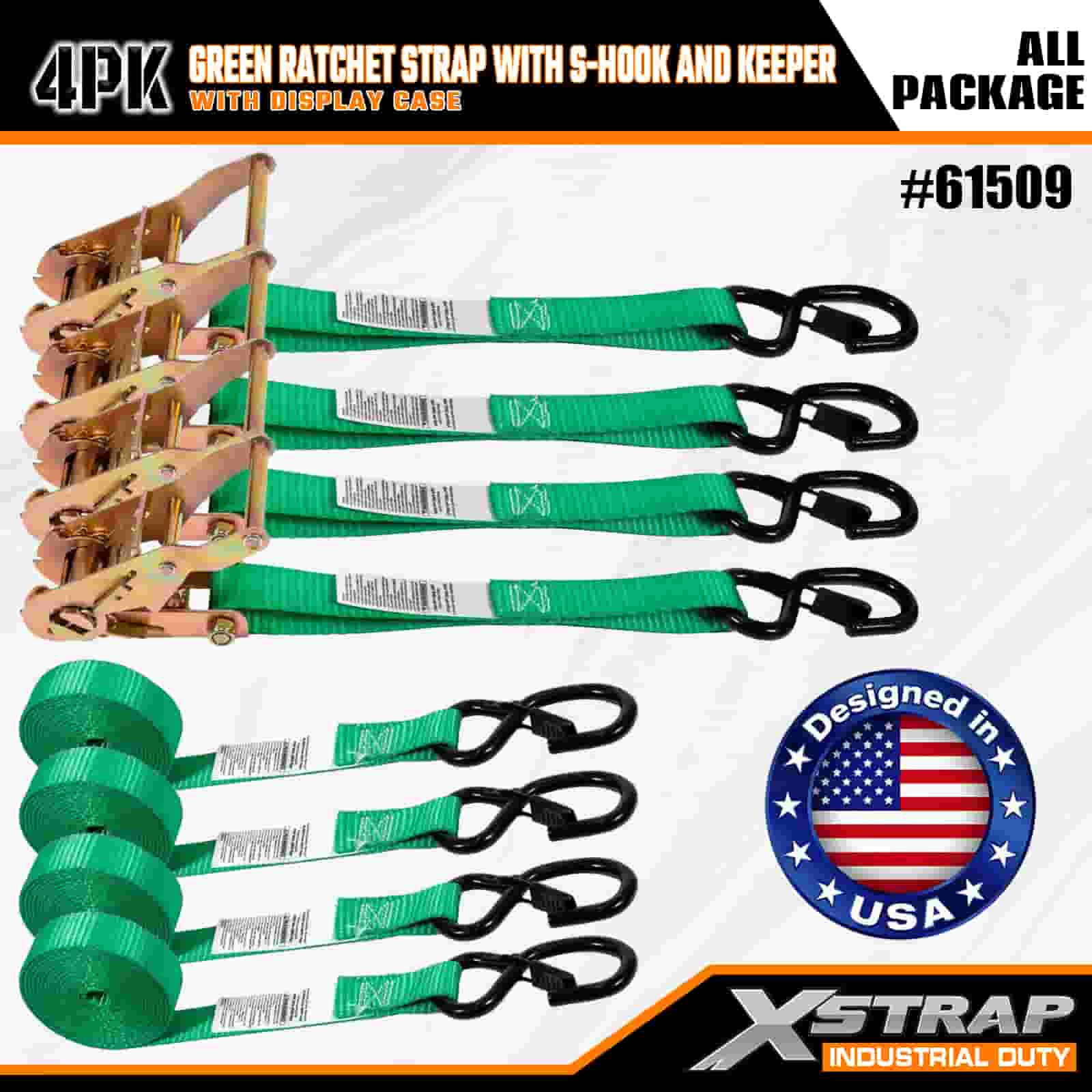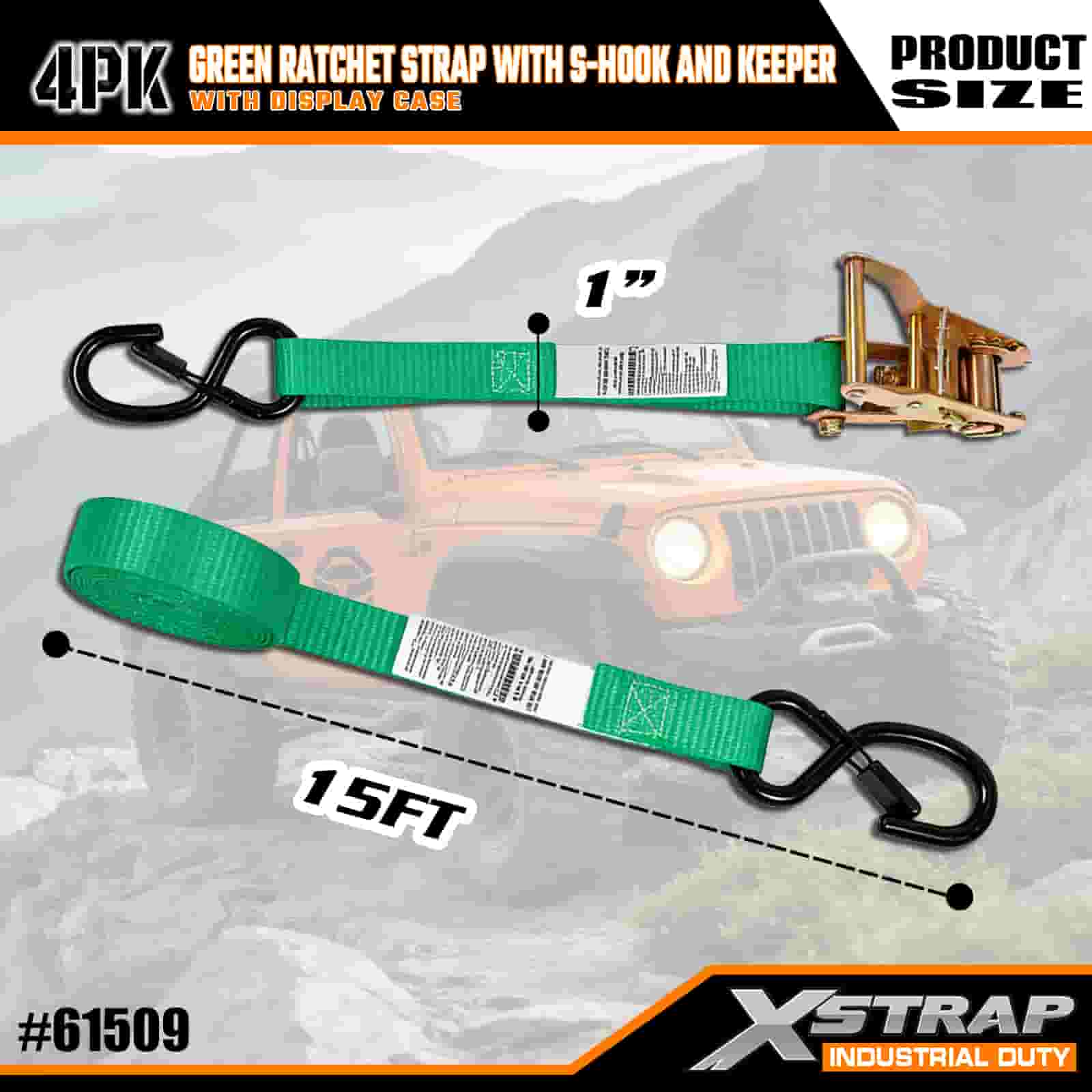Xstrap 4-balený račňový popruh s bezpečnostnými S háčikmi, 1" x 15" polyesterový upínací popruh s račňovým sťahovacím popruhom, kapacita 400 libier Upevňovacie popruhy pre náklad s bezpečnostnými S háčikmi pre serióznych profesionálov na zaistenie nákladného prívesu, prívesu s plochým lôžkom, lyžiarskeho člna, malého auta.