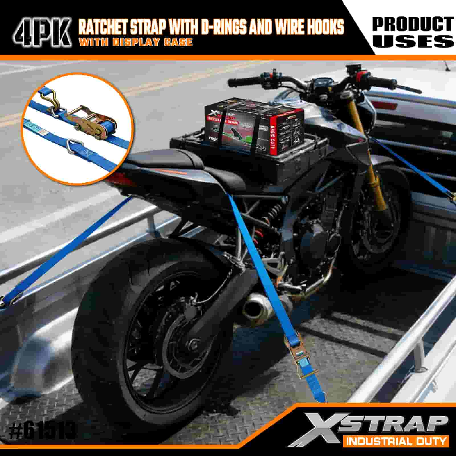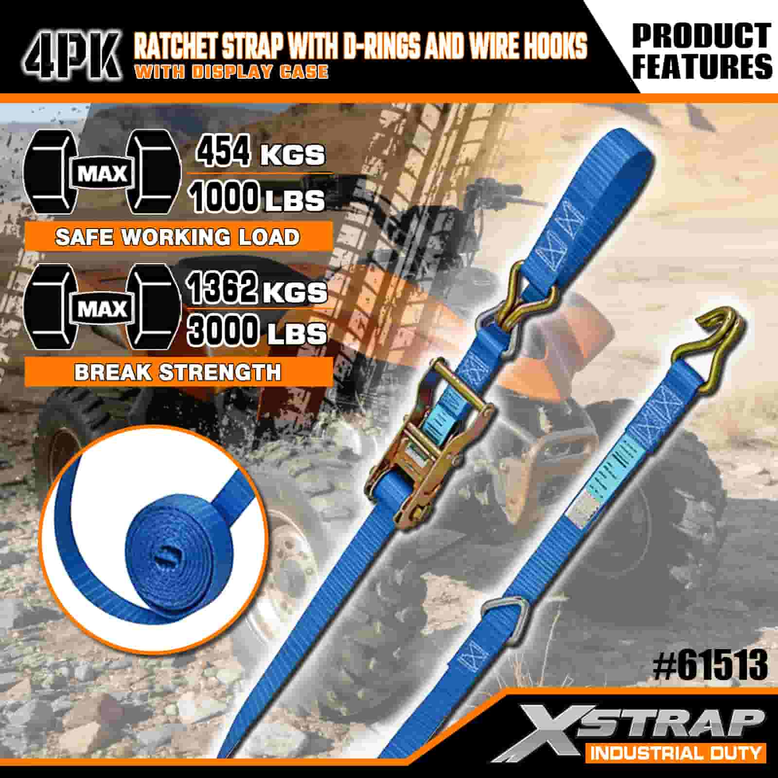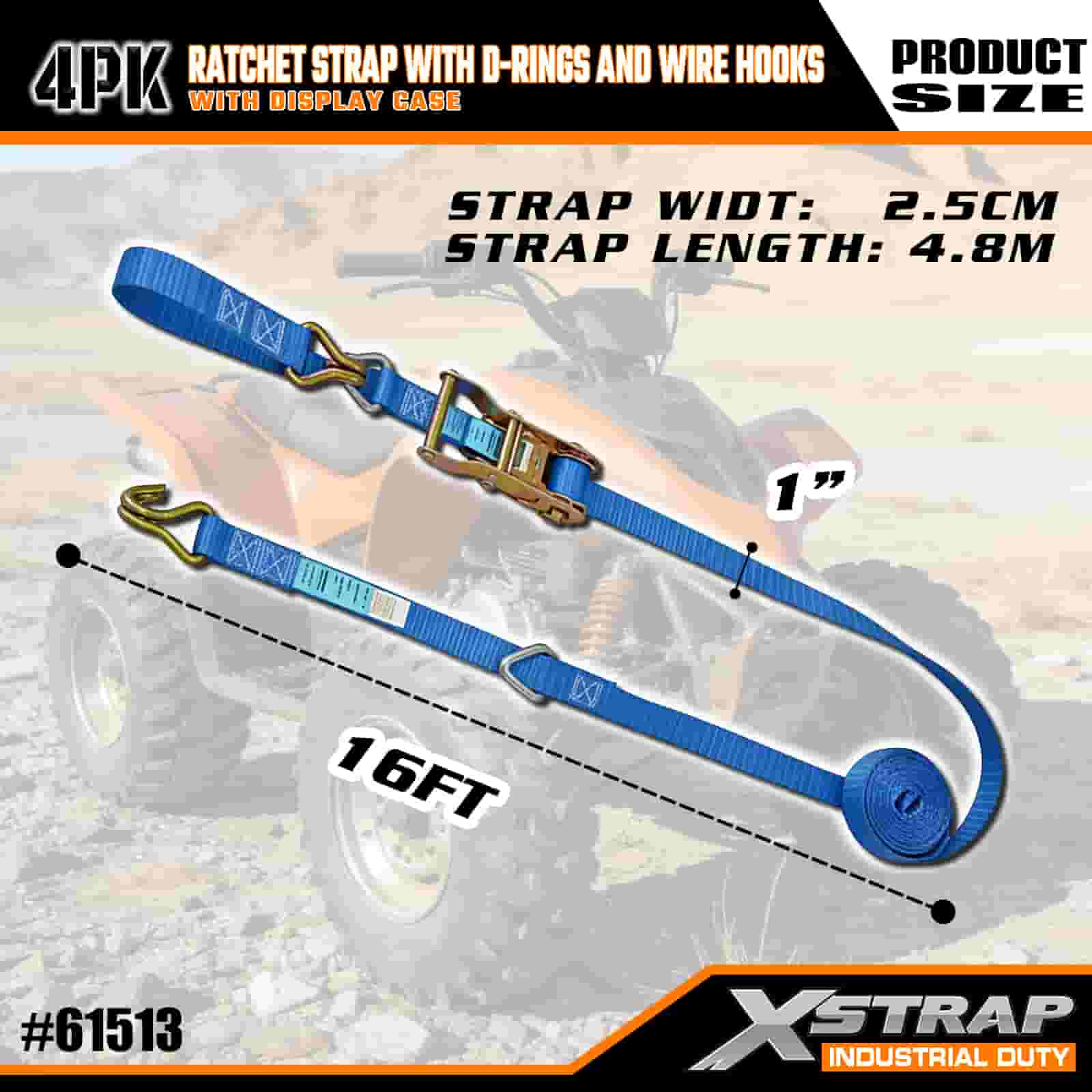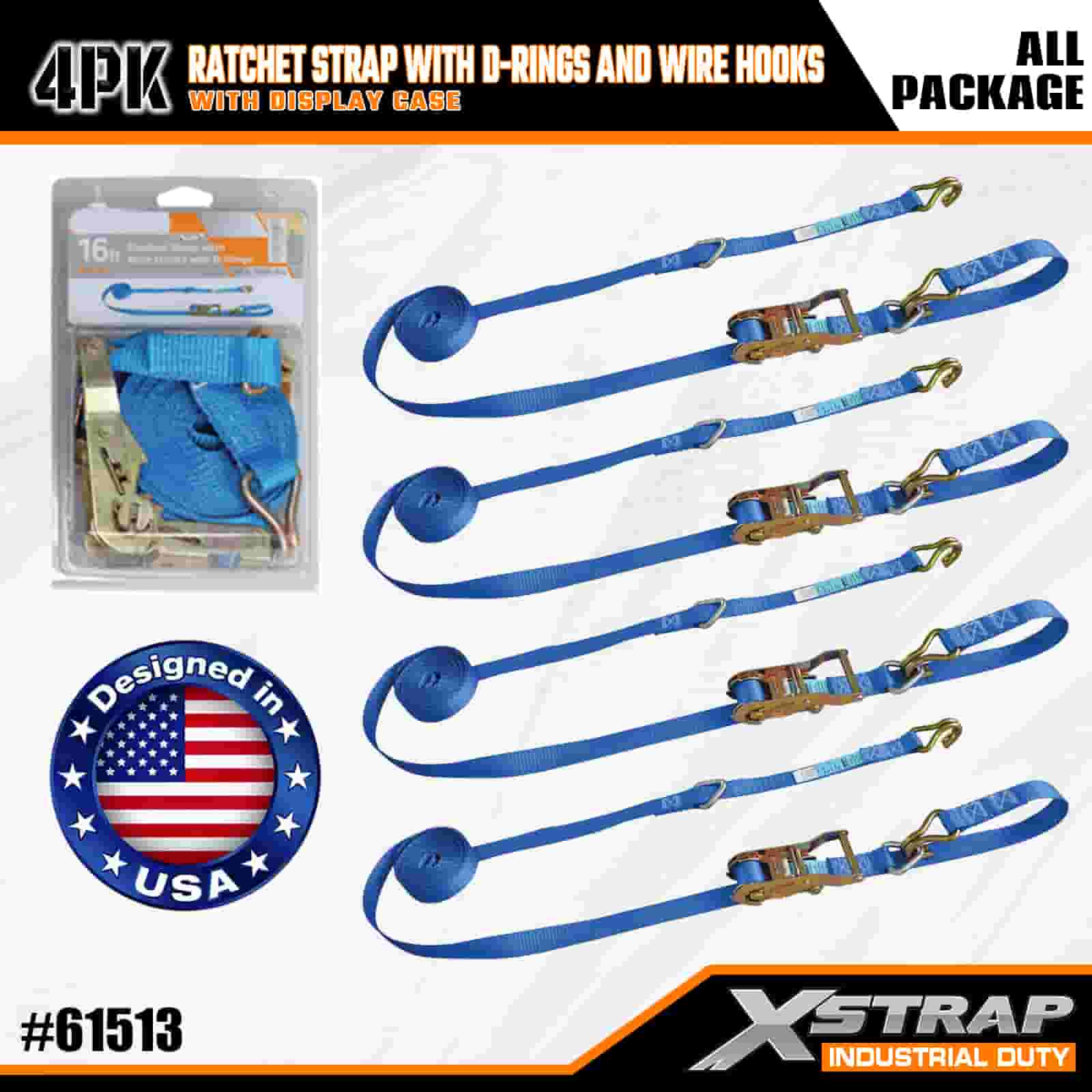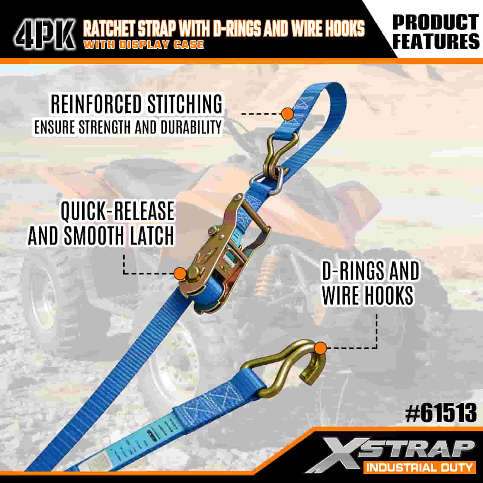 Xstrap 4-balený račňový popruh s D krúžkami a drôtenými háčikmi, 1” x 16” polyesterový popruh s račňovým sťahovacím popruhom s kapacitou 1 000 libier na upevnenie nákladu popruhy s drôtenými háčikmi pre serióznych profesionálov na zabezpečenie nákladného prívesu, prívesu s plochým lôžkom, lyžiarskeho člna, malého auta.