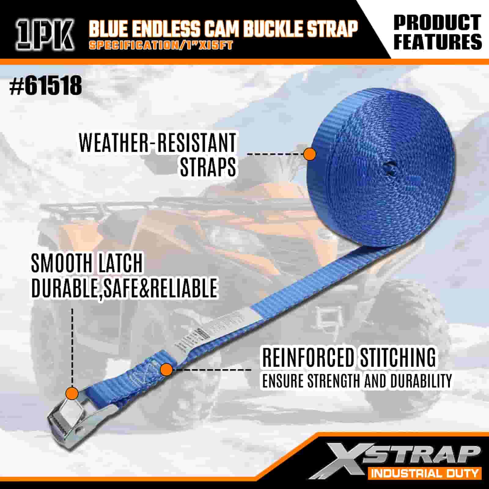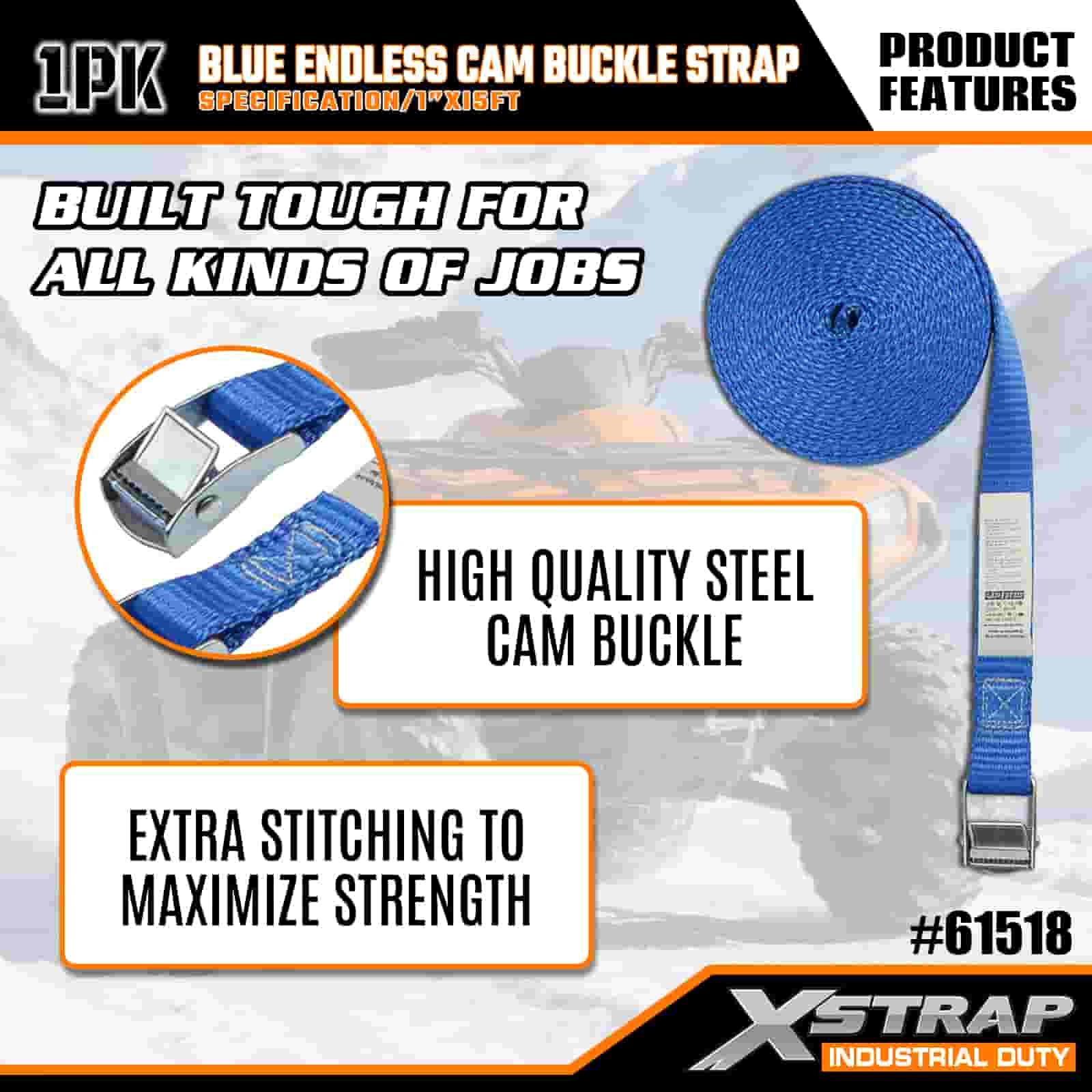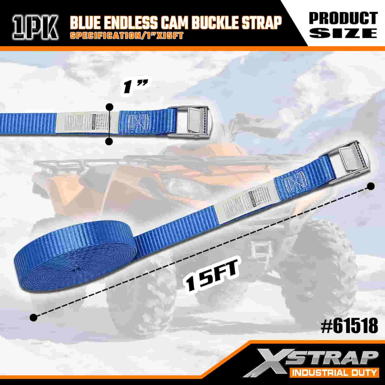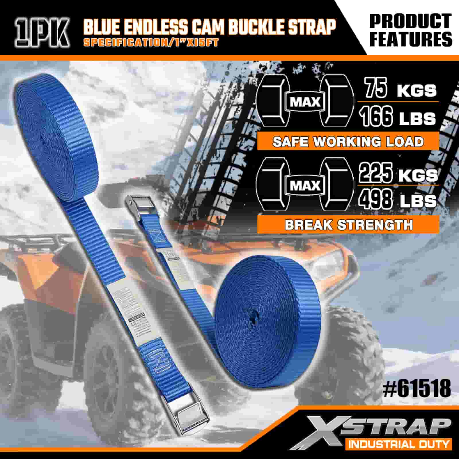 Xstrap Modrá Endless Cam Buckle Remienok, 1” x 15' polyesterový popruh s upínacím popruhom s račňou, 166 libier zaisťovacie popruhy na uchytenie nákladu pre seriózneho profesionála na zabezpečenie nákladného prívesu, prívesu s plochým lôžkom, lyžiarskeho člna, malého auta.