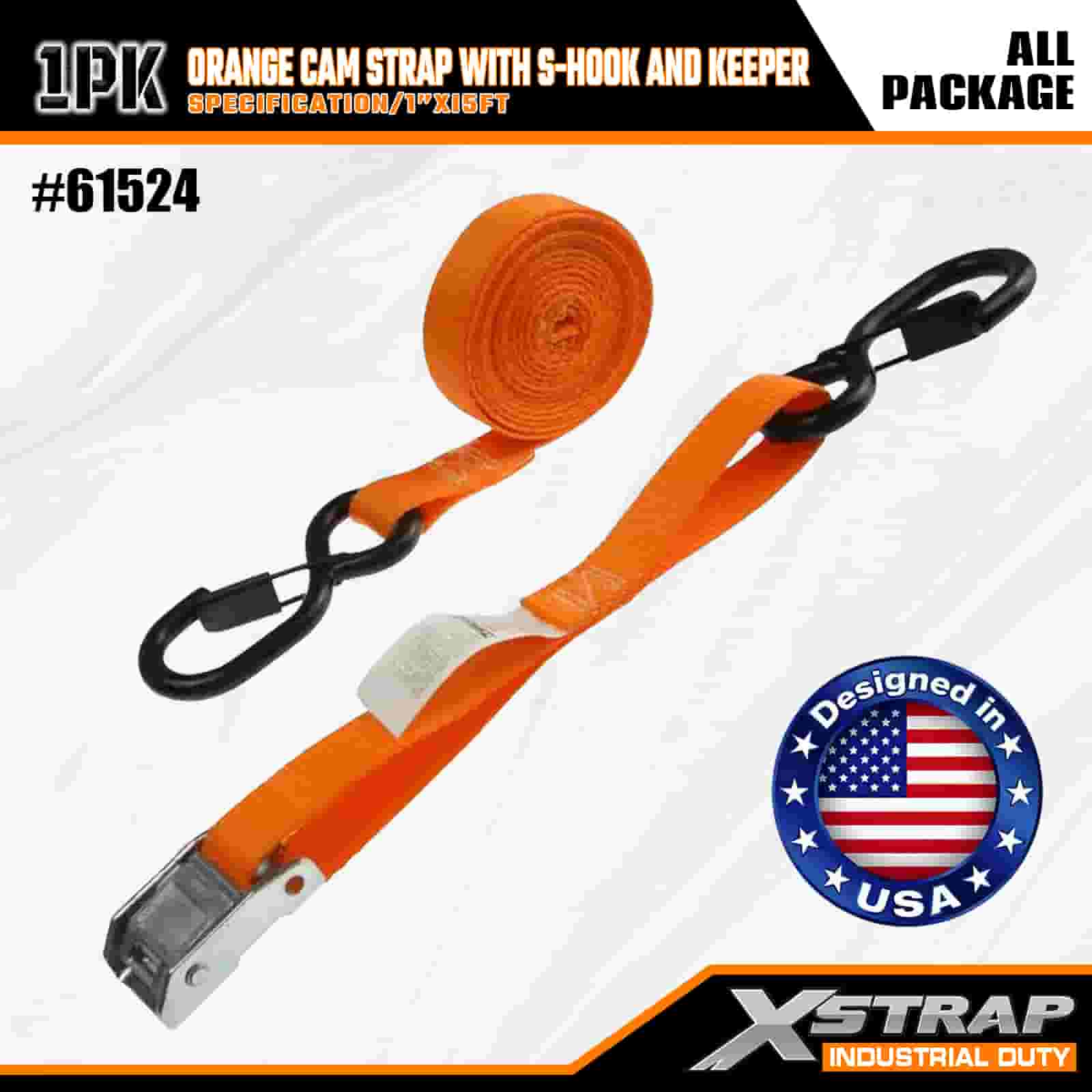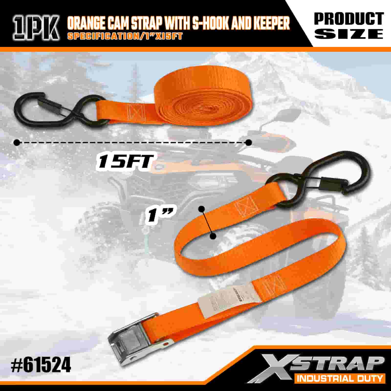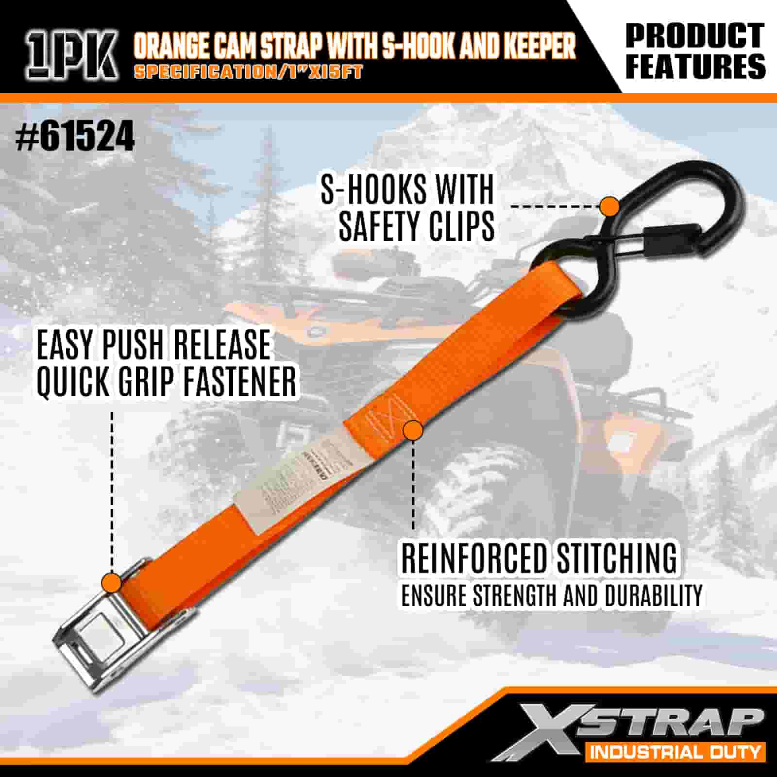Xstrap Qrange Cam popruh s S-hákom a držiakom, 1" x 15" polyesterový upínací popruh s račňovým sťahovacím popruhom, kapacita 400 libier zaisťovacie popruhy pre náklad s bezpečnostnými S háčikmi pre serióznych profesionálov na zabezpečenie nákladného prívesu, prívesu s plošinou, lyžiarskeho člna, malého auta.