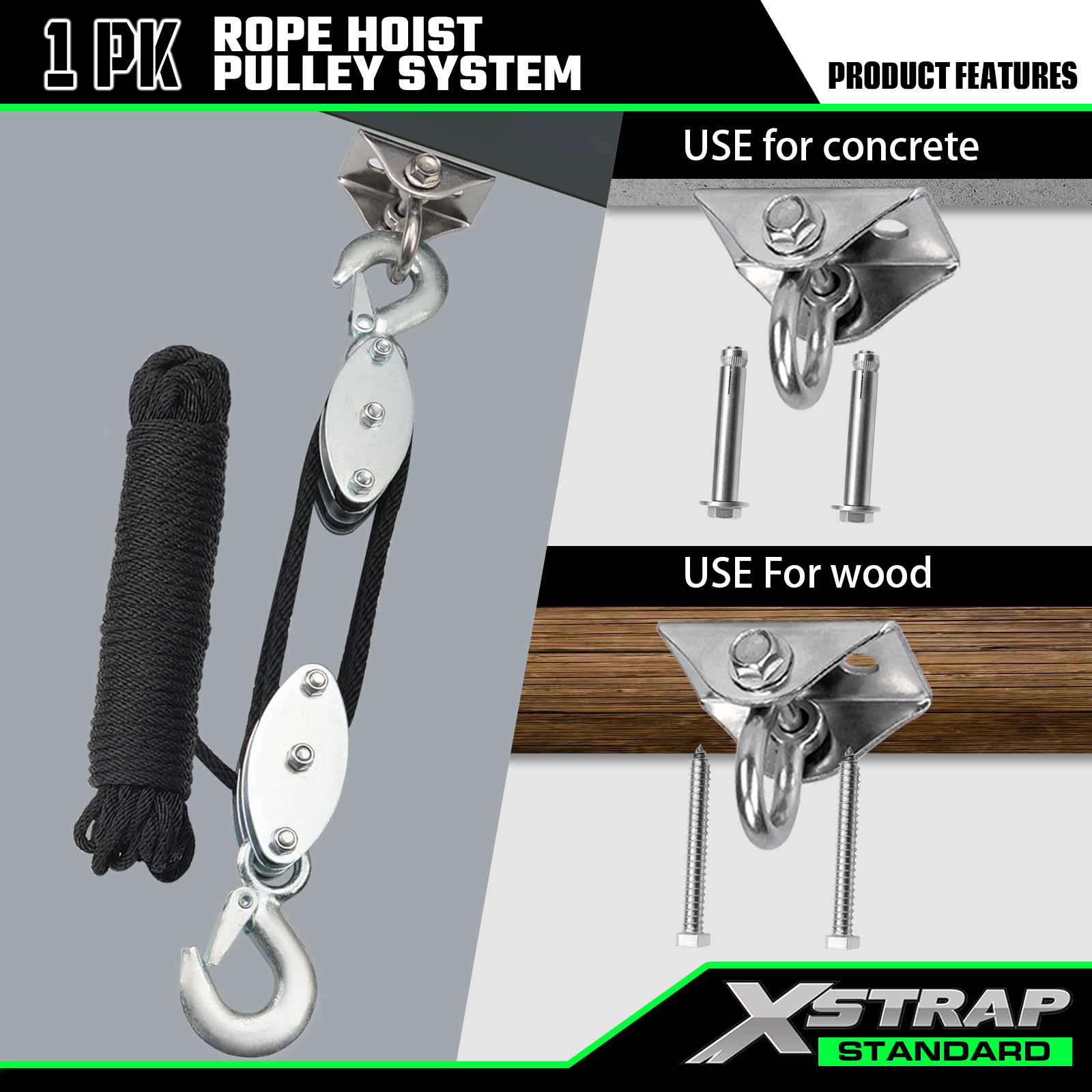 Toto je náš 50-stopový lanový kladkostroj XSTRAP STANDARD, vysokovýkonný 2000LB systém kladky kolies a kladky na zdvíhanie ťažkých predmetov pomocou pracovných rukavíc, 2 ks mäkkých slučiek, 1 výkyvný záves pre garážový sklad.
