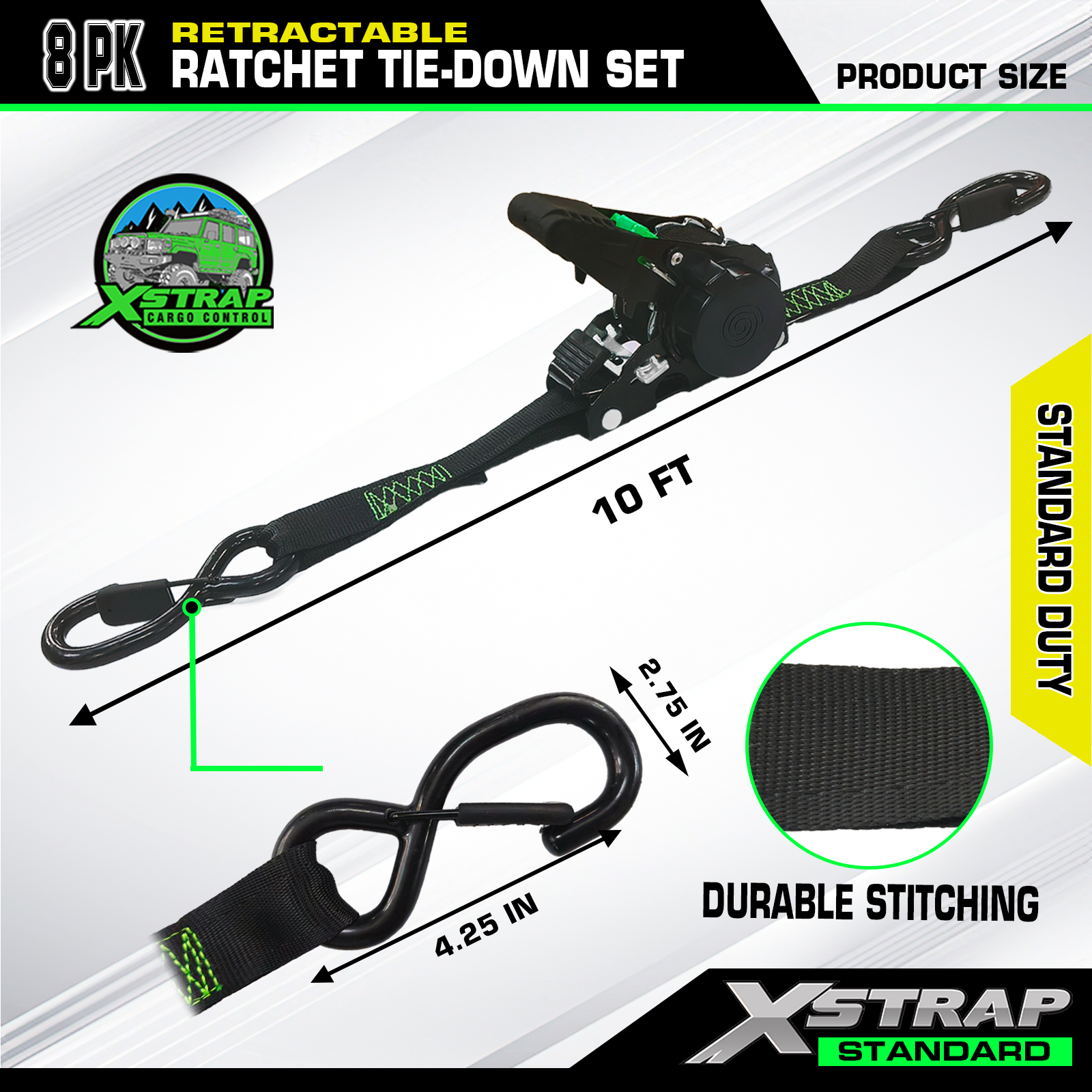 - Vysoko kvalitné sťahovacie popruhy s račňou - pracovné zaťaženie je 500 libier a obmedzené zaťaženie je 1500 libier. Remienky budú pred odoslaním testované. Takže môžeme zabezpečiť, aby bol váš náklad počas prepravy bezpečný.