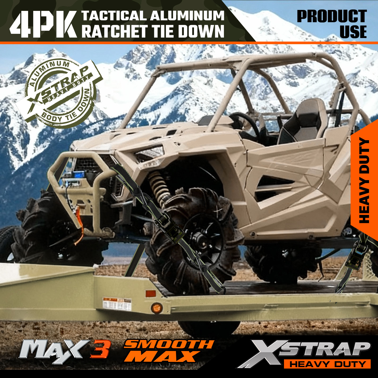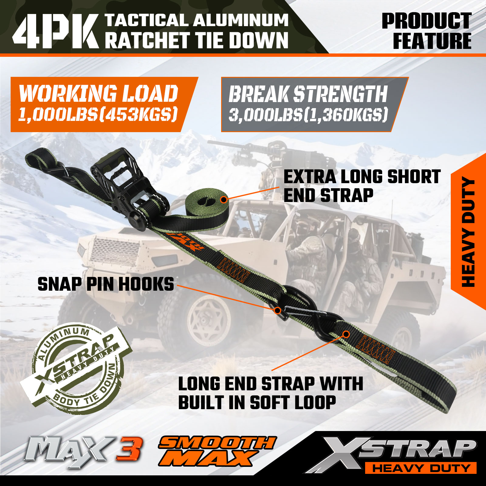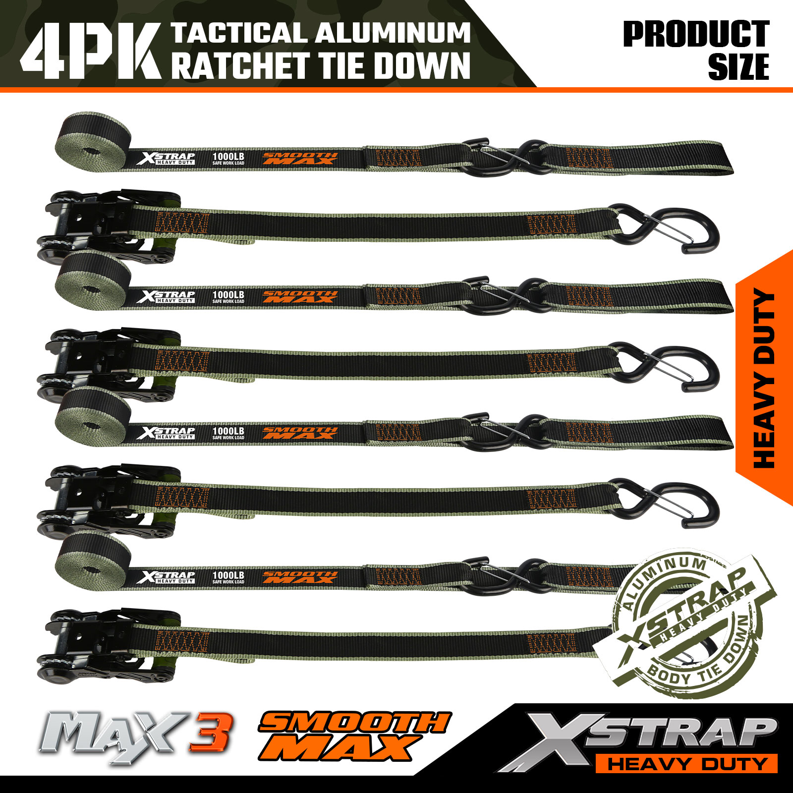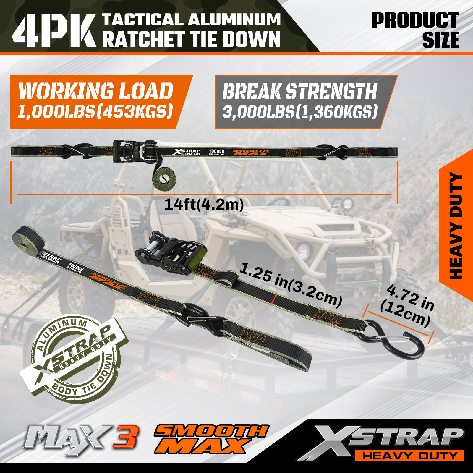 Tactical Ratchet Tie Down Xstrap má rozmery 1,25 palca x 12 stôp, bezpečné pracovné zaťaženie je 1000 libier a pevnosť v pretrhnutí je 3 000 libier.