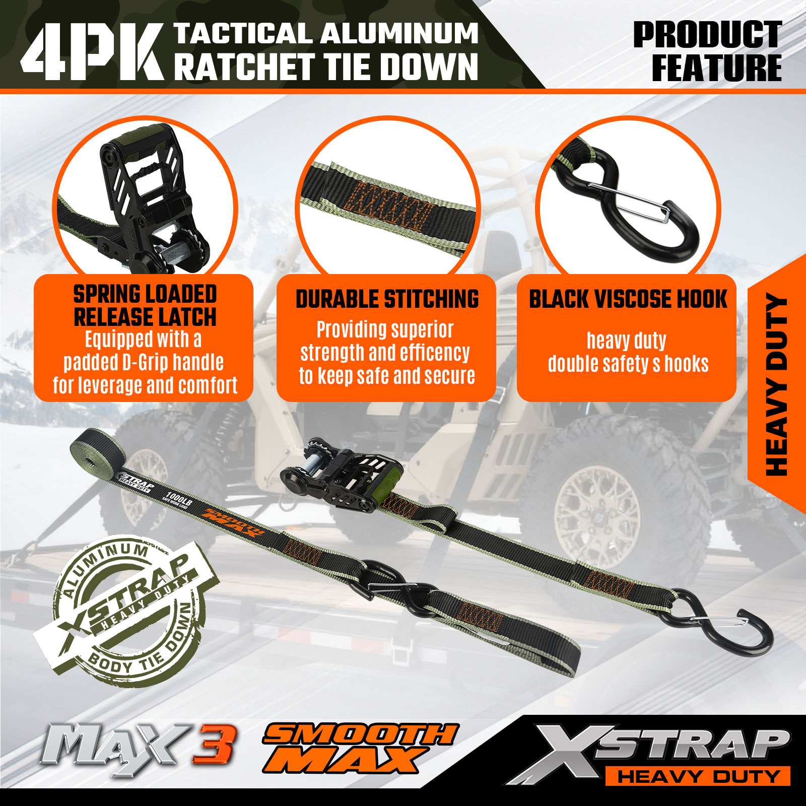 Tactical Ratchet Tie Downs Xstrap sú pevnejšie a ľahšie sa používajú ako štandardné račňové viazacie pásky. Dizajn mäkkej slučky môže pomôcť zaistiť náklad bez poškodenia laku alebo chrómu. Diamantová vrúbkovaná rukoväť umožňuje lepšiu priľnavosť a gumené nárazníky pozdĺž račne chránia váš náklad pred poškriabaním. Remienok má presné ozubenie vďaka 16 zubom pozdĺž ozubeného kolesa račne.