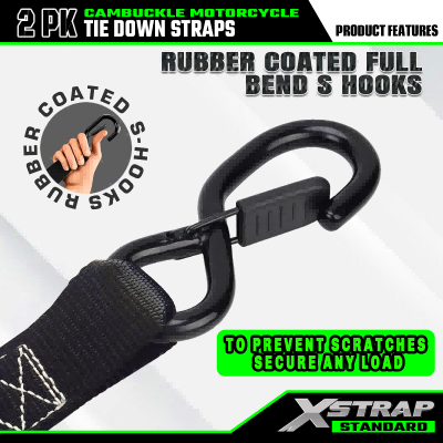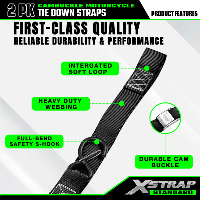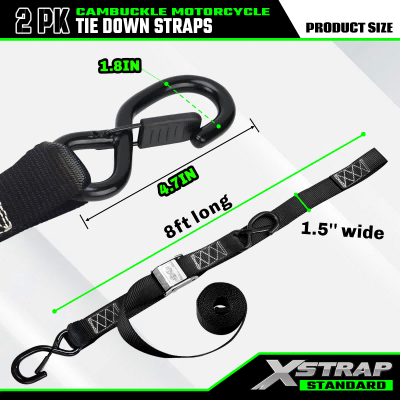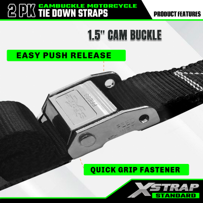 Jedná sa o Xstrap 2pk Cam prackové popruhy s bezpečnostnými háčikmi. Bezpečné pracovné zaťaženie je 733 lb, medza pevnosti je 2200 lb. Zvyčajne sa používajú na zabezpečenie motocyklov, kajakov atď.