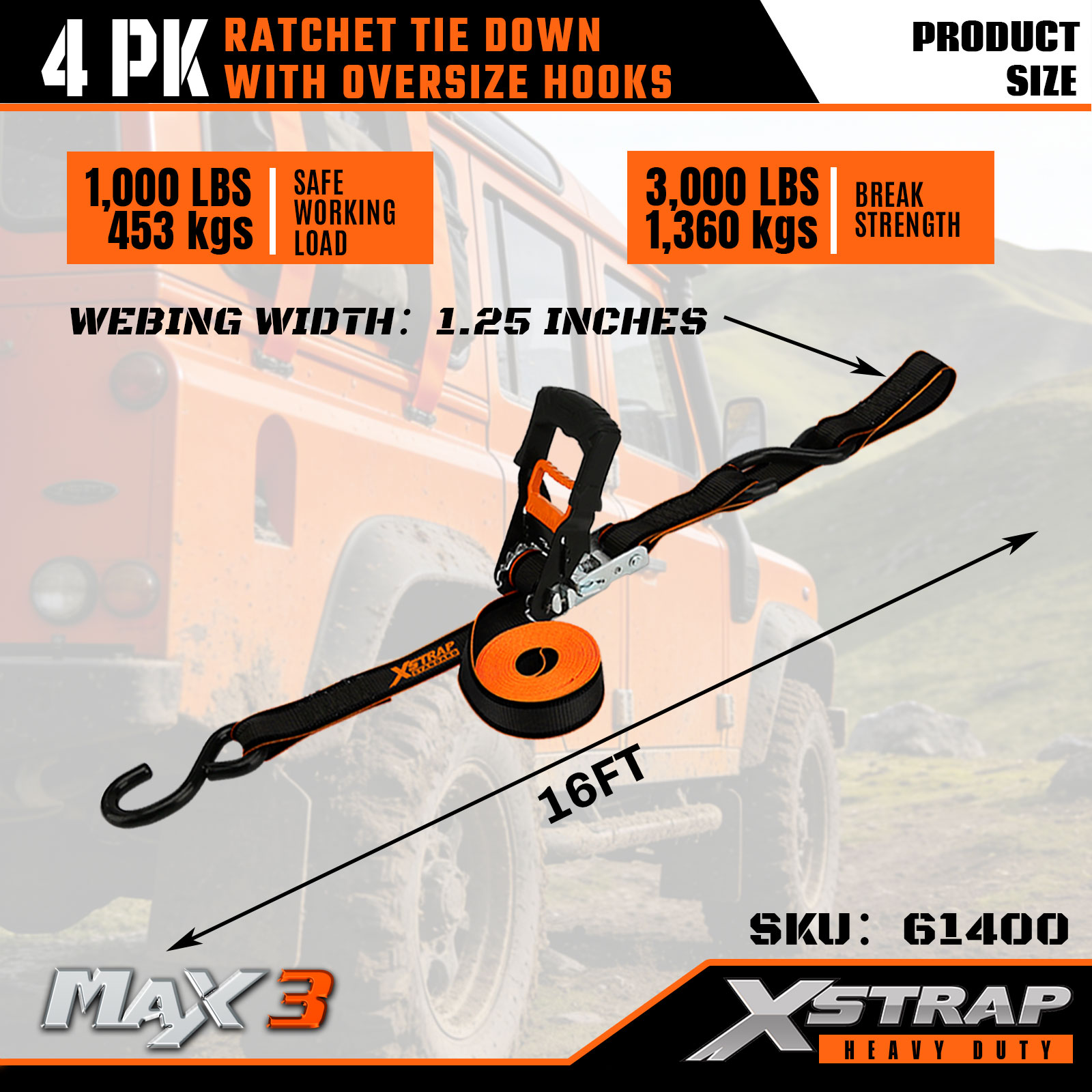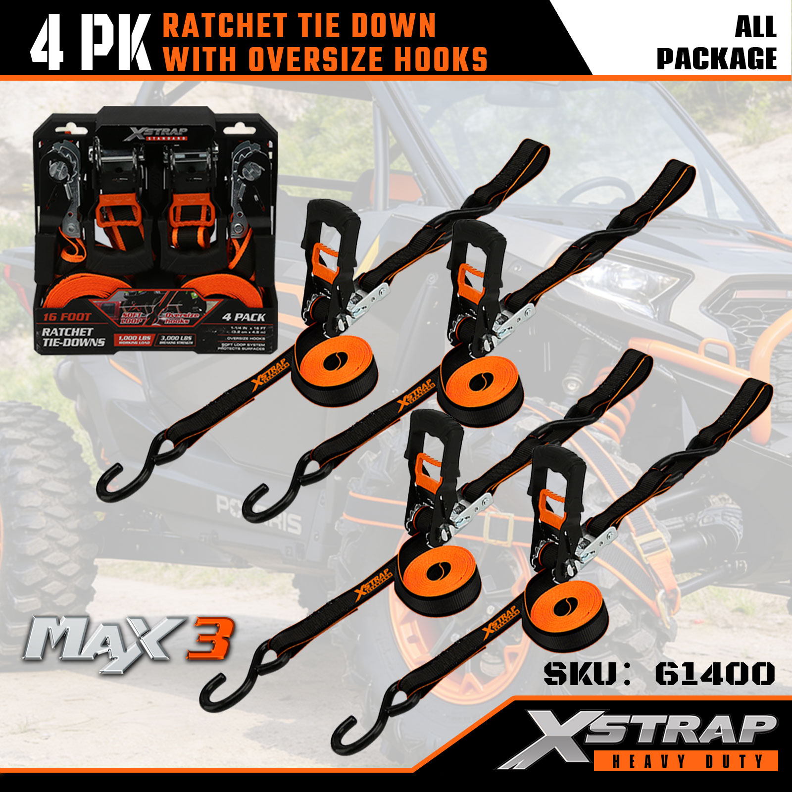 Xstrap 4 Pack Ratchet Tie Down, 1-1/4” x 16' Polyesterový upínací popruh Sťahovací račňový popruh, Kapacita 1000 libier na upevnenie nákladu popruhy s dvojitými J háčikmi pre pick-up, SUV, automobilové nosiče, motocykle, ľahký rybársky snežný skúter, vodný skúter, skúter.