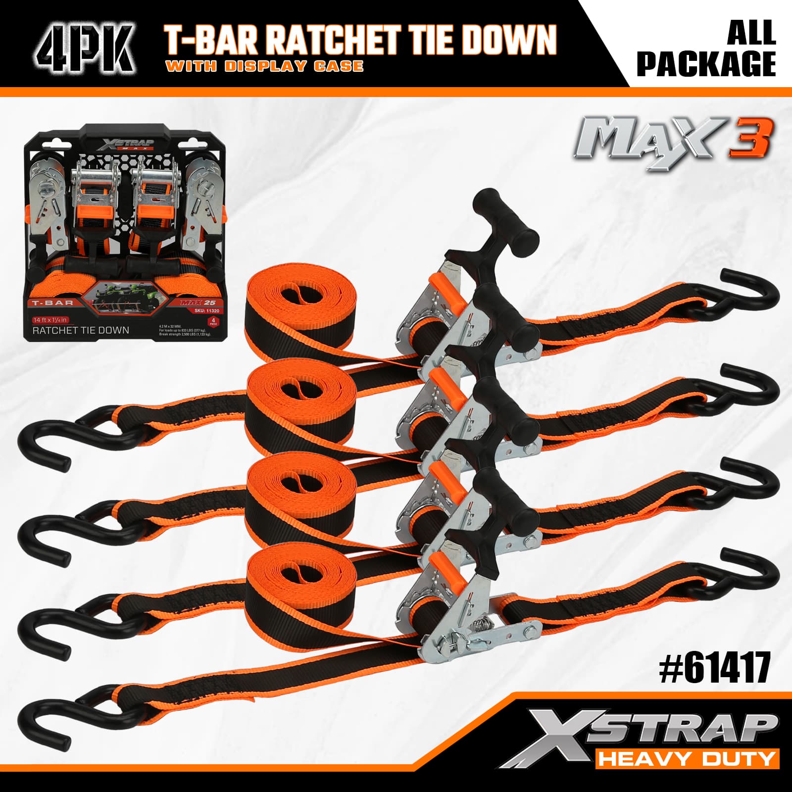 Xstrap 4 Pack T-Max Grip Ratchet Tie Down, 1-1/4 ” x 14' Polyesterový upínací popruh Sťahovací račňový popruh s kapacitou 1 000 libier na upevnenie nákladu s háčikmi S pre pick-up, SUV, Car Top Racks Motocykel, Ľahký rybársky čln, Snežný skúter, Traktor.