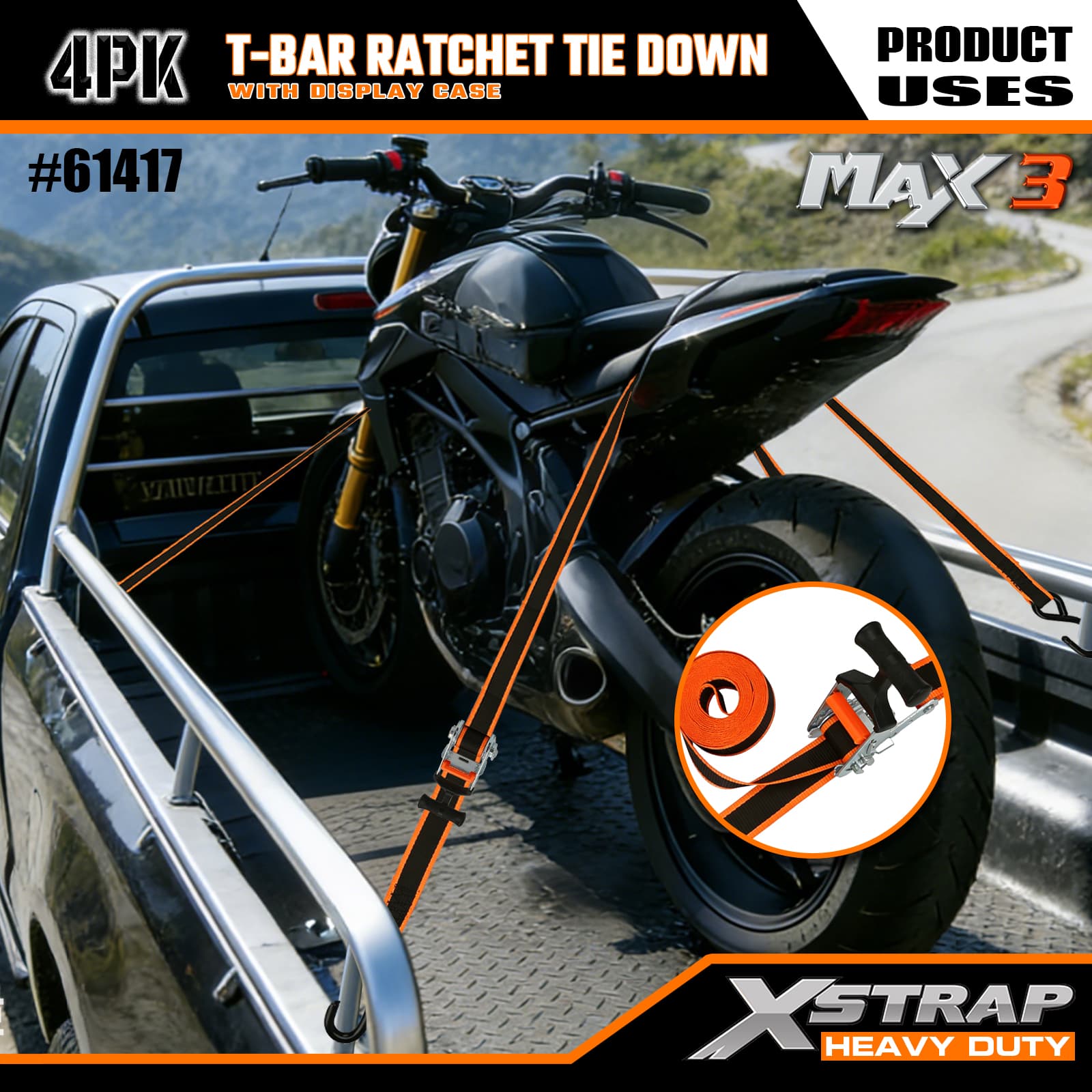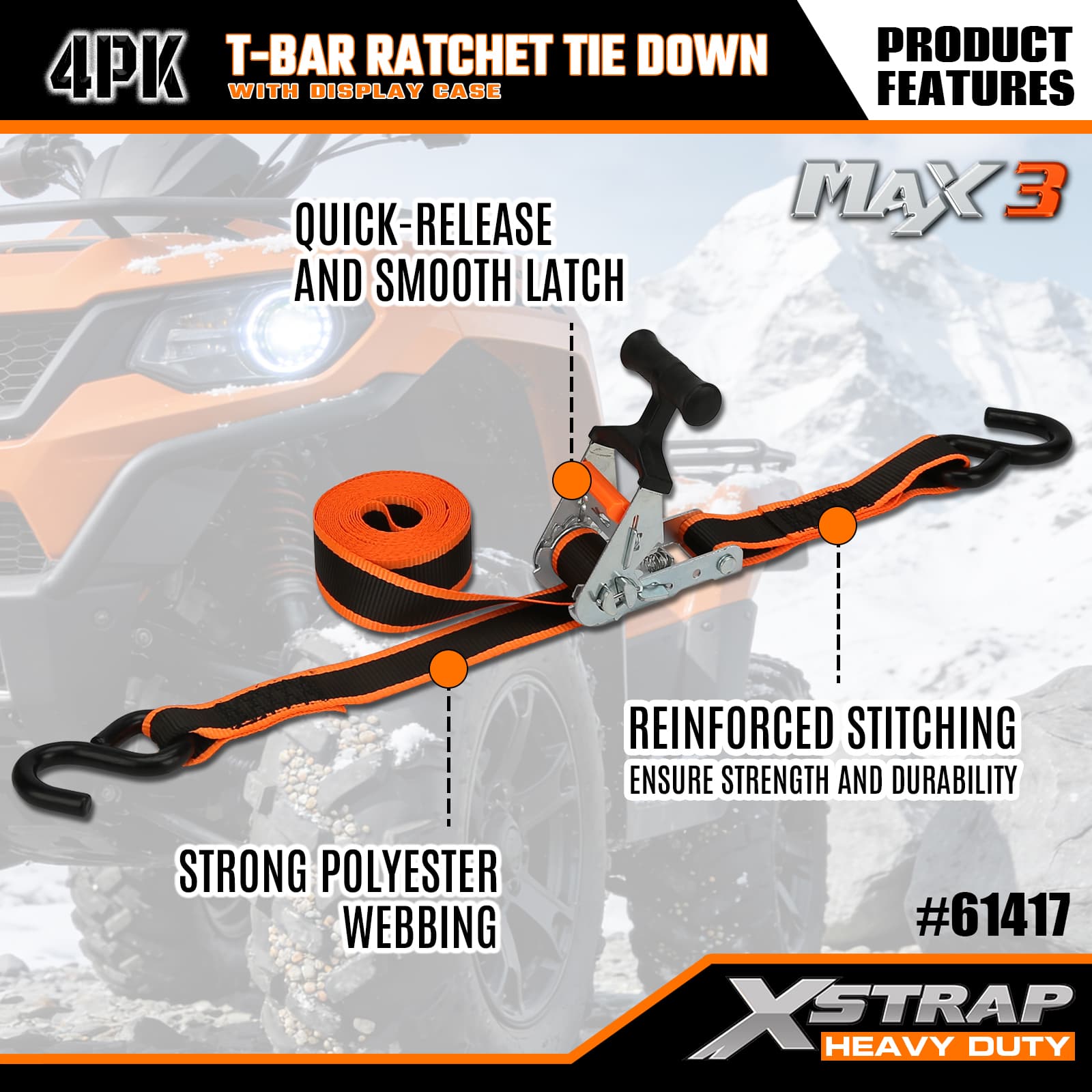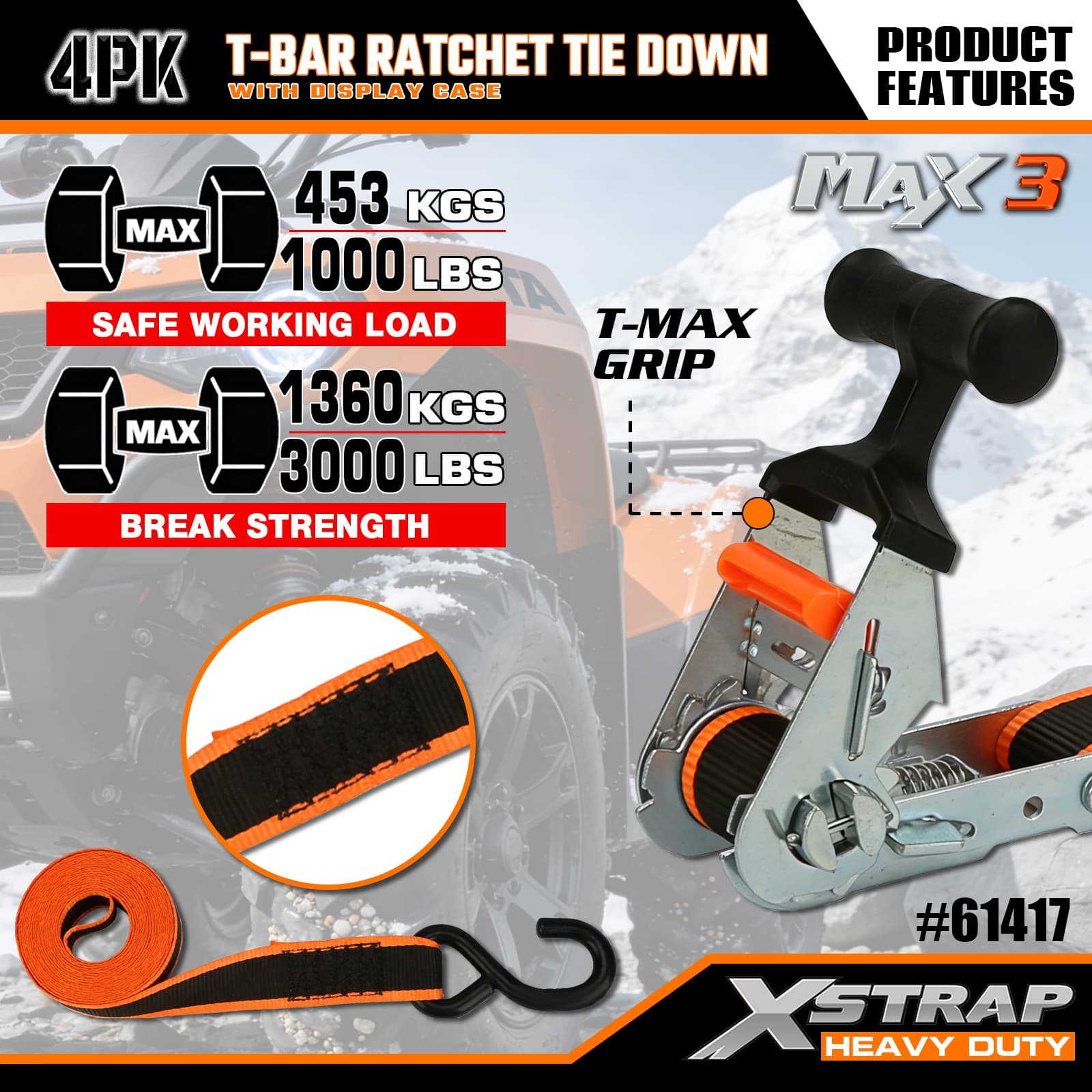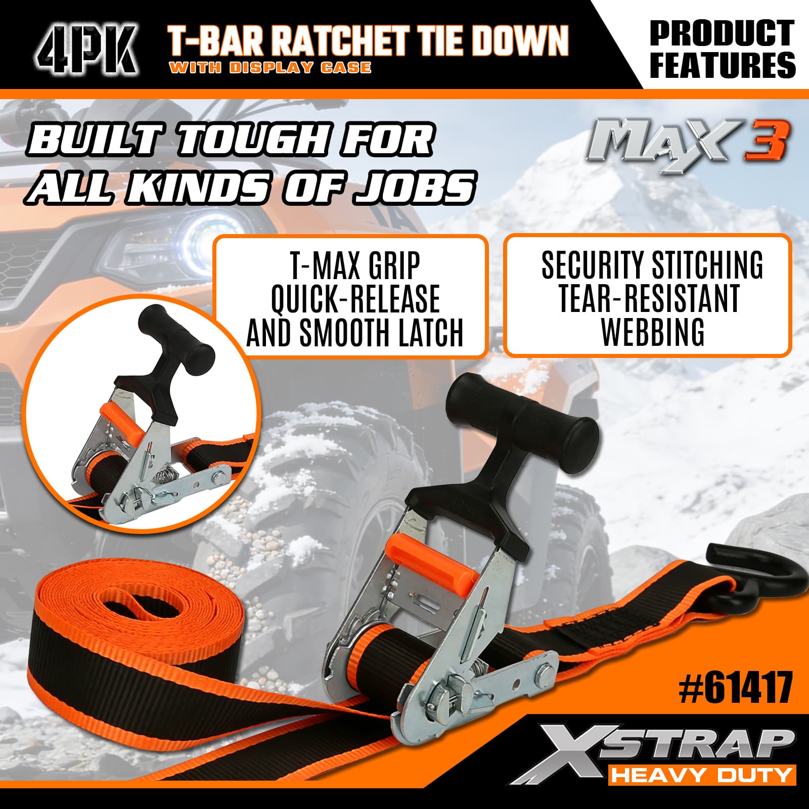 - Račňový mechanizmus T-Bar Max Grip: Obsahuje ergonomickú rukoväť T-bar, ktorá poskytuje vylepšený pákový efekt pre hladké napínanie s nízkou námahou – intuitívne ovládanie, takže používatelia akejkoľvek úrovne zručností môžu rýchlo zaistiť náklad.