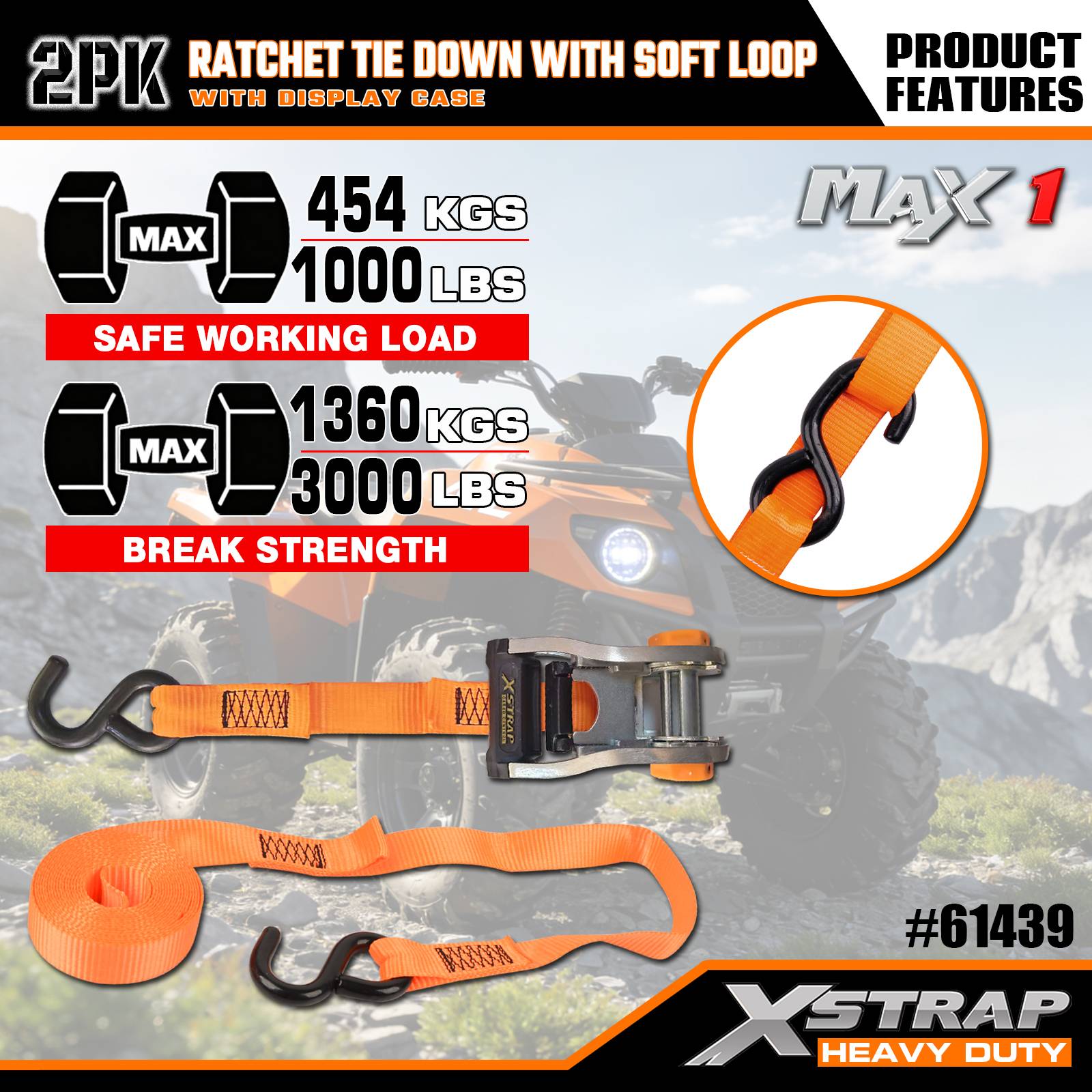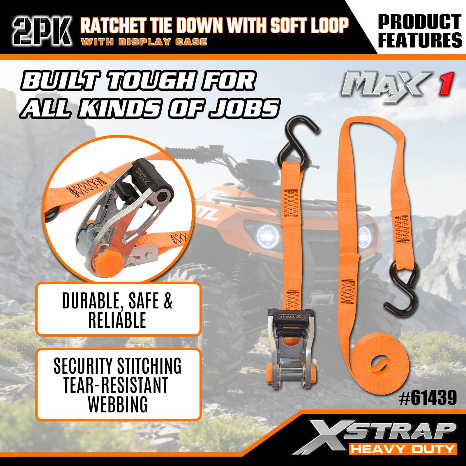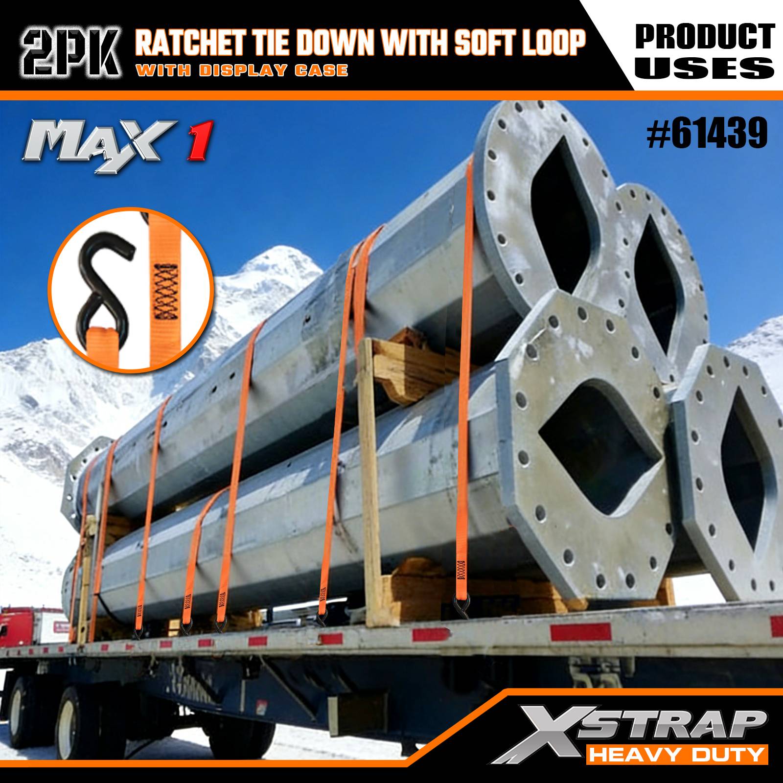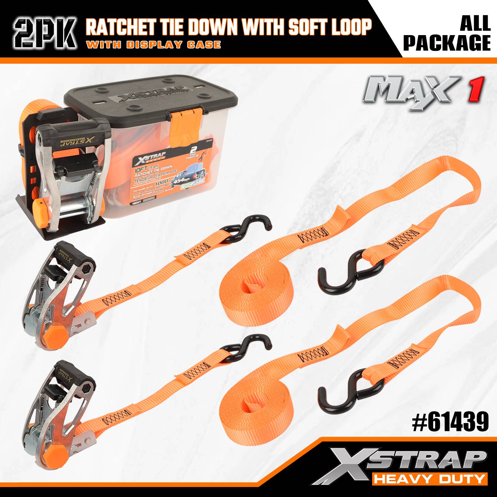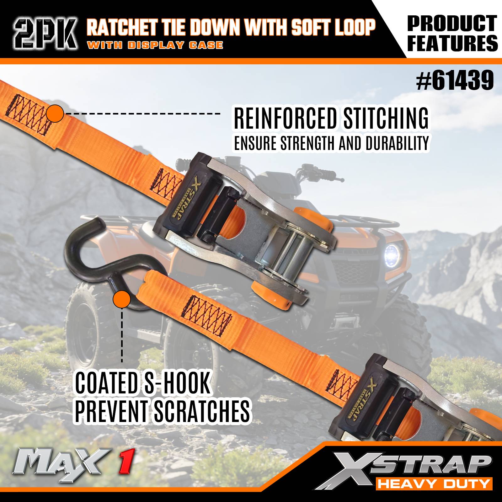 Xstrap 2 Pack Ratchet Uväzovacia s mäkkou slučkou, 1-1/16” x 10' Polyesterový upínací popruh Sťahovací račňový popruh, 1000 lbs kapacitné popruhy na upevnenie nákladu s hákmi S pre nákladné autá, SUV, motocykle s horným nosičom.