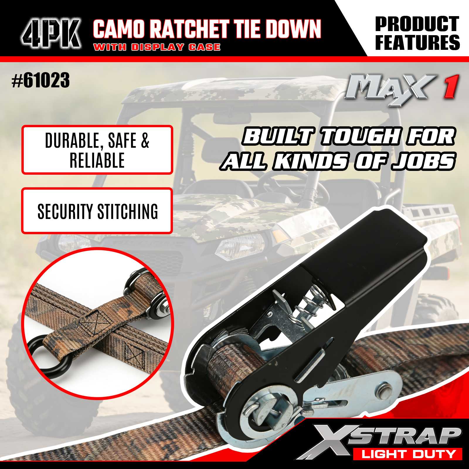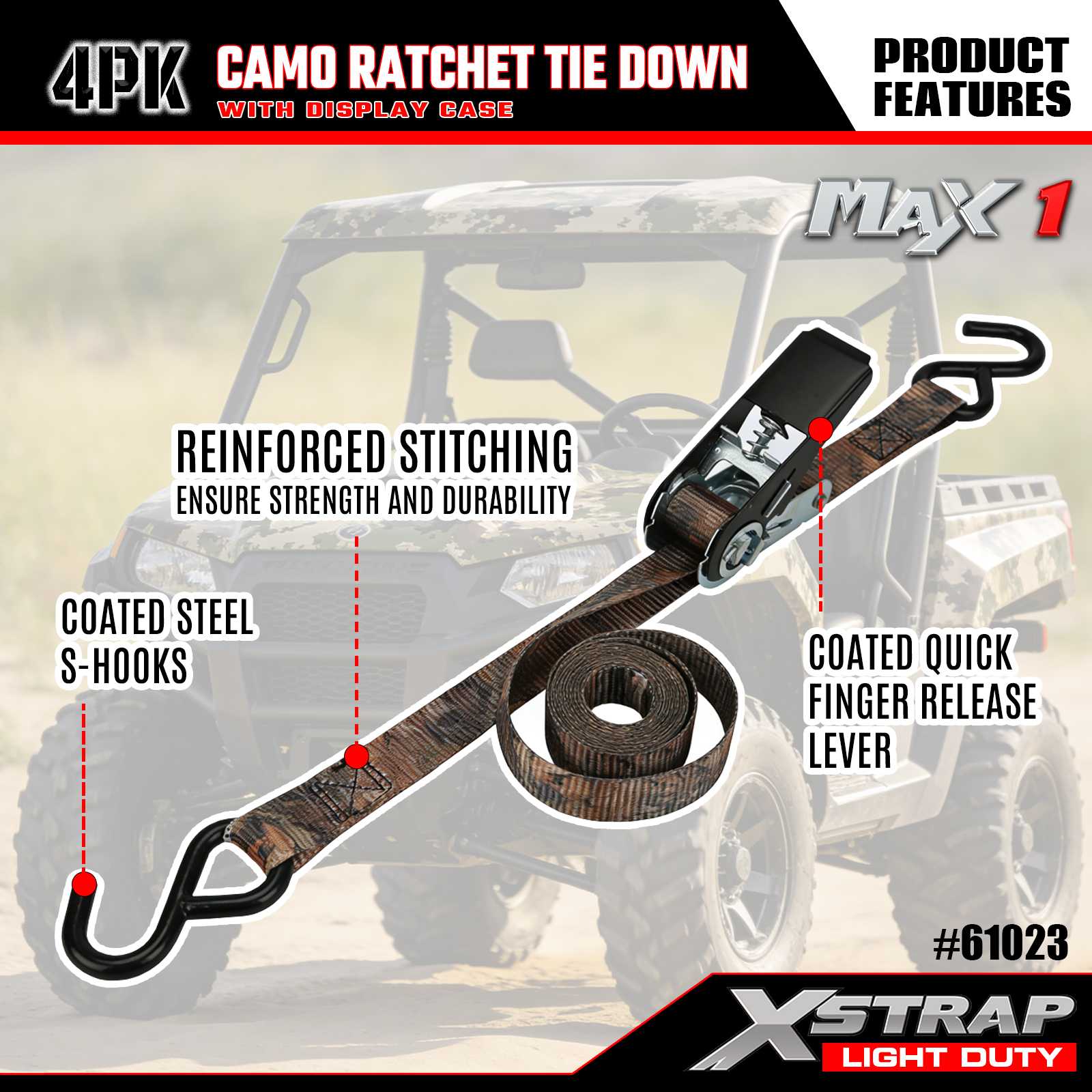 Uväzovacie popruhy Xstrap 4PK CAMO s račňou majú rozmer 1 x 10 stôp, bezpečné pracovné zaťaženie je 300 libier a pevnosť v pretrhnutí je 900 libier.
