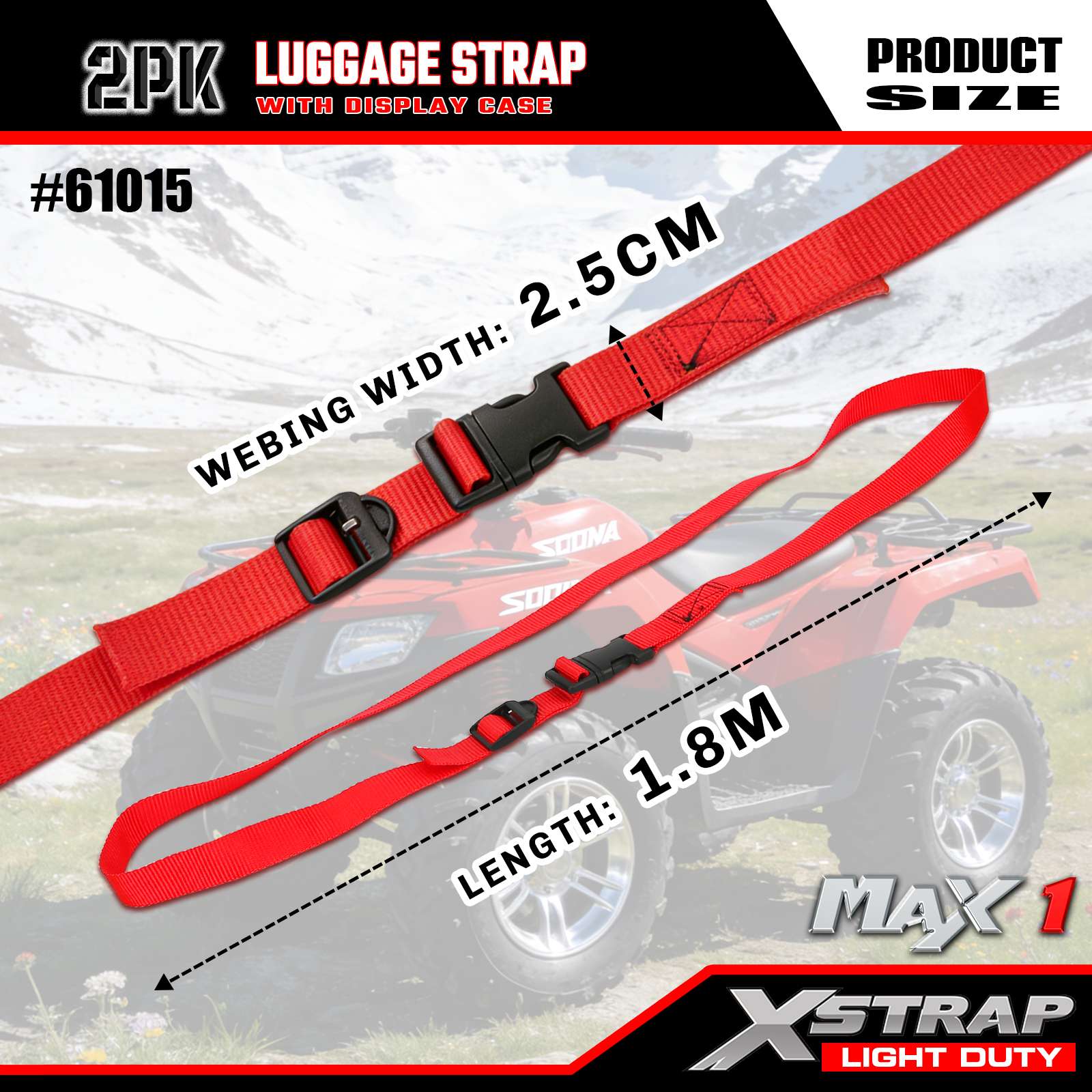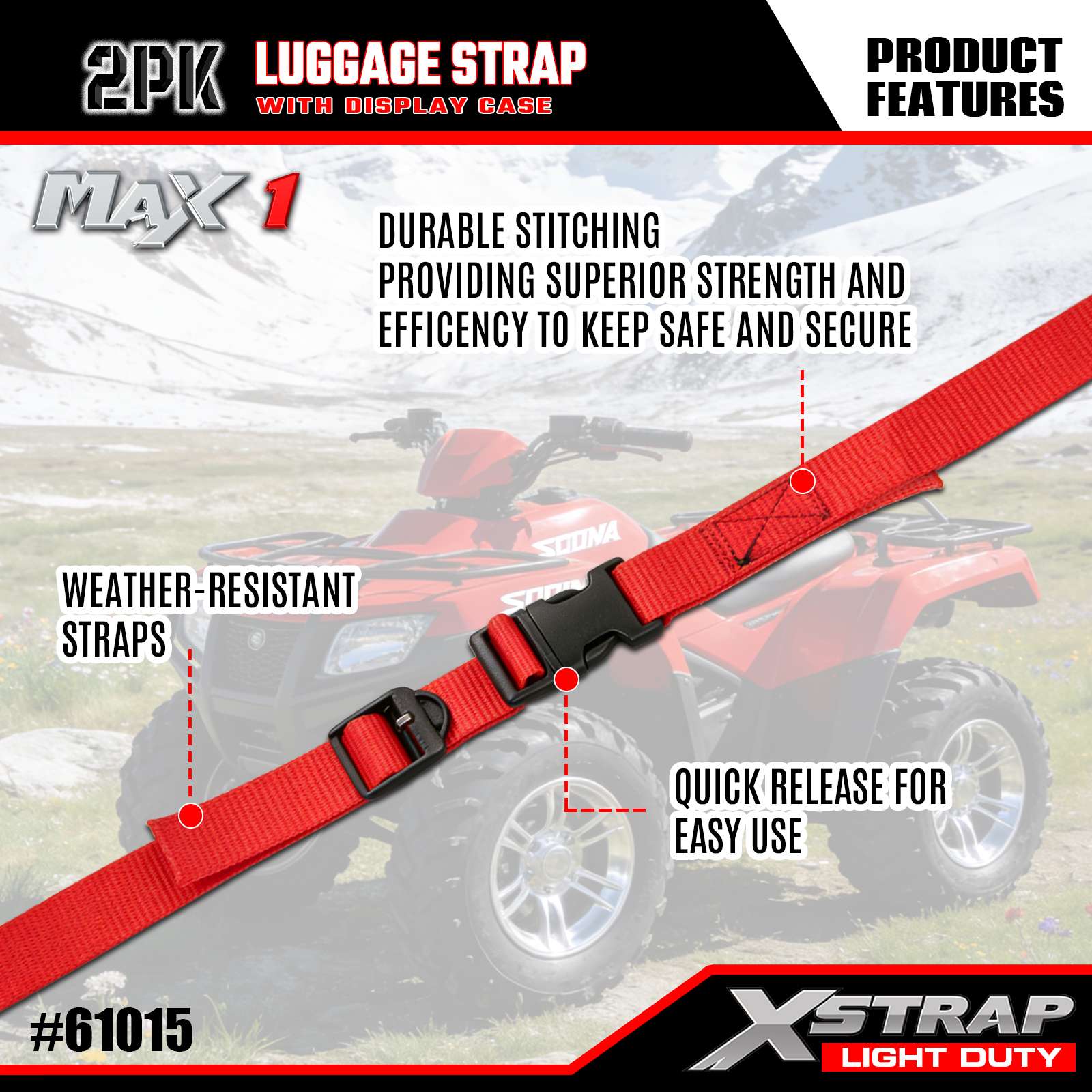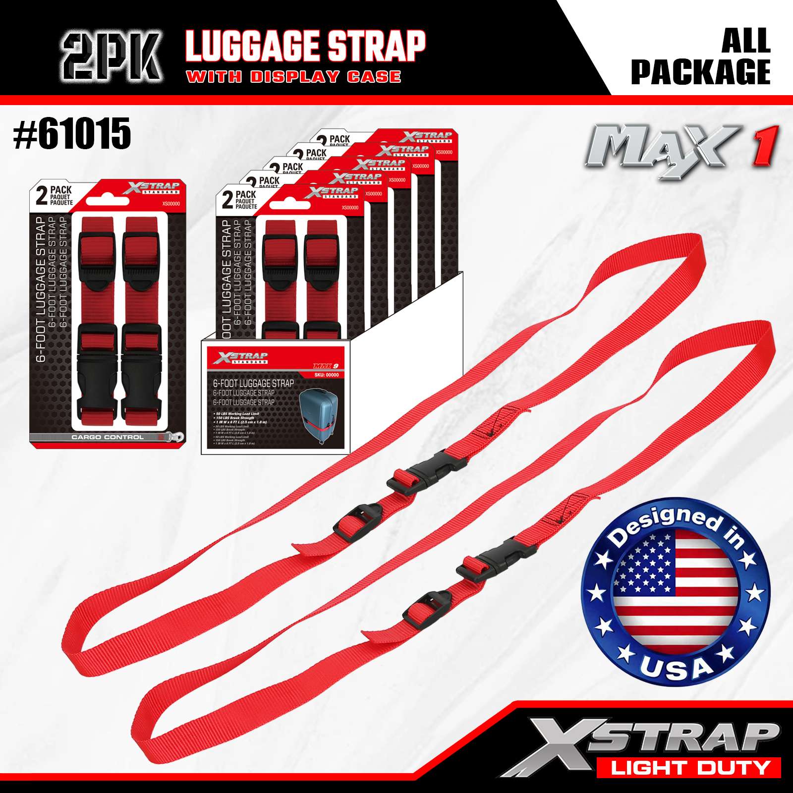 Xstrap 2 Pack Nastaviteľné popruhy na batožinu, 1” x 6’ – 50 Lbs Nosnosť – 150 Lbs Pevnostné popruhy pre kufre, ľahko identifikovateľný konektor cestovného pásu Drží kufor pohromade, predlžuje životnosť tašky, popruh spája dve tašky, červená